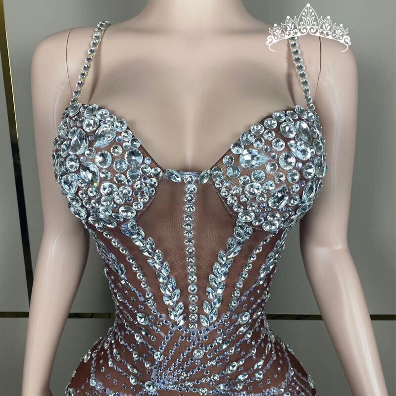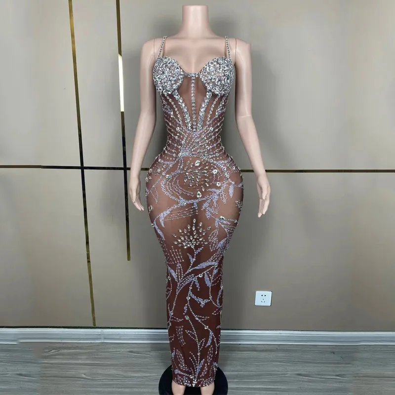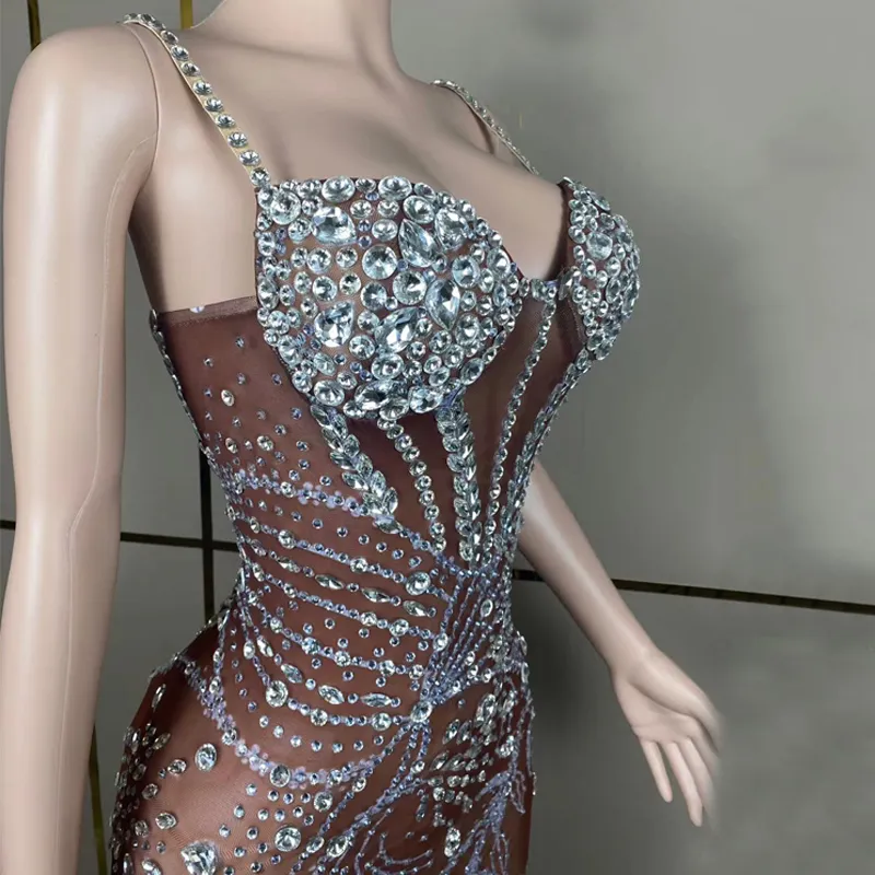 Women Birthday Celebrate Costume Party Evening Dresses Stage Festival Outfit Sexy Perspective Rhinestones Long Dress