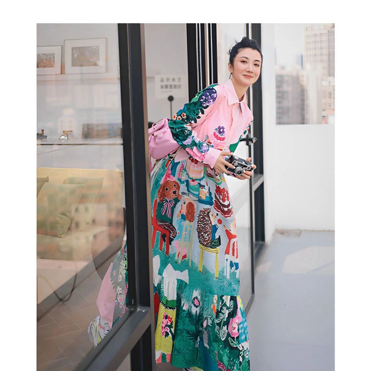 Make a fashion statement with this Women's Casual Midi Shirt Dress featuring a unique Cartoon Print design. With long sleeves and a comfortable midi length, this dress combines style and comfort effortlessly. The Cartoon Print adds a fun and trendy touch, perfect for a casual streetwear look. Available in large sizes, this dress is both fashionable and versatile, making it a perfect choice for those who want to express their style with a touch of fun and flair.