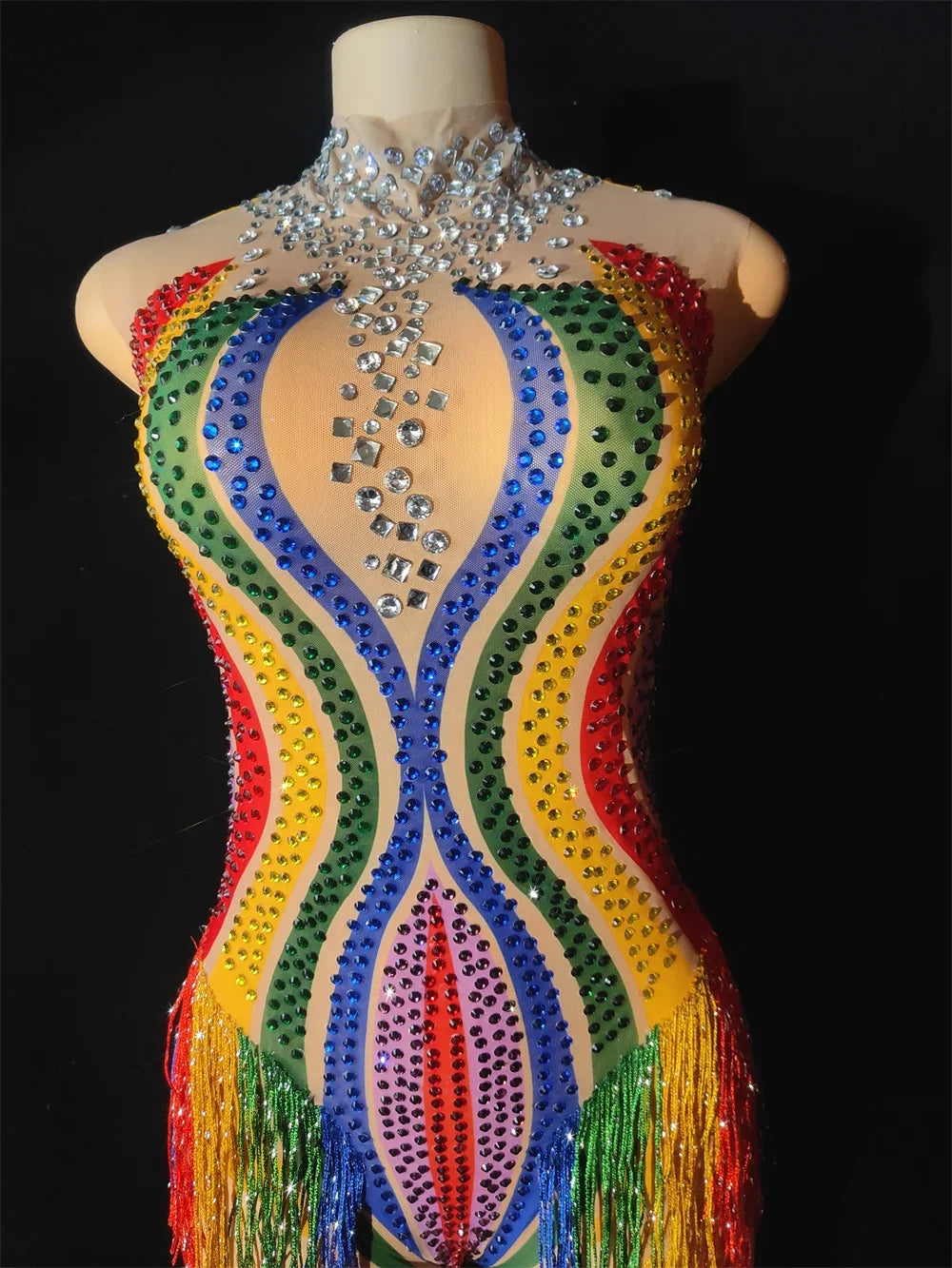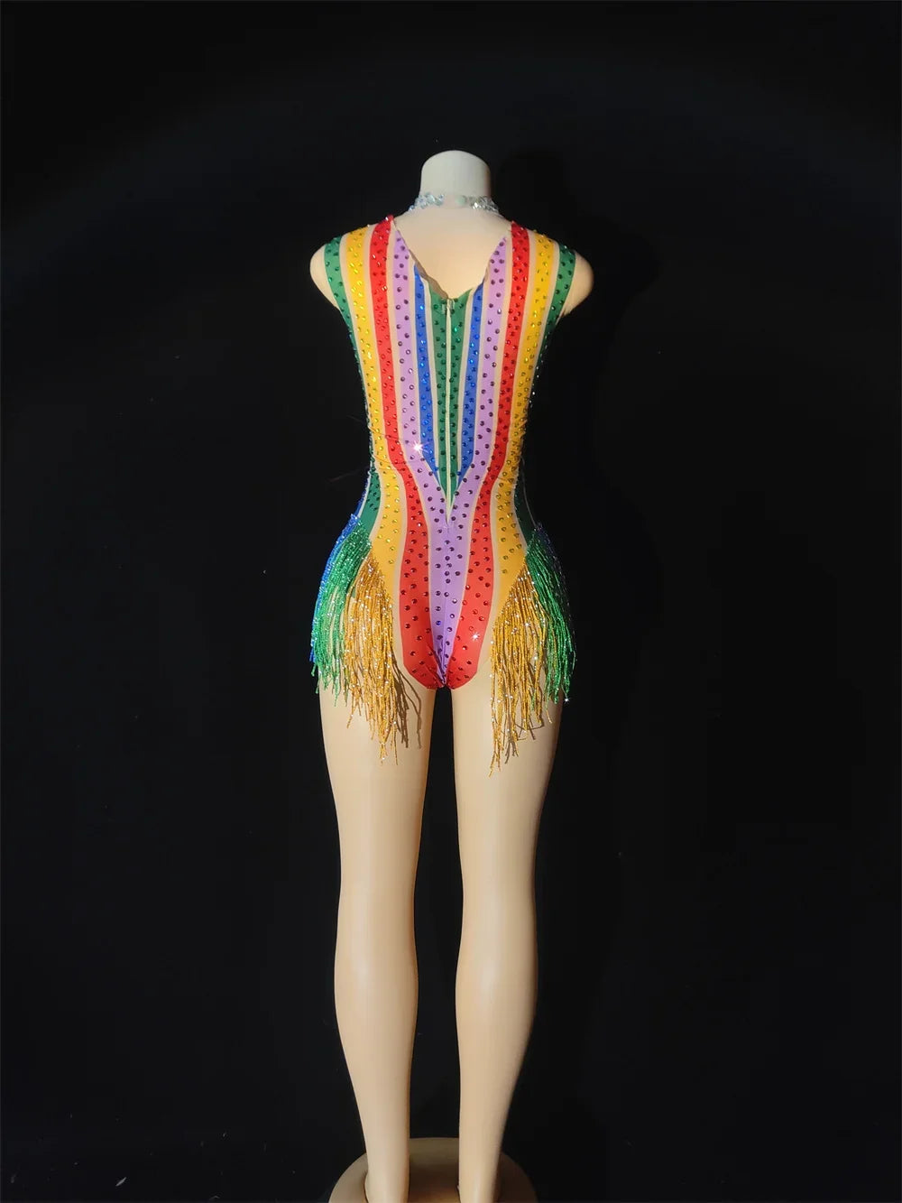 Women Colorful Rainbow Tassel Mesh Leotard Rhinestones Perspective Fringes Bodysuit Stage Outfit Wear Performance Dance Costume