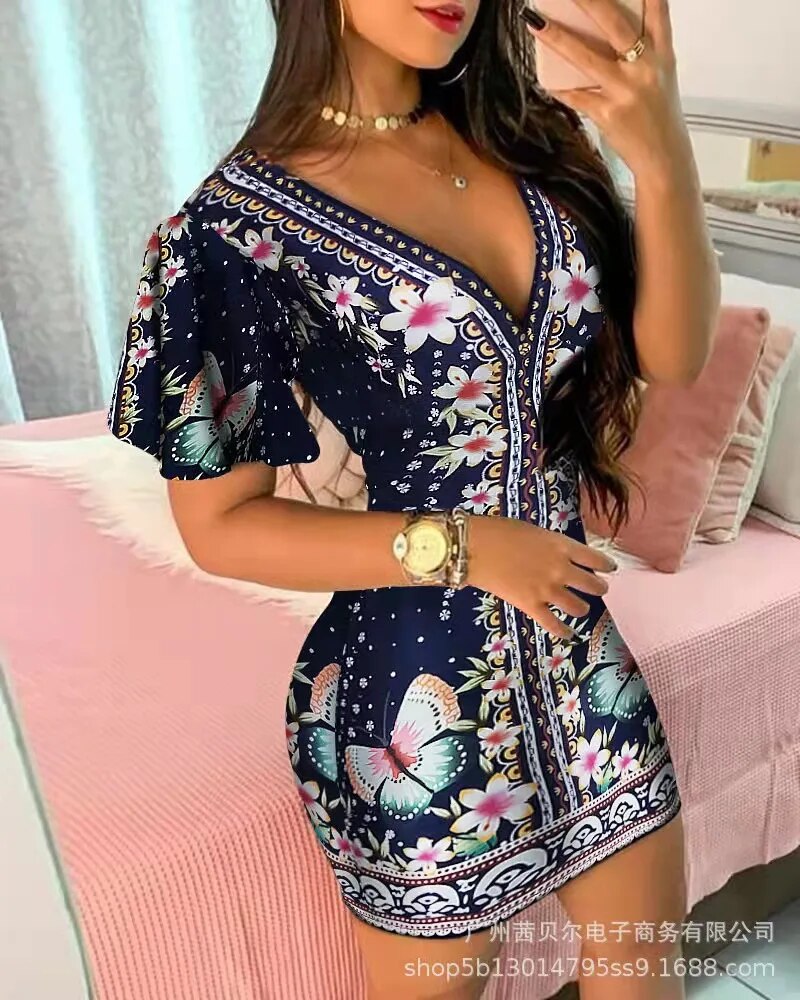 Women Elegant Dress Polka dot Print Scarf Print Chain Ruffles Sleeve Floral Print V-neck Bodycon Party Clubwear Dress