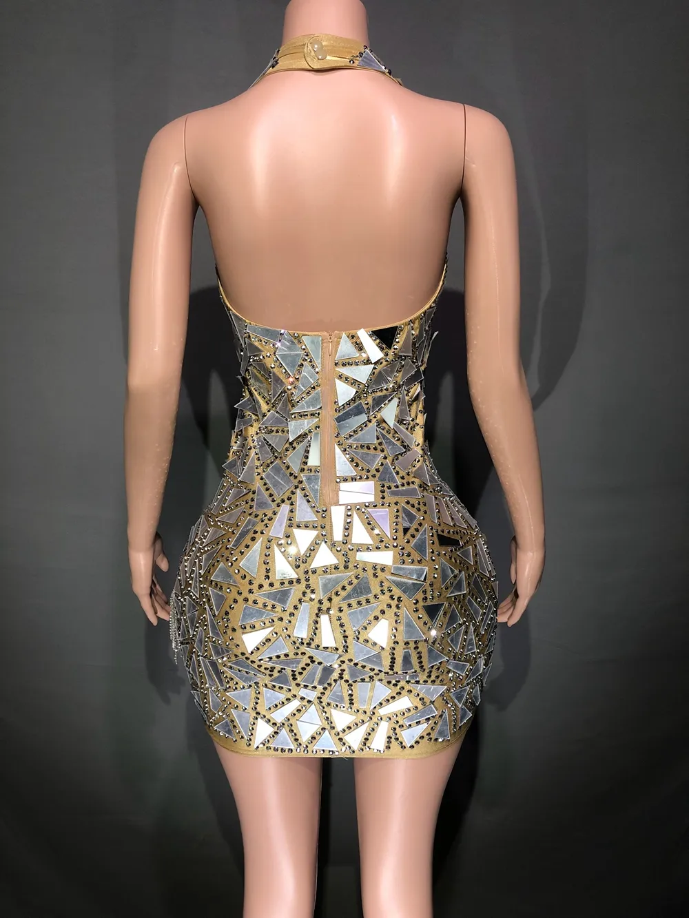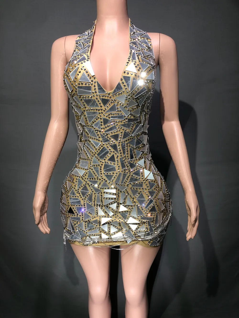 Women Evening Party Prom Birthday Dress Sexy Halter Deep V Neck Backless Rhinestones Birthday Dresses Singer Stage Show