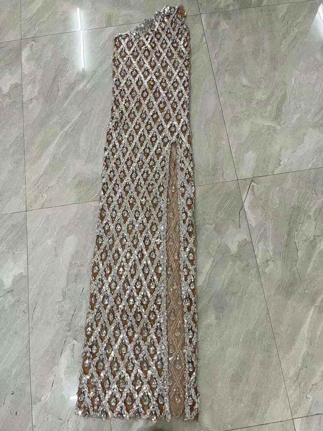 Make a breathtaking entrance in this Women Evening Wedding Sparkly Silver Sequins Rhinestones High Split Dress — a glamorous gown designed for brides, bridesmaids, prom-goers, performers, and anyone celebrating a special occasion who wants to shine in photographs and in person. Combining luxe silver sequins with precision-set rhinestones, the dress captures and reflects light with every movement, creating a radiant, camera-ready effect that reads as both sophisticated and show-stopping