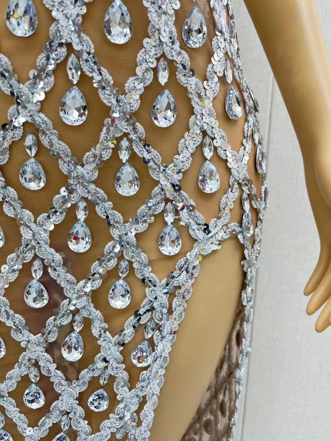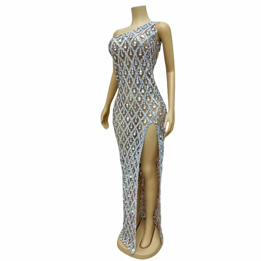 Women Evening Wedding Sparkly Silver Sequins Rhinestones High Split Dress Elegant Celebrate Prom Gown Birthday Photograph Dress
