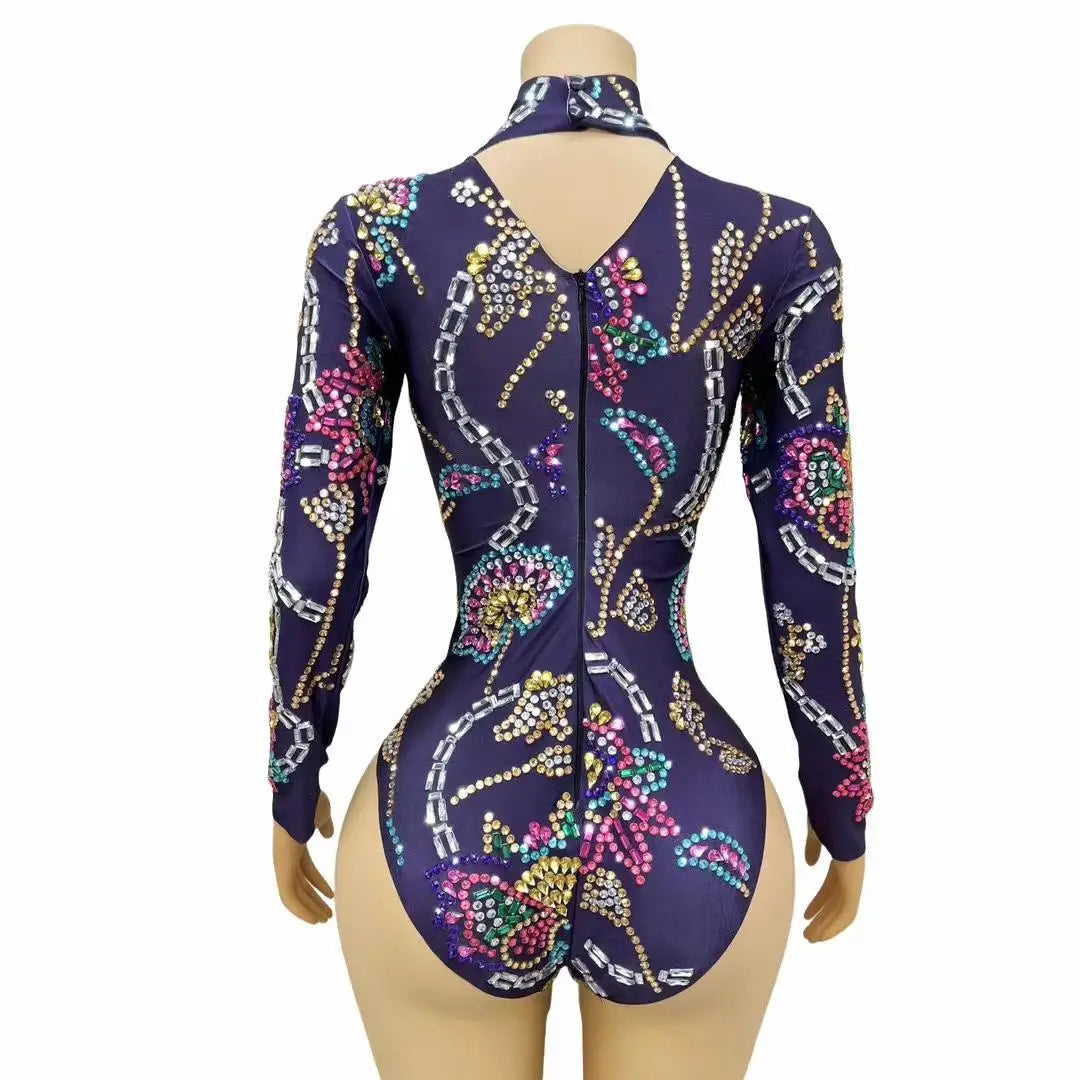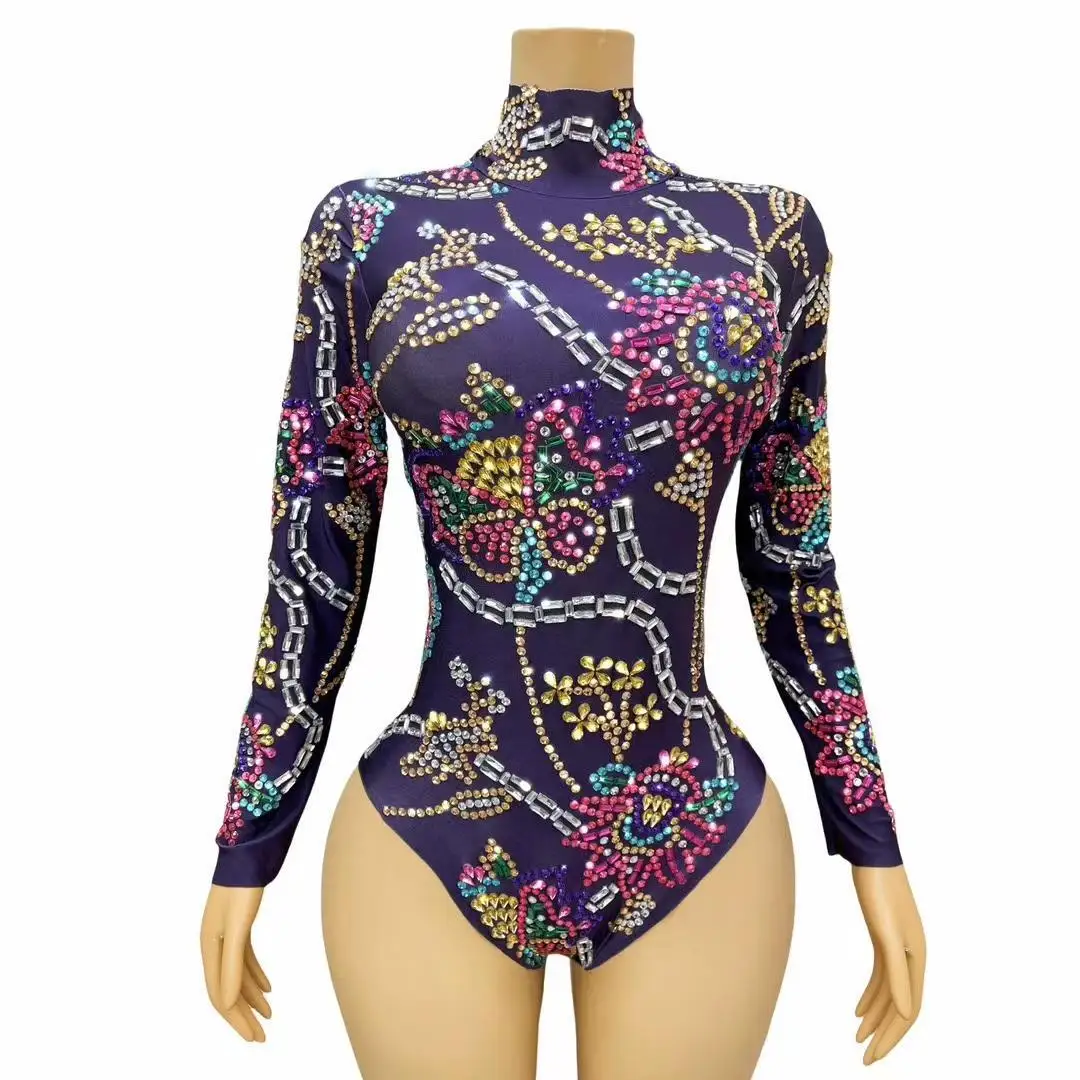 Women Flashing Colorful Rhinestones Purple Leotard Luxury Celebrate Sexy Outfit Long Sleeves Bodysuit Birthday Costume Jingu