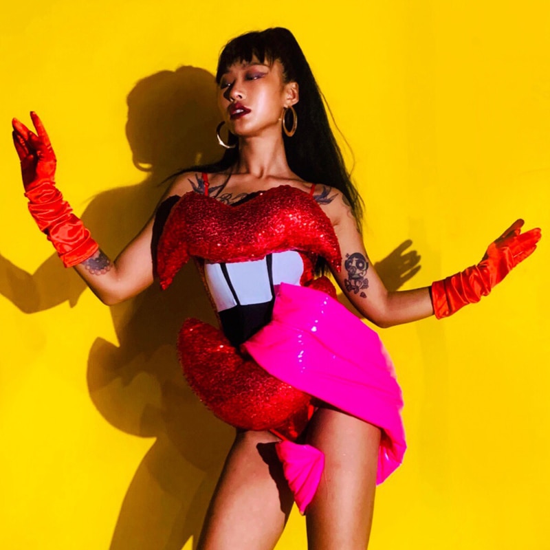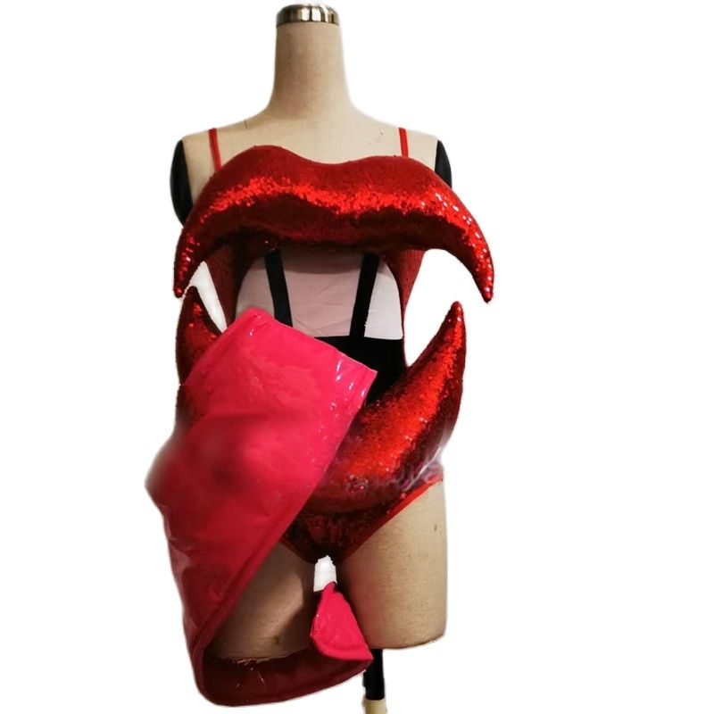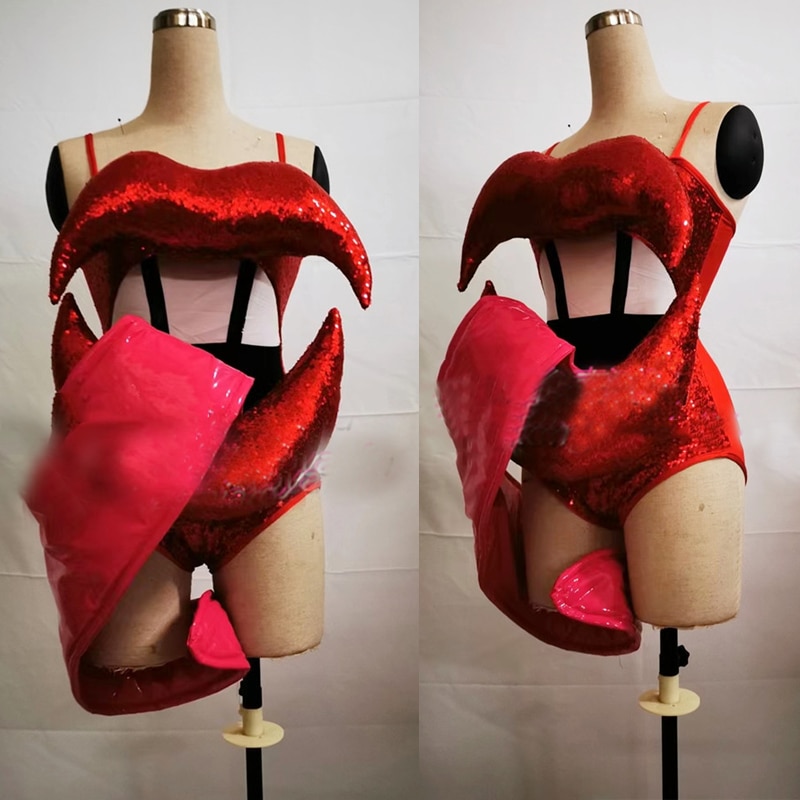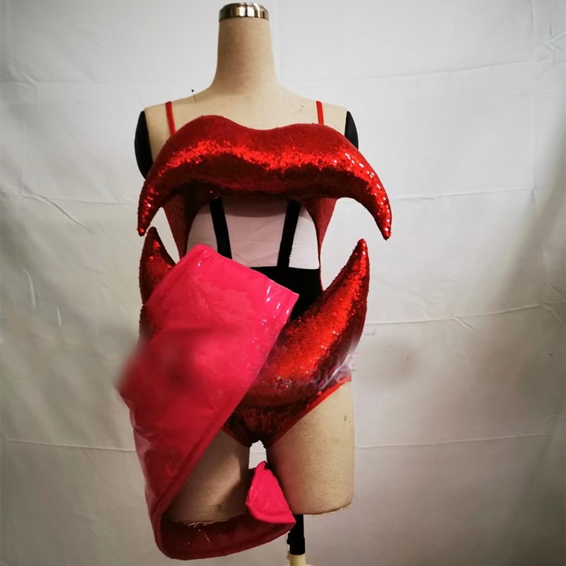 Women Gogo Dance Clothing Big Lip Red Sequins Bodysuit Women Party Outfit Bar Nightclub Dj Ds Stage Pole Dance Costume