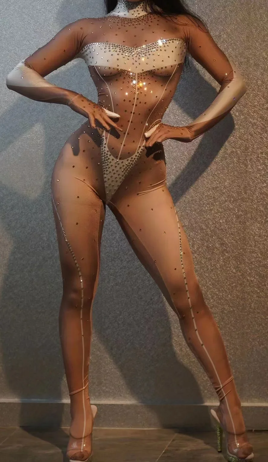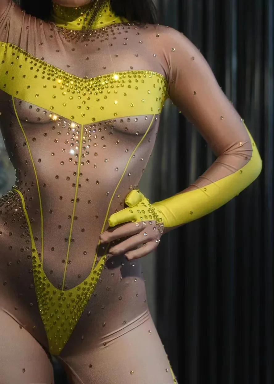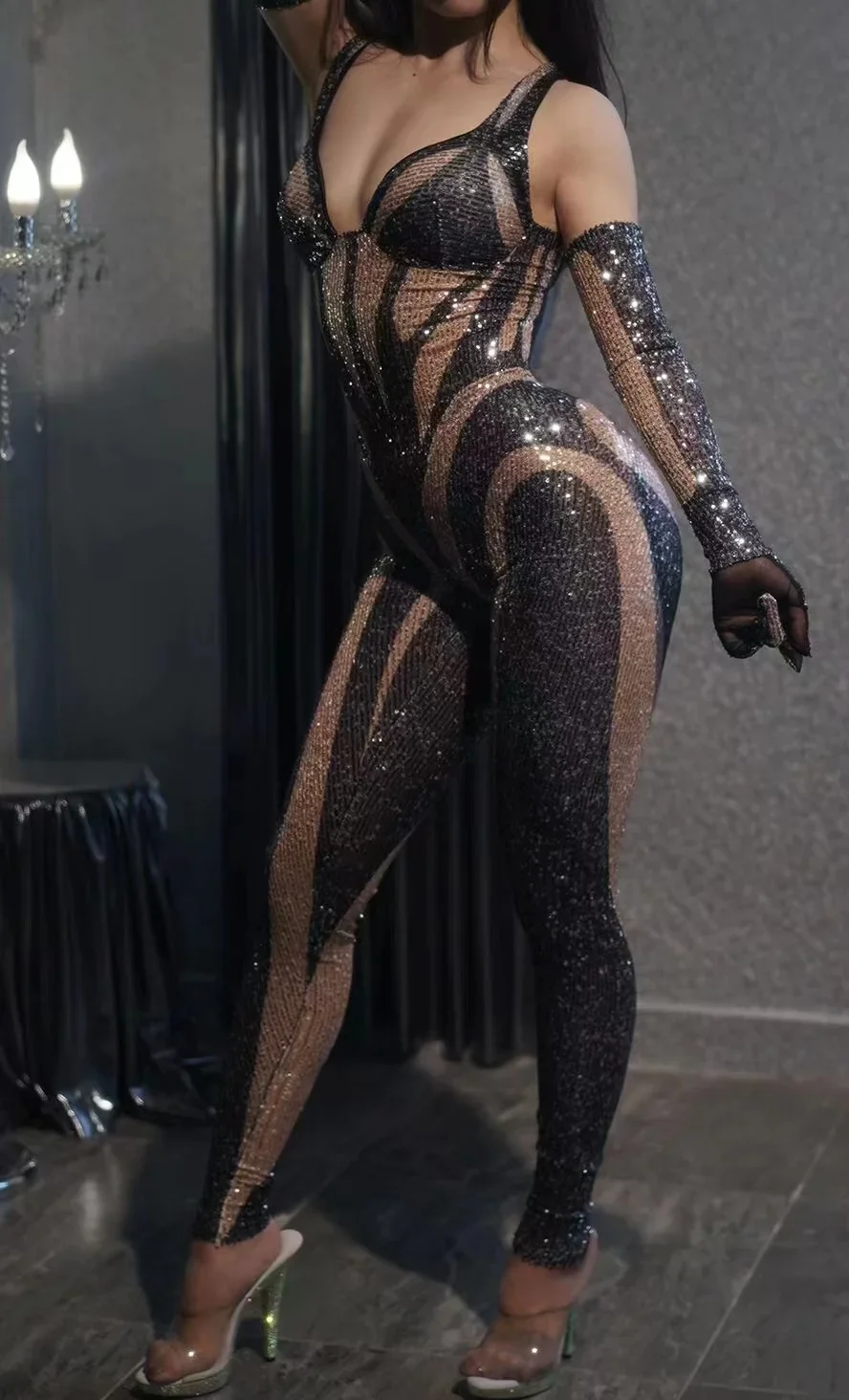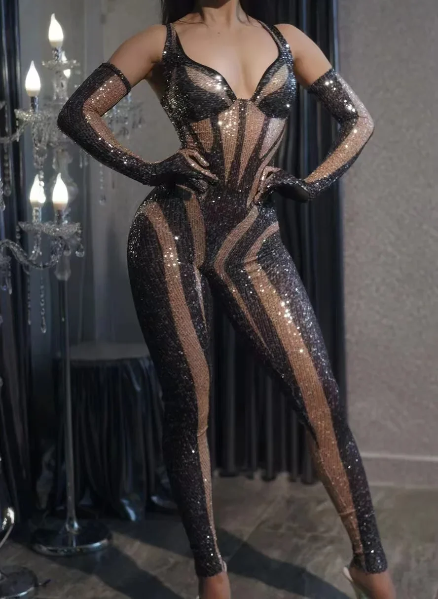 Women Long Jumpsuit Sparkly Rhinestones Sleeve Nightclub Prom Party Outfit Singer DancerPerformance Dance Costume Stage Wear