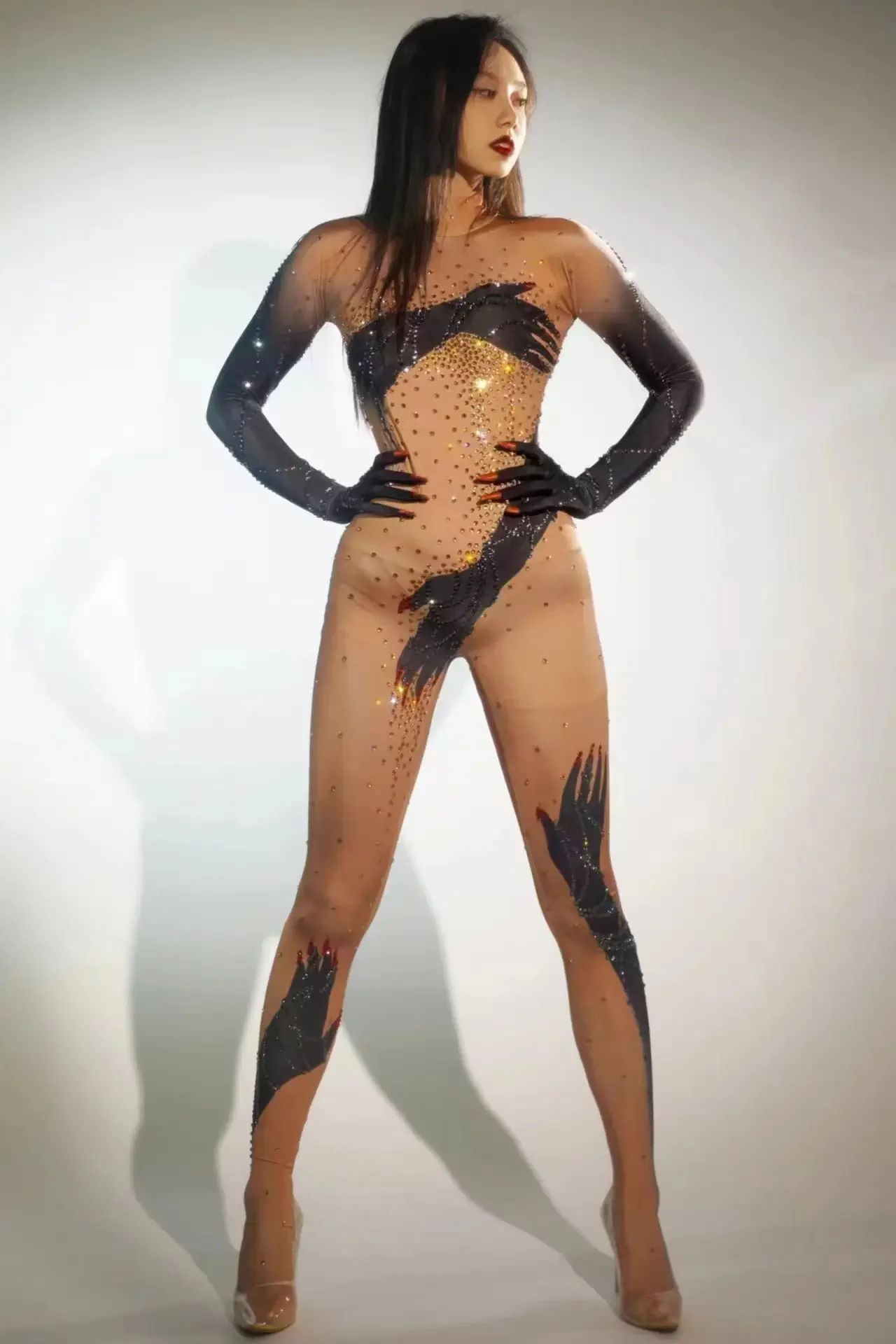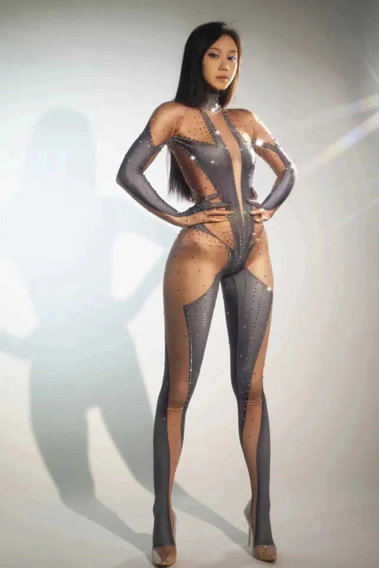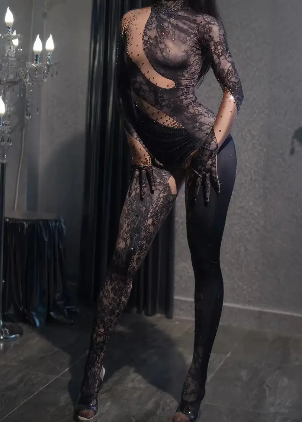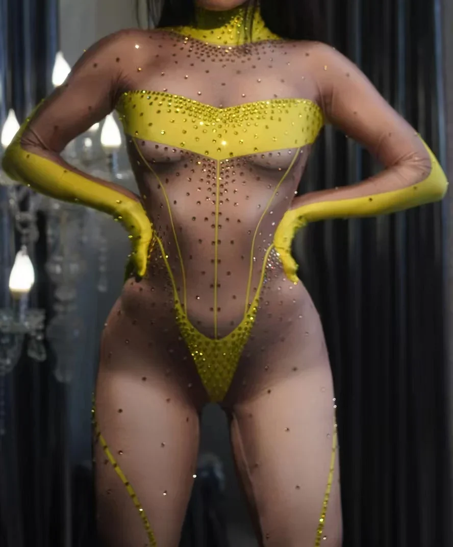 Women Long Jumpsuit Sparkly Rhinestones Sleeve Nightclub Prom Party Outfit Singer DancerPerformance Dance Costume Stage Wear