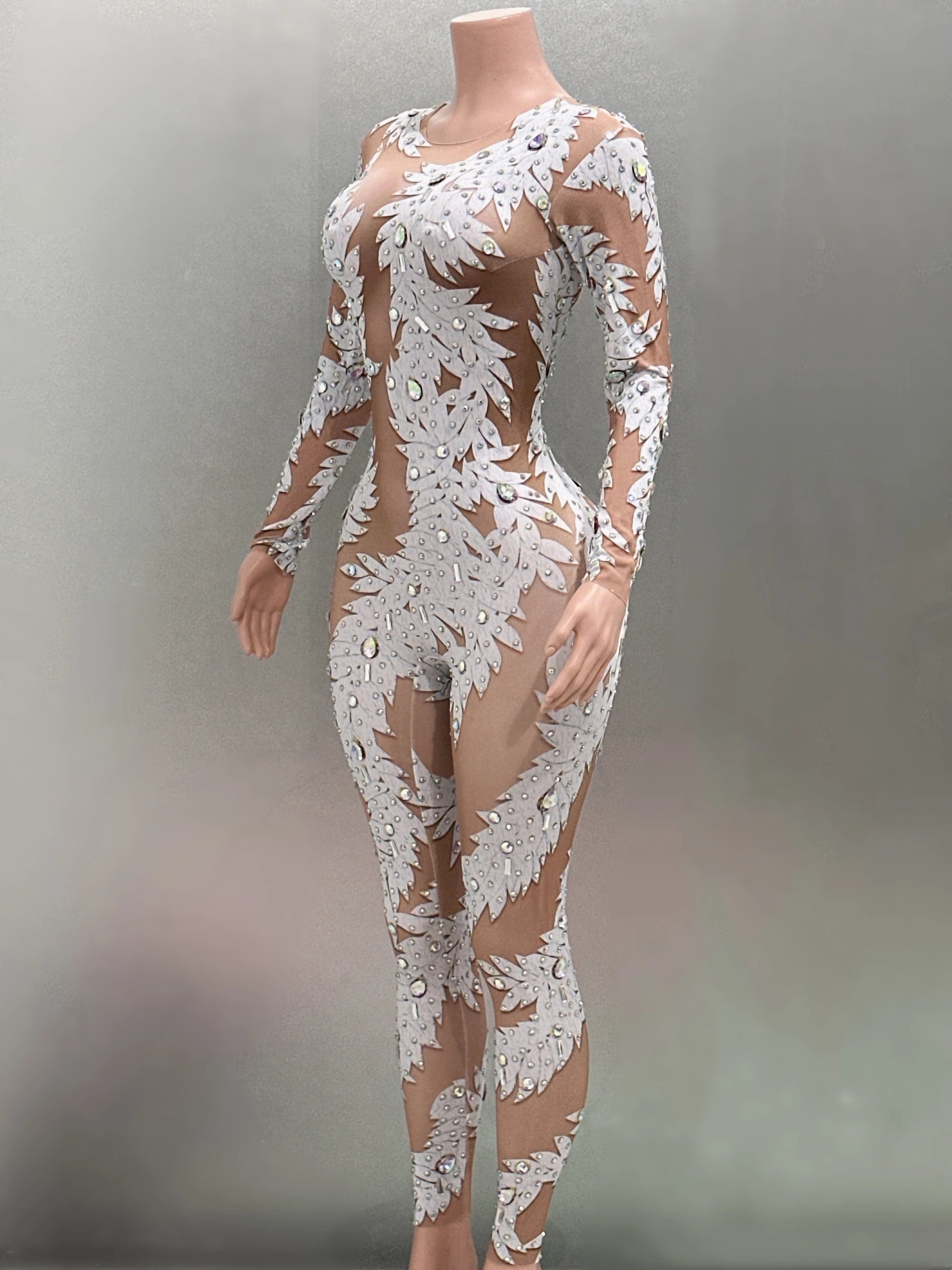 Women Long Sleeve Sexy Crystal High Stretch Bodycon Long Jumpsuit Celebrate Nightclub Party Performance Costume Stage Wear