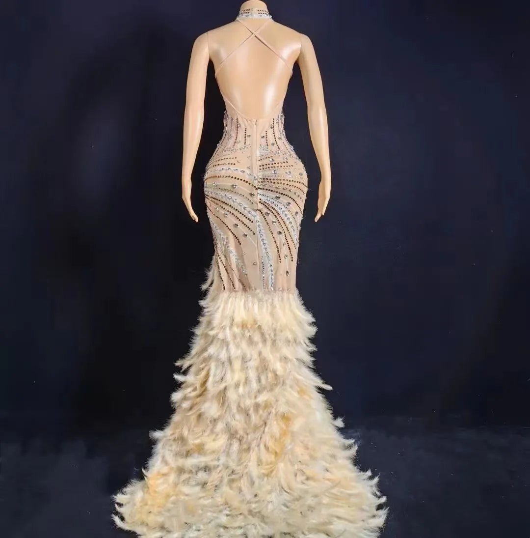 This luxurious women's gown features a halter neckline adorned with sparkly beaded crystals, perfect for cocktail parties, birthdays, and special occasions. The gown also includes feather detailing and is ideal for prom nights and formal events.