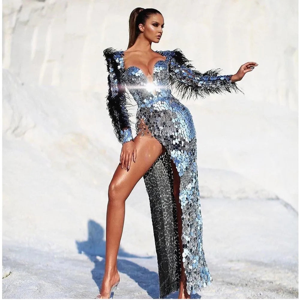 Women Luxury Sexy Long Sleeve Mesh Sequins Glitter Feather Maxi Long Bodycon