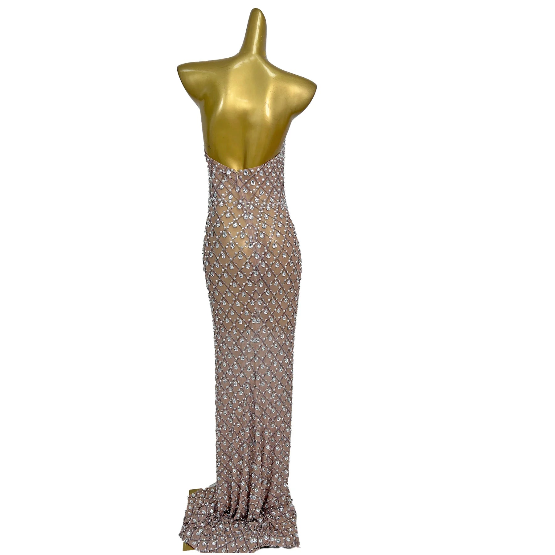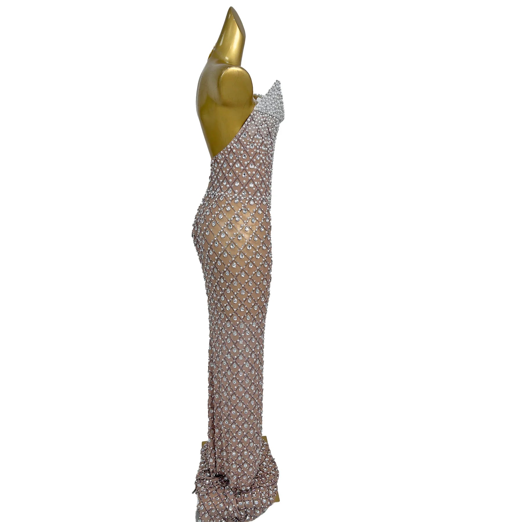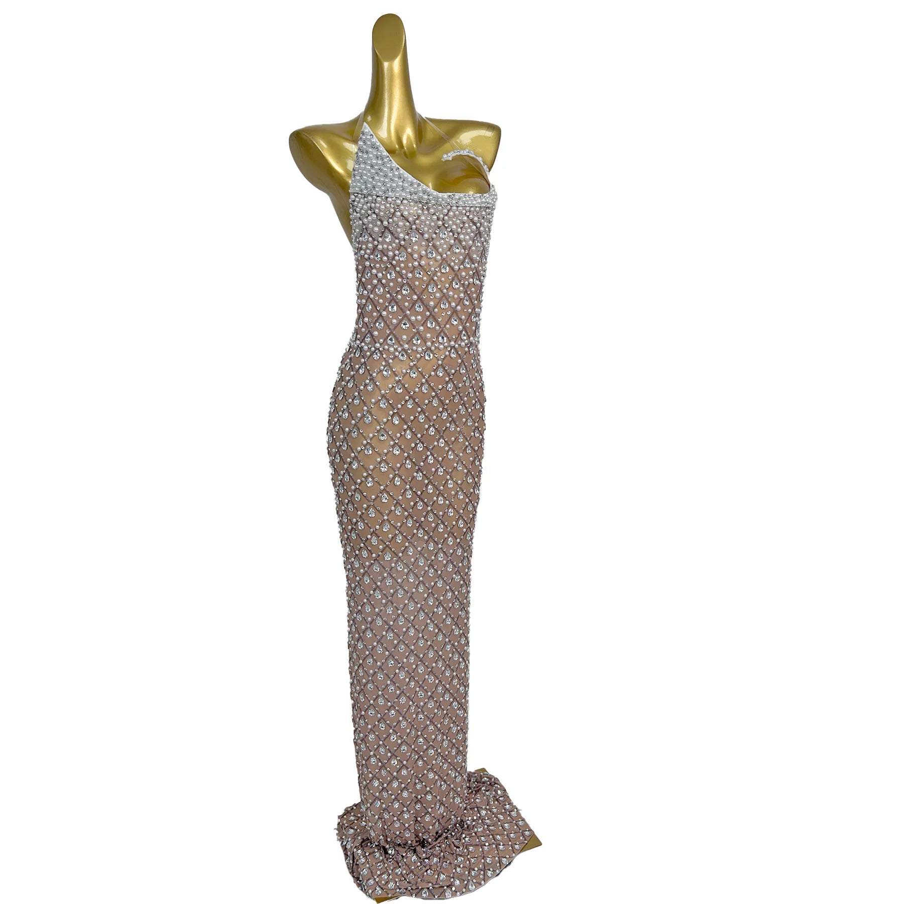 Women Luxury Sparkly Crystals Pearls Evening Gown Club Event Show Birthday Celebrate Elegant Long Dresses Party Outfit