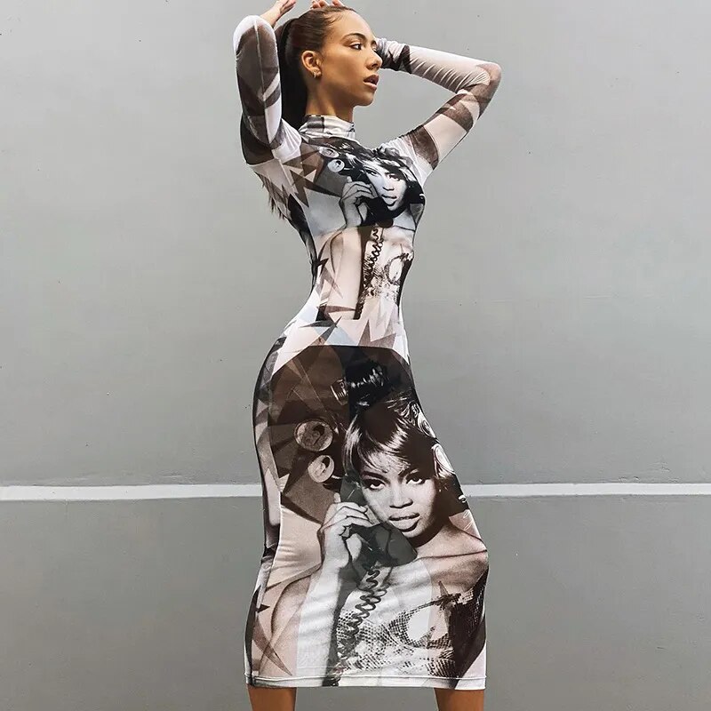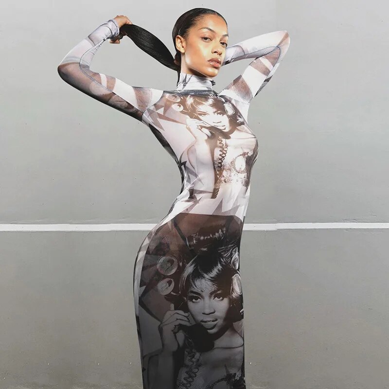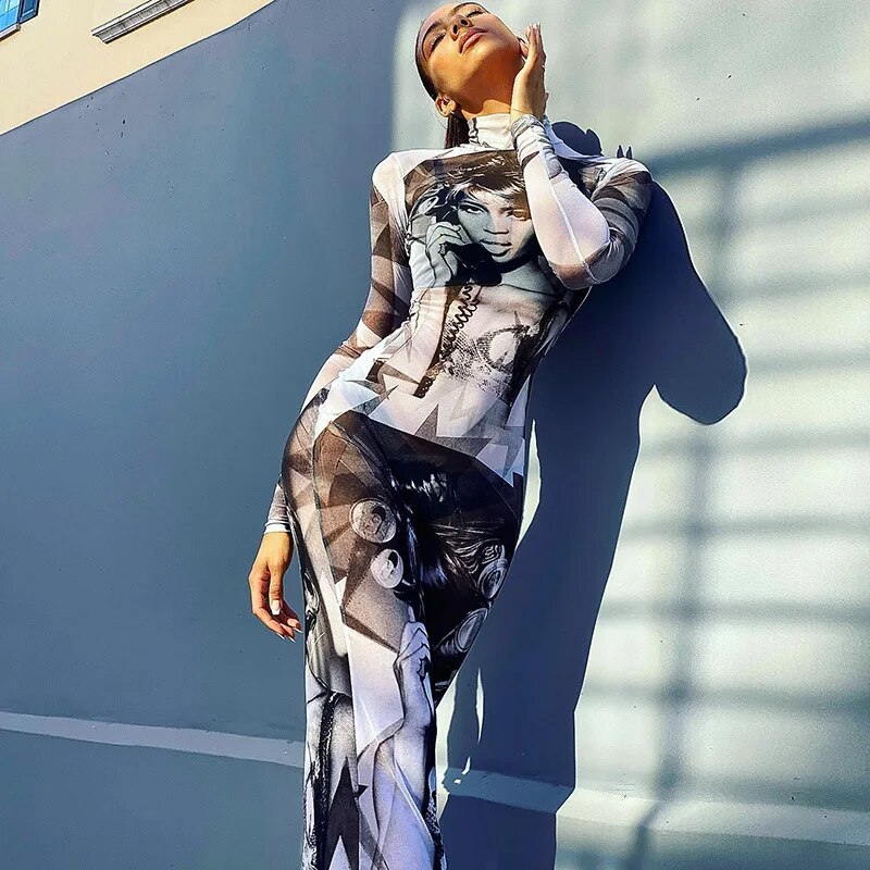 Women Mesh See Through Lonng Sleeve Print Dress Party Club Bodycon Streetwear Black Long Dress New Clothes