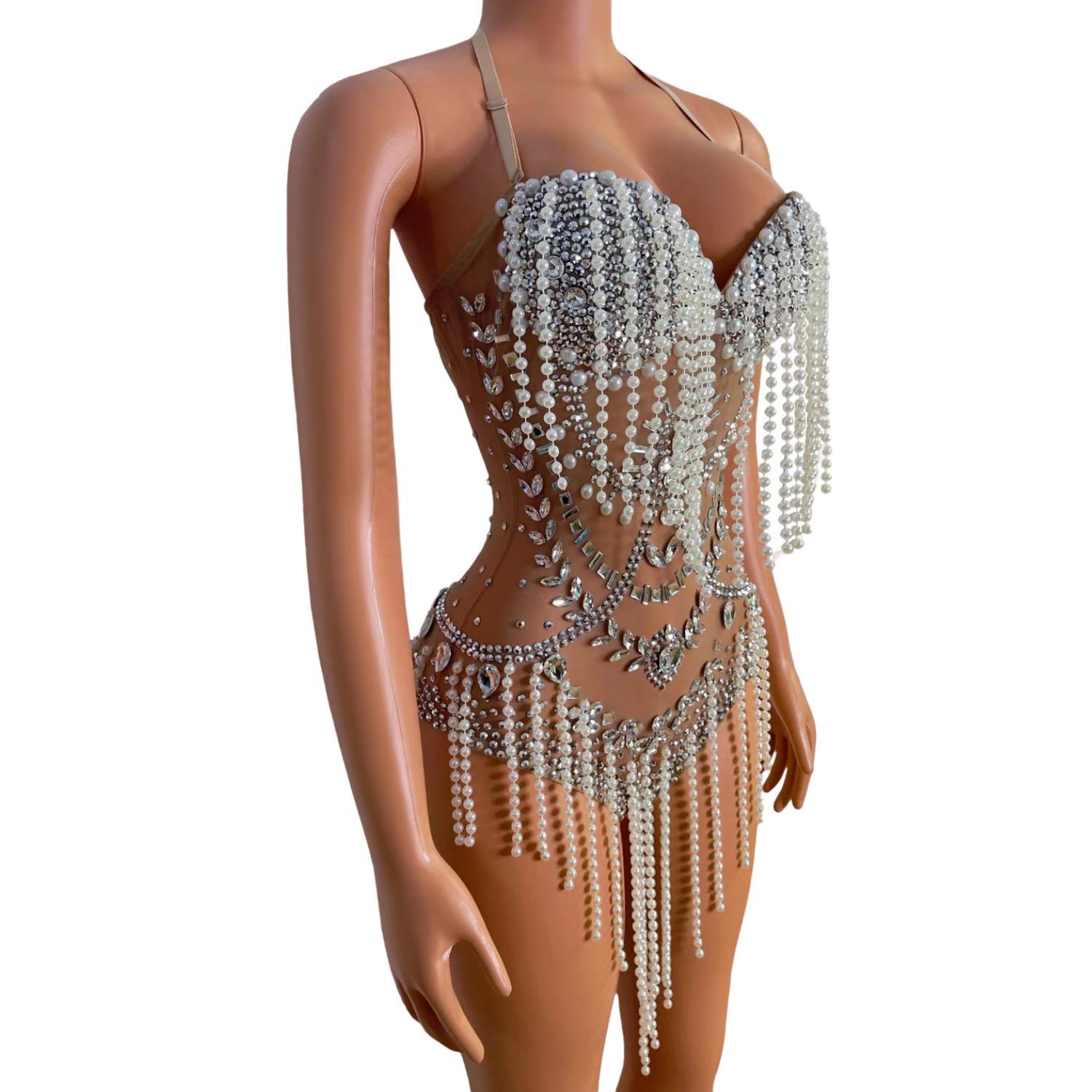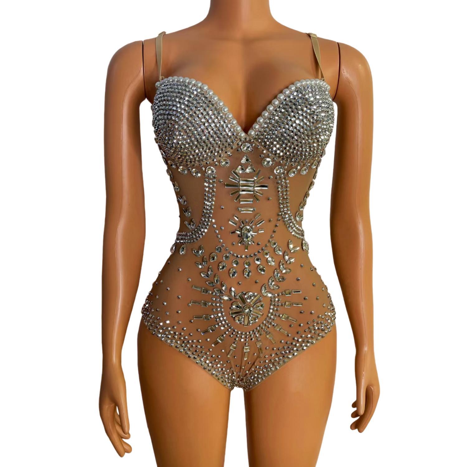 Women Rhinestone Pearl Bodysuit Appliques Sleeveless Bodycon Nightclub Dance Show Wear Party Evening Drag Queen Costume Jingtian