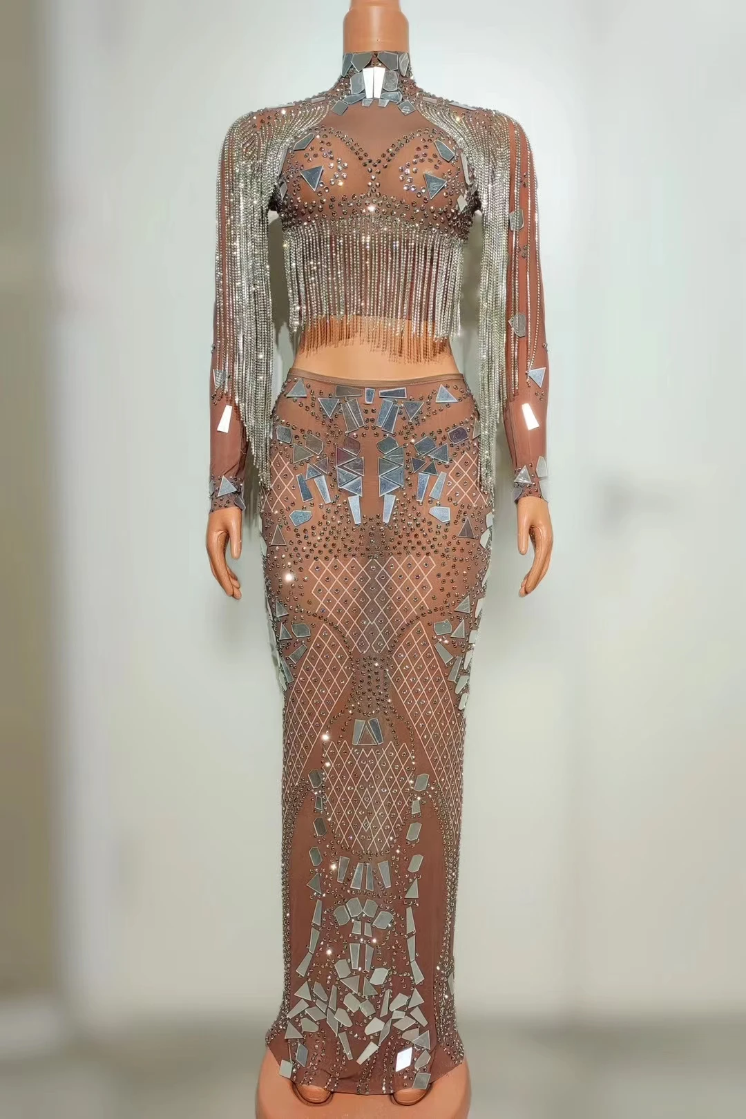 Women Sexy 2-Piece Set Dress Sparkly Mirrors Diamonds Fringes Evening Celebrate Birthday Dress Costume Photo Shoot Wear Yiner