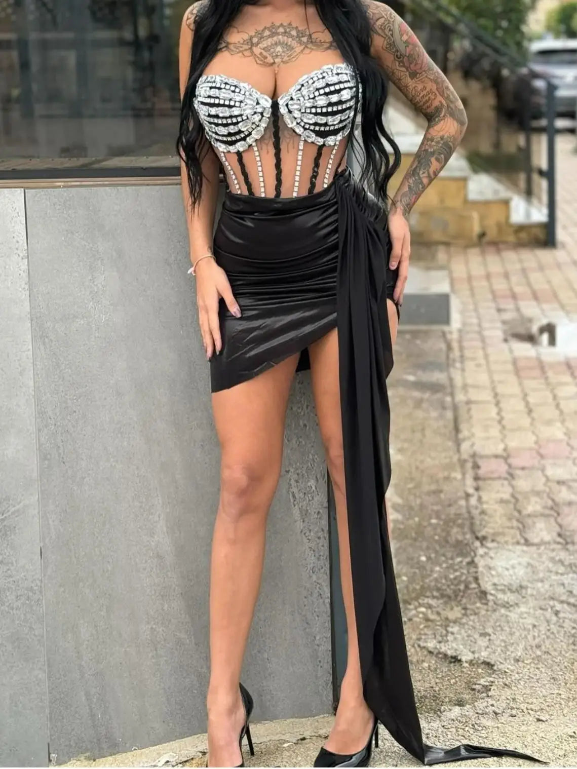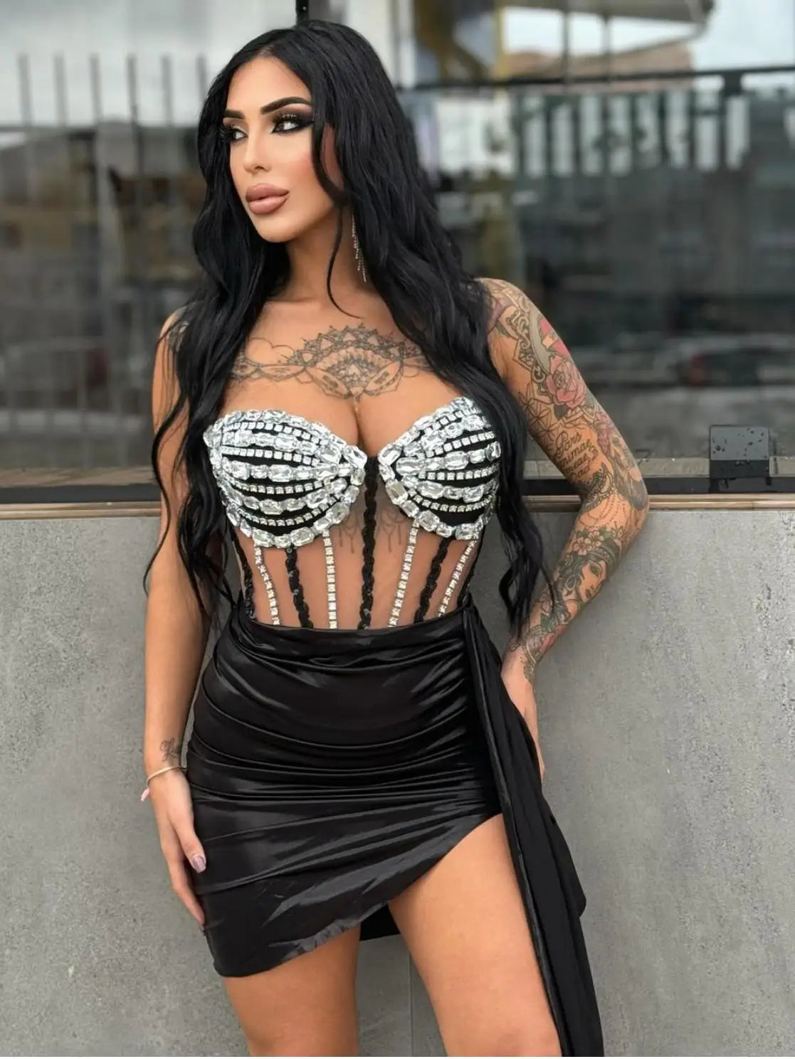Dazzle on stage or at any party with this women's sexy 2-piece top and skirt set. Adorned with sparkly diamonds and designed with see-through elements, this outfit is perfect for stage shows, designer performance wear, and nightclub events. The eye-catching, glamorous style ensures you鈥檒l stand out and shine at any celebration or special occasion.