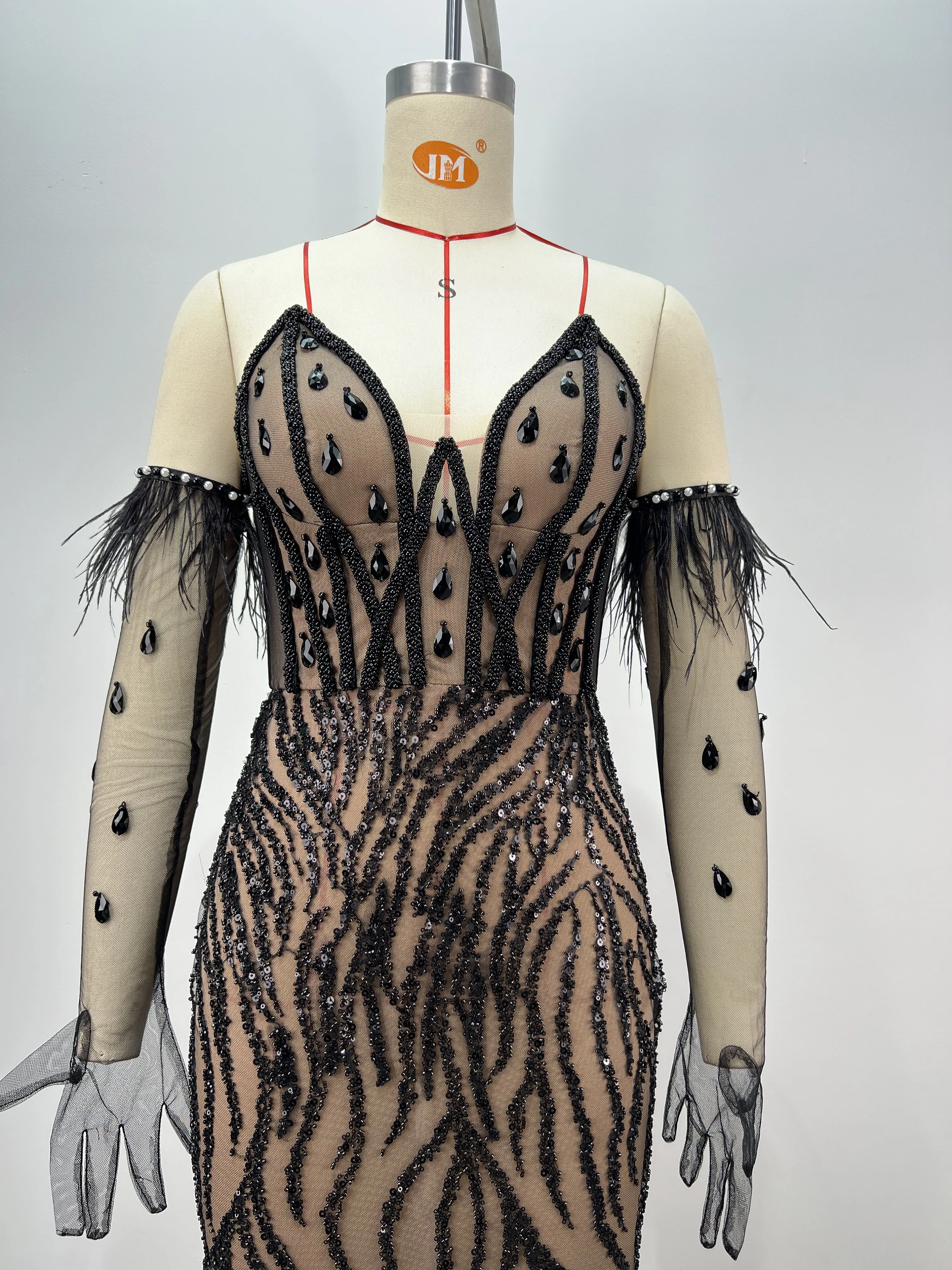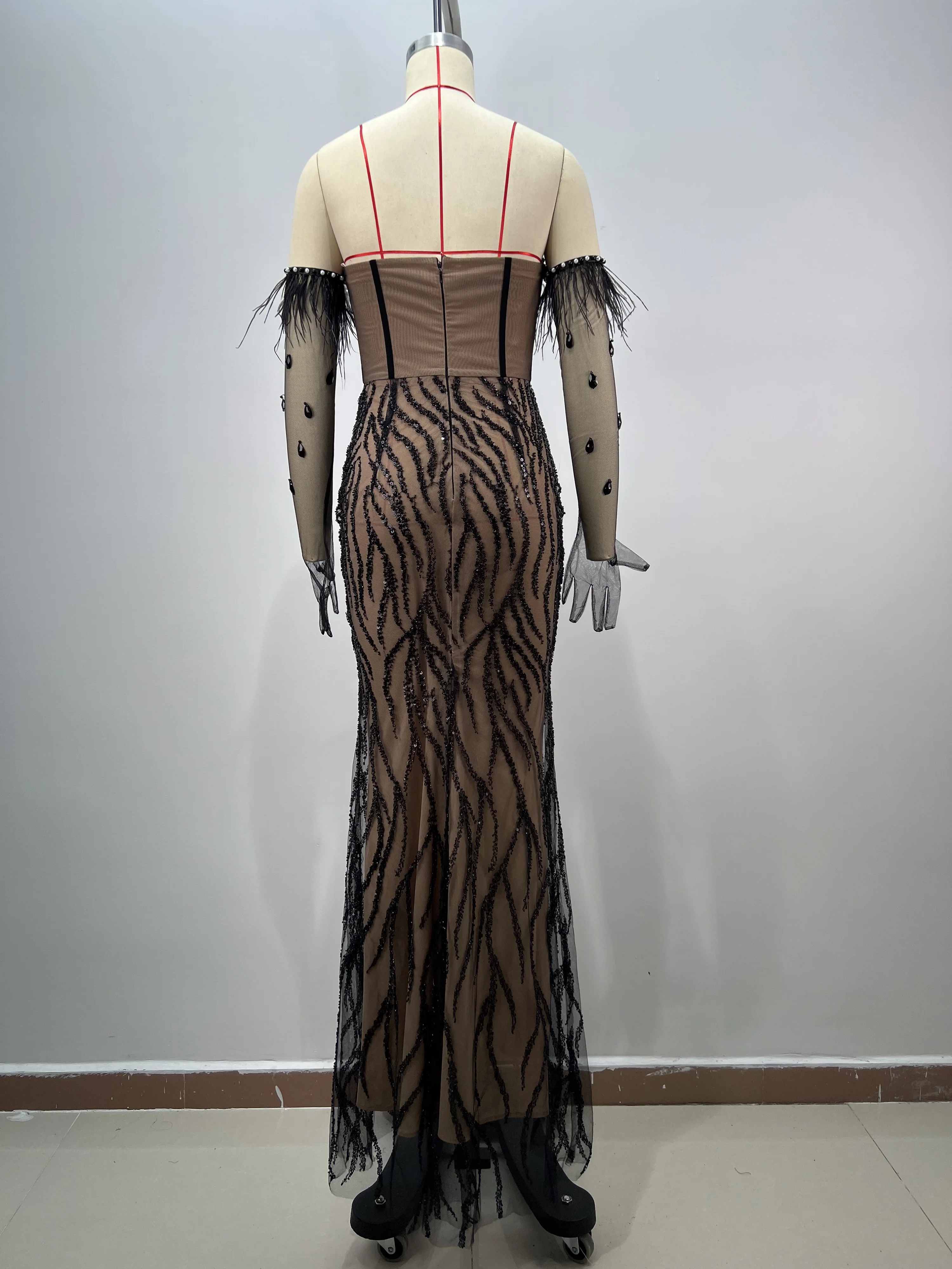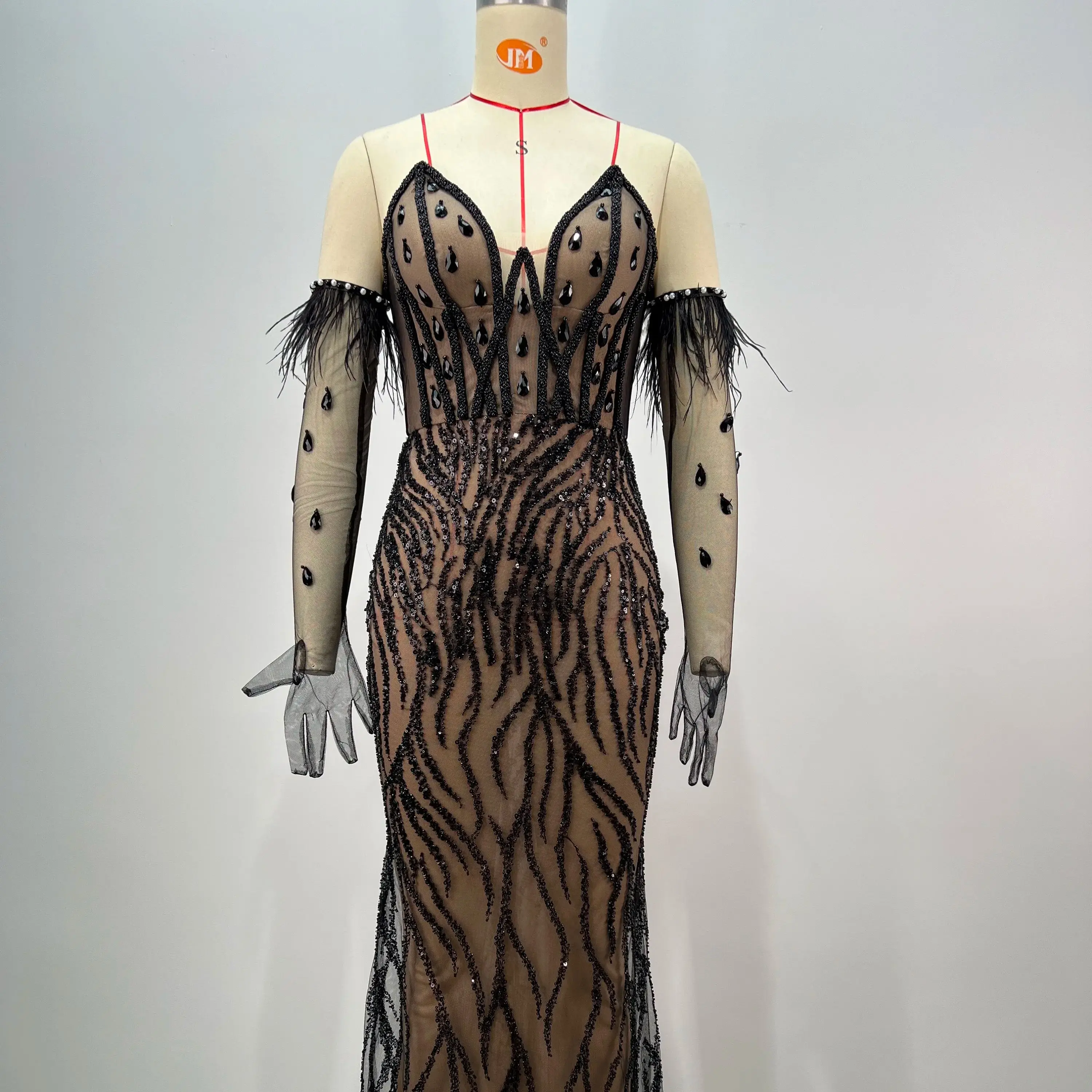 Women Sexy Celebrity Strapless Sequins Beading Black Gloves Luxury Maxi Long Gowns Dress Elegant Evening Party Club Vestido