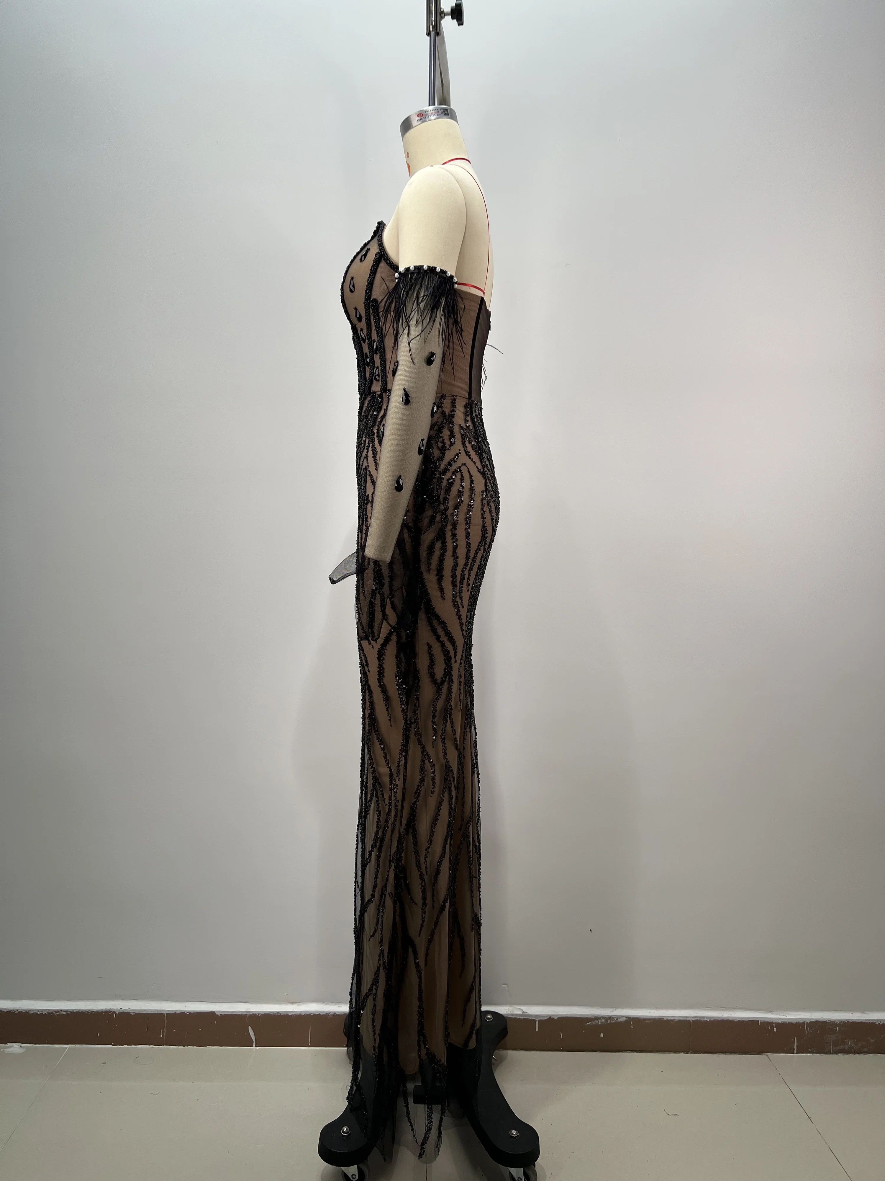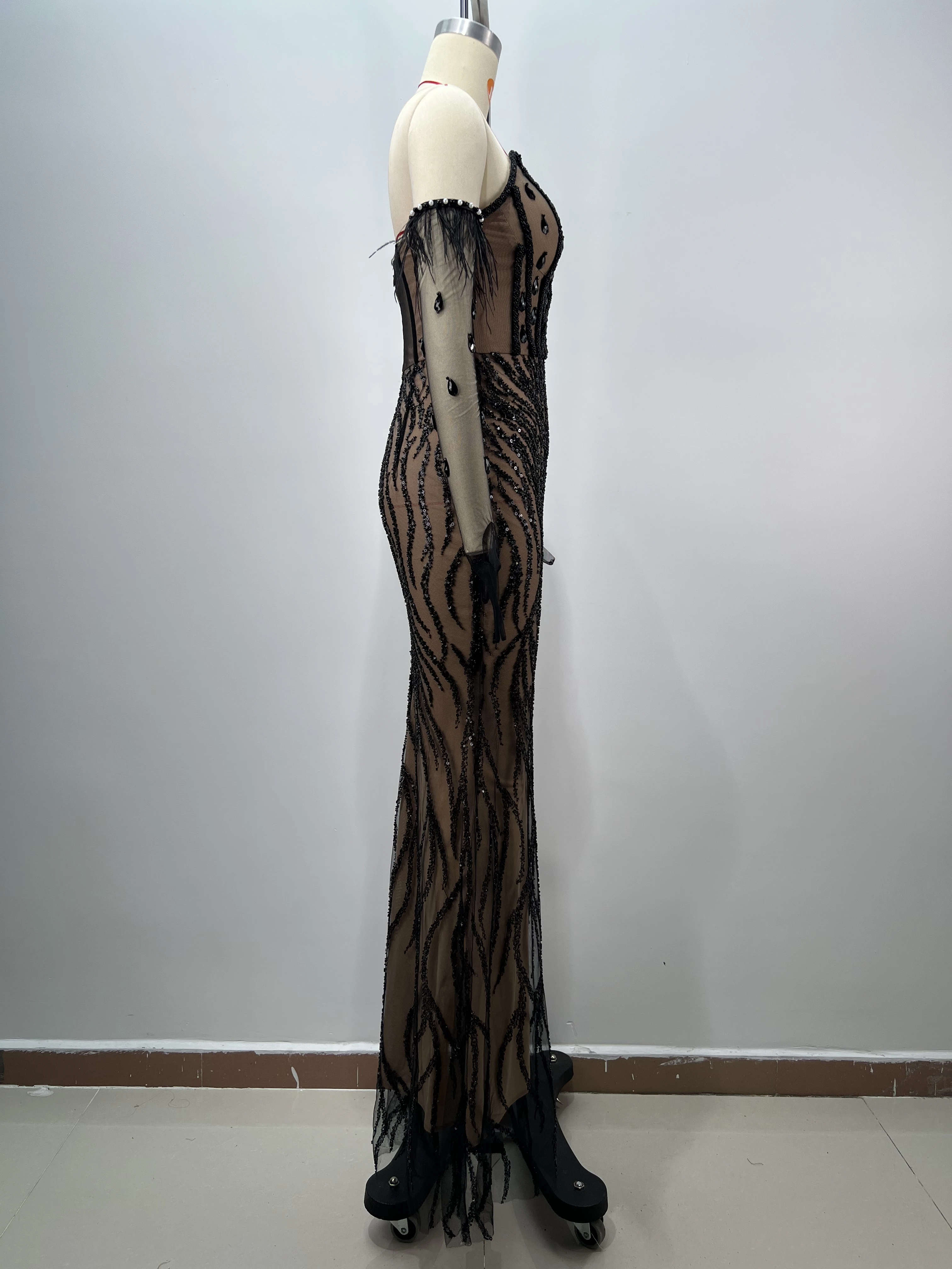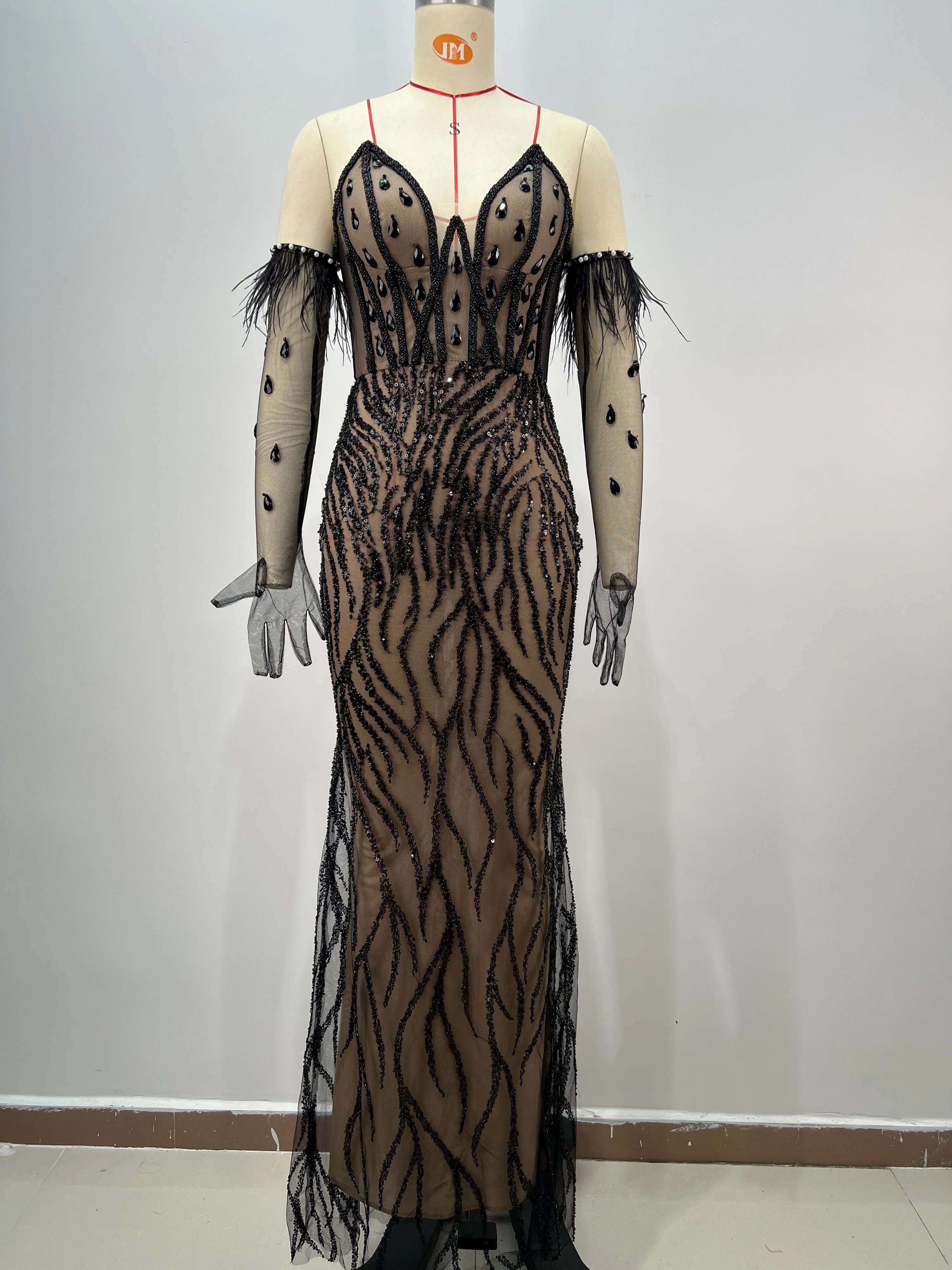 Women Sexy Celebrity Strapless Sequins Beading Black Gloves Luxury Maxi Long Gowns Dress Elegant Evening Party Club Vestido