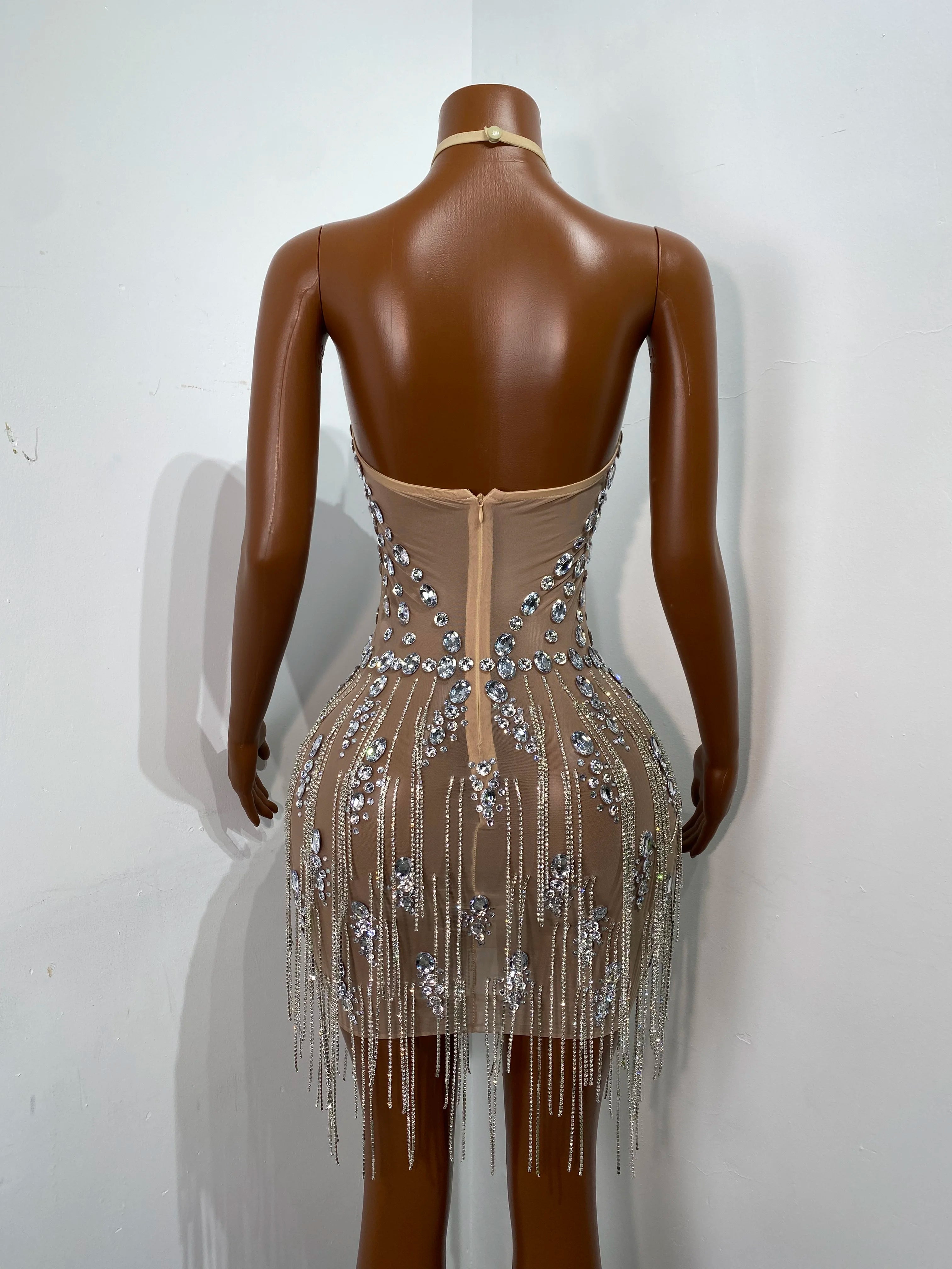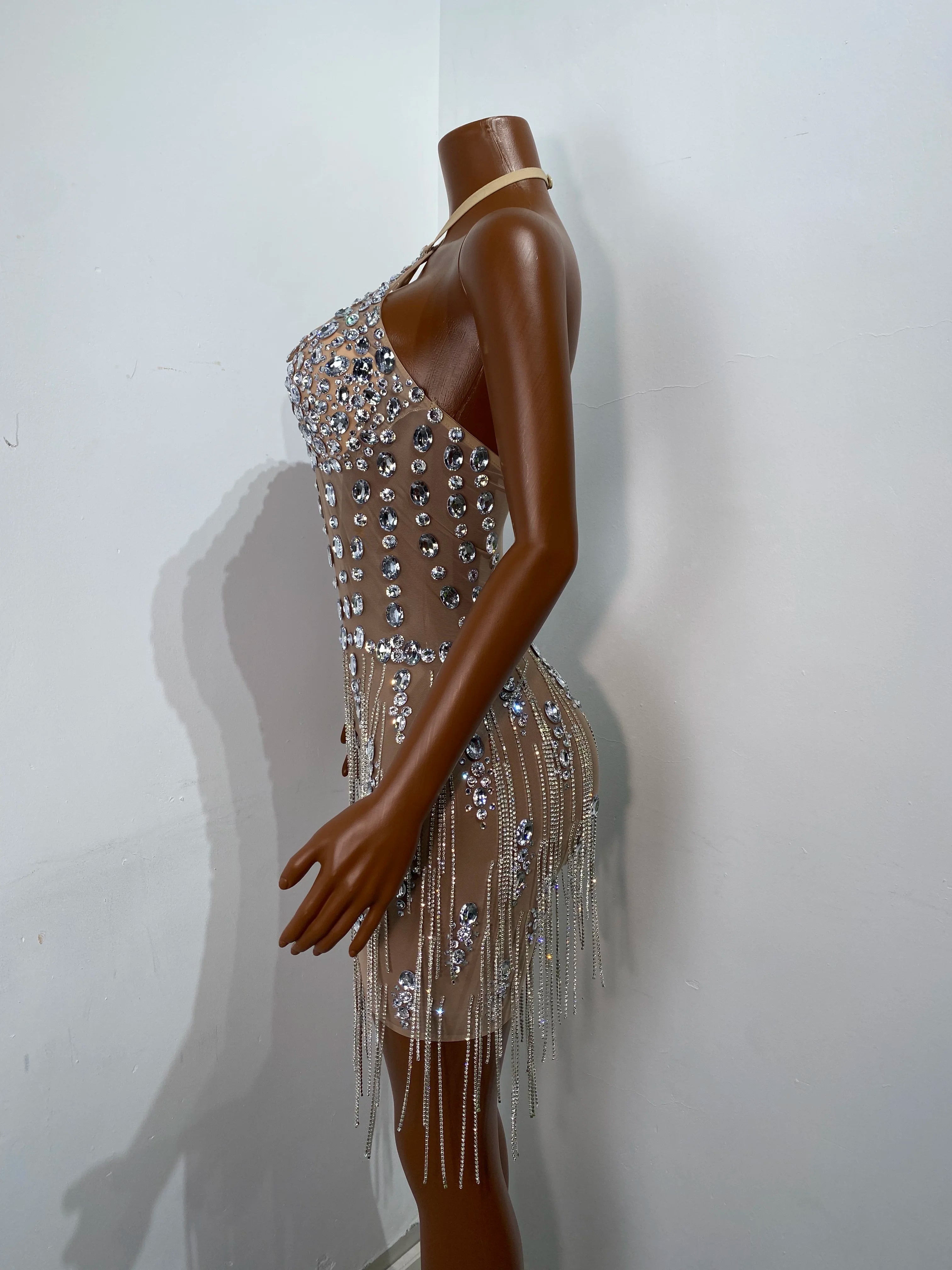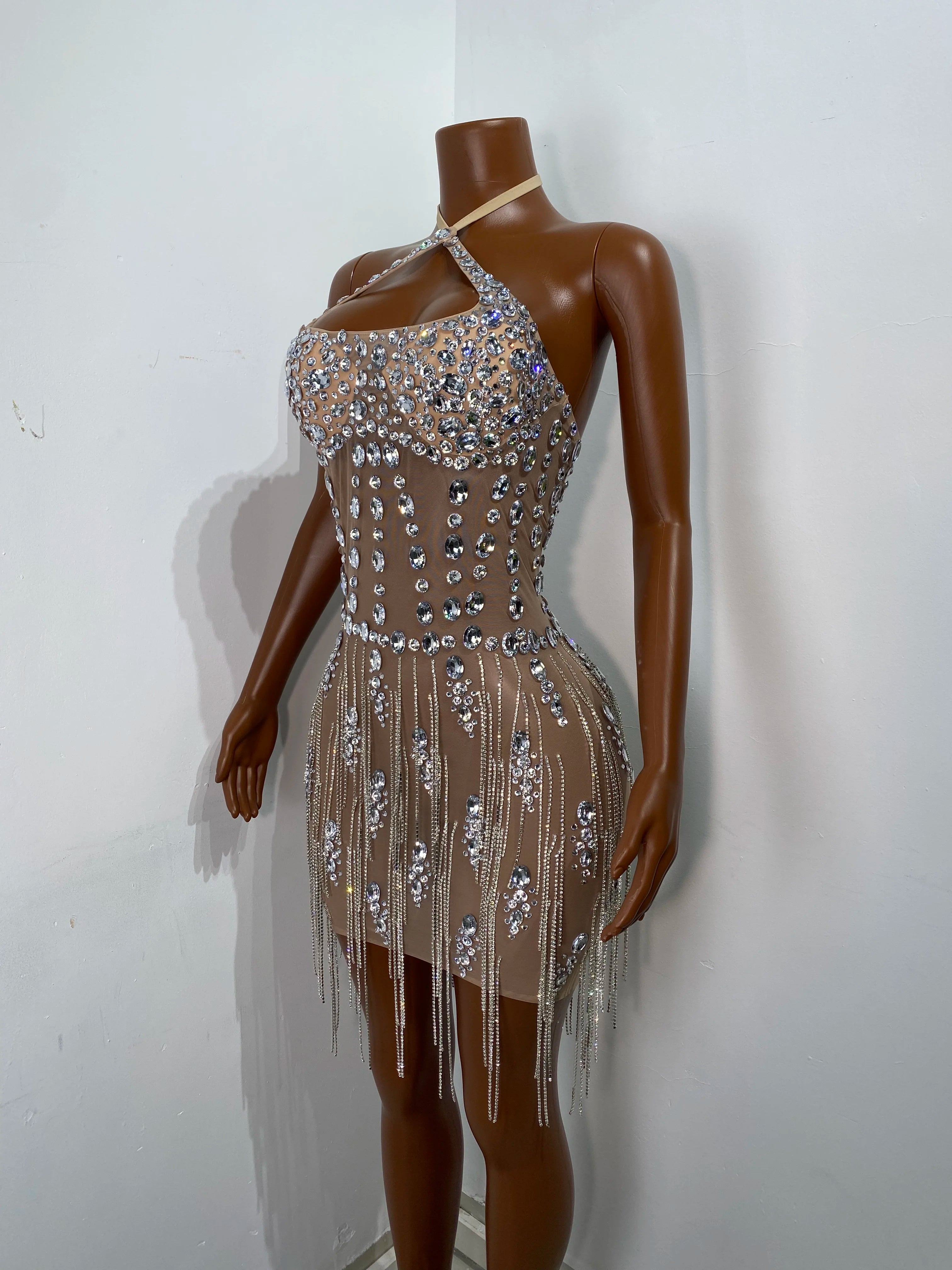 Women Sexy Halter Crystal Shining Diamonds Mini Bodycon Dress Birthday Party Costume Bar Nightclub Stage Performance Clothing