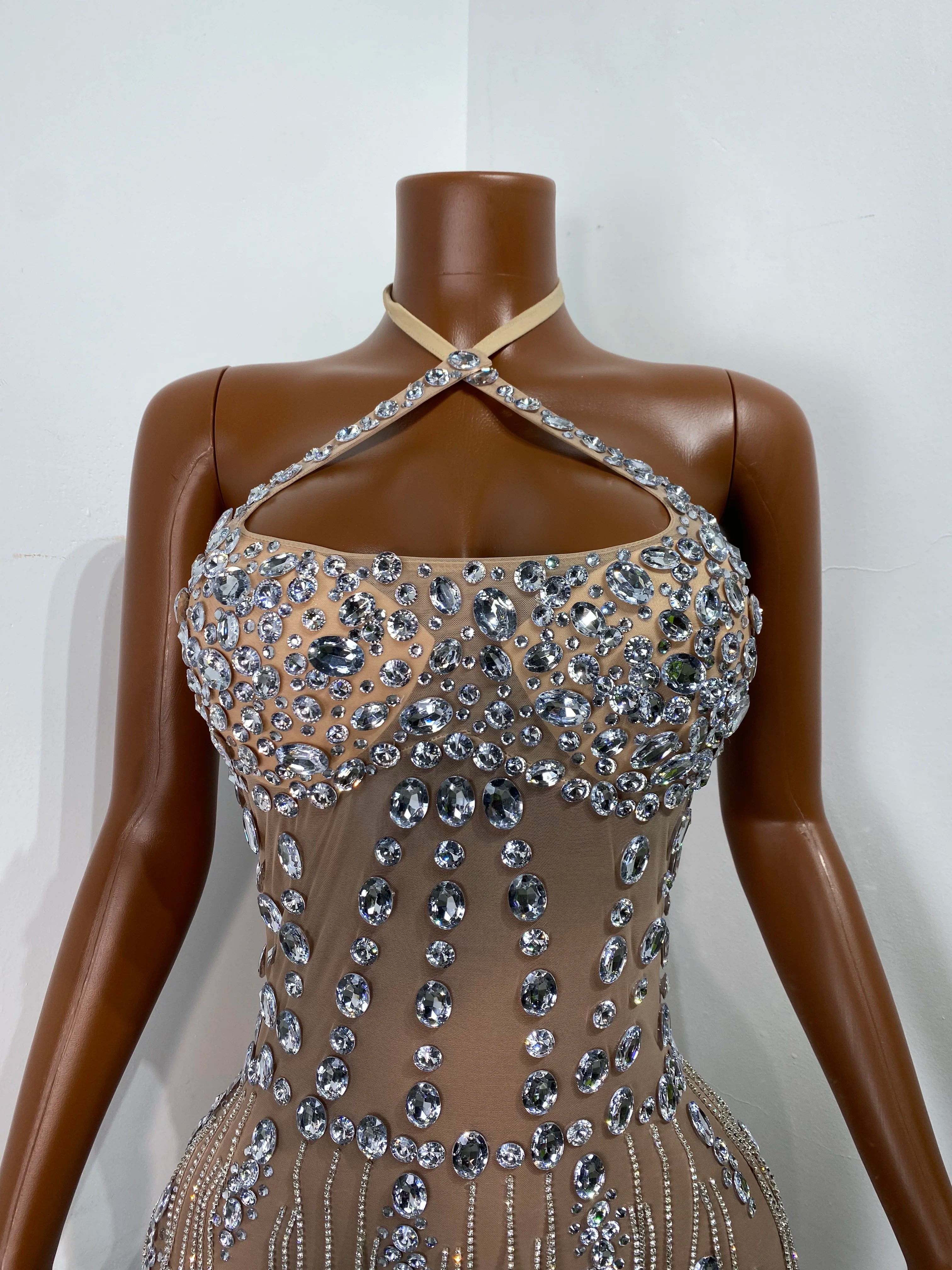 Command attention in this Women’s Sexy Halter Crystal Mini Bodycon Dress — crafted to sparkle from every angle. The halter neckline flatters the shoulders and elongates the torso, while the bodycon fit sculpts your silhouette for a confident, show-stopping appearance. Densely applied crystals and rhinestones create a luminous surface that catches flashes and stage lights, making this dress a go-to for performers and nightlife fashionistas alike.