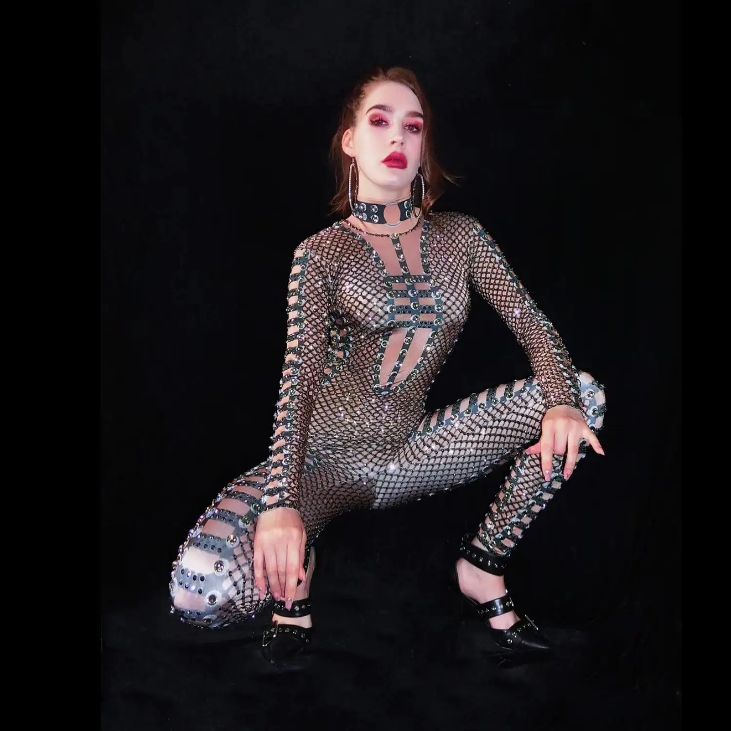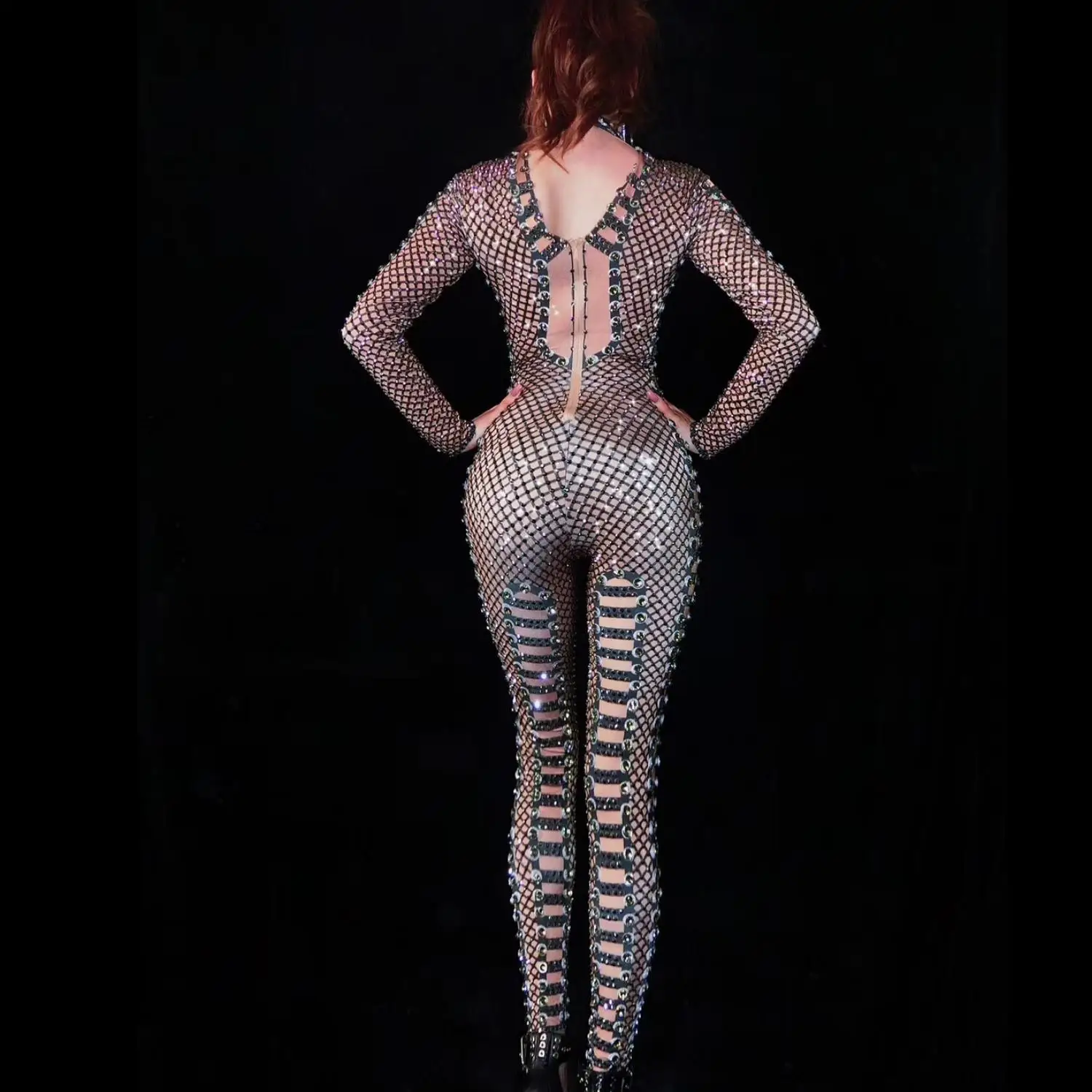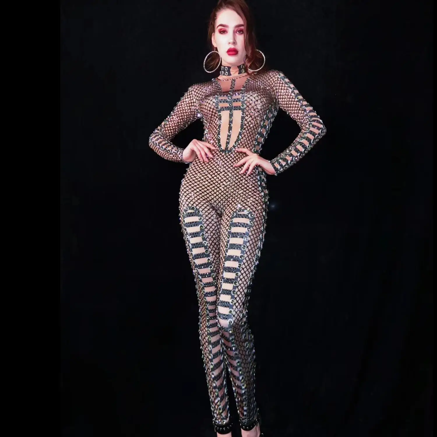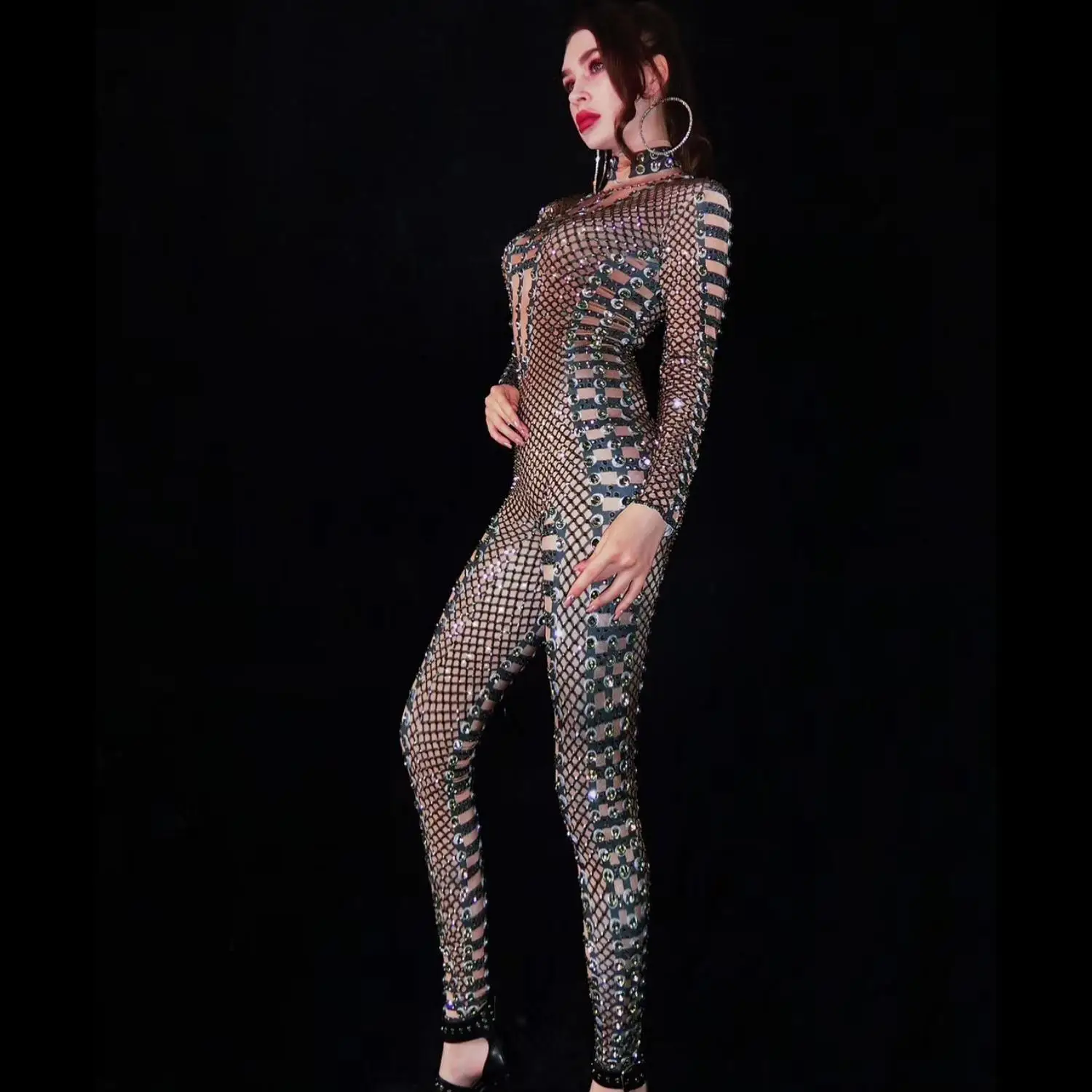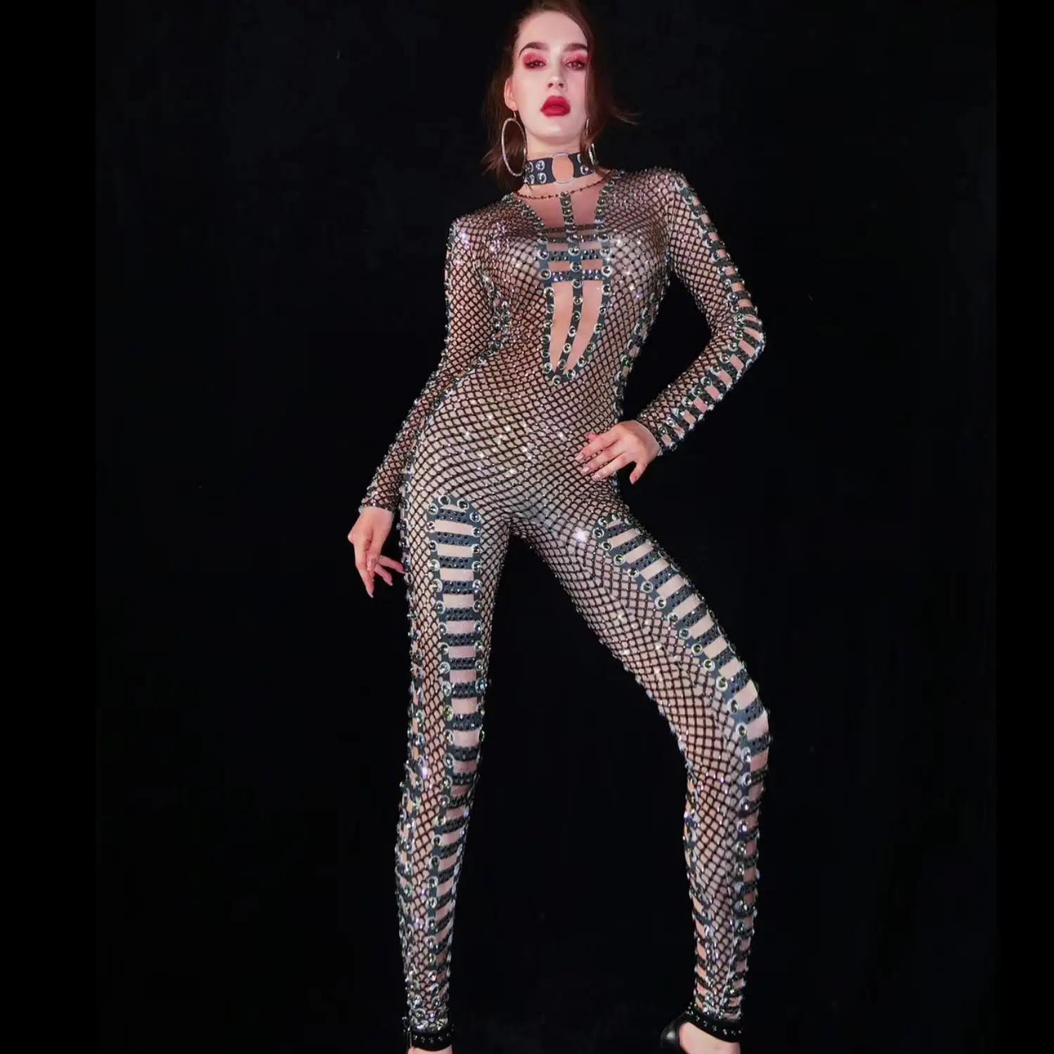 Women Sexy Hollow Out Print Rhinestones Jumpsuit Performance Costume Party Nightclub Go-go Dance Outfit Show Stage Wear Louwang