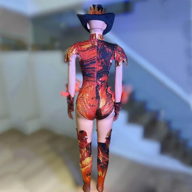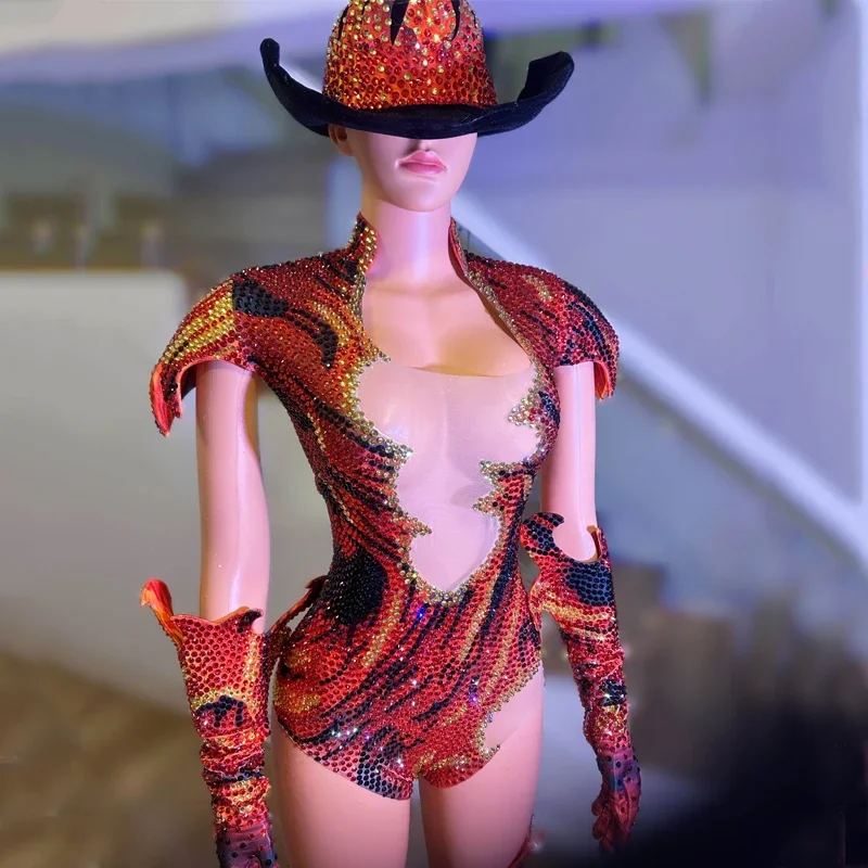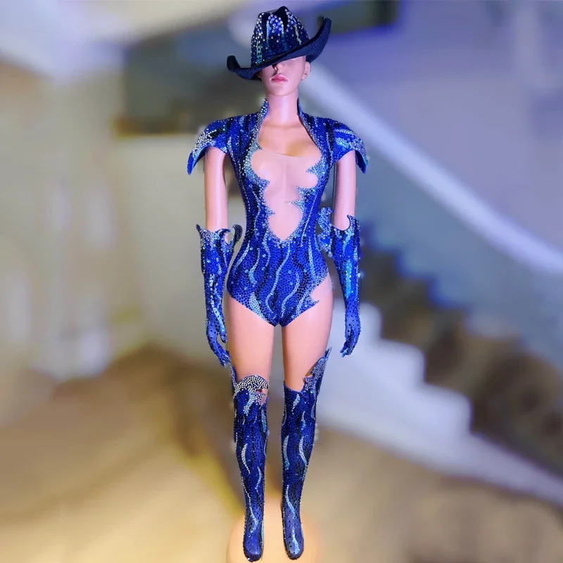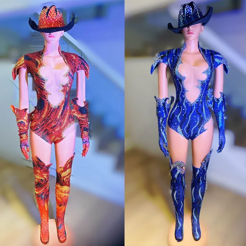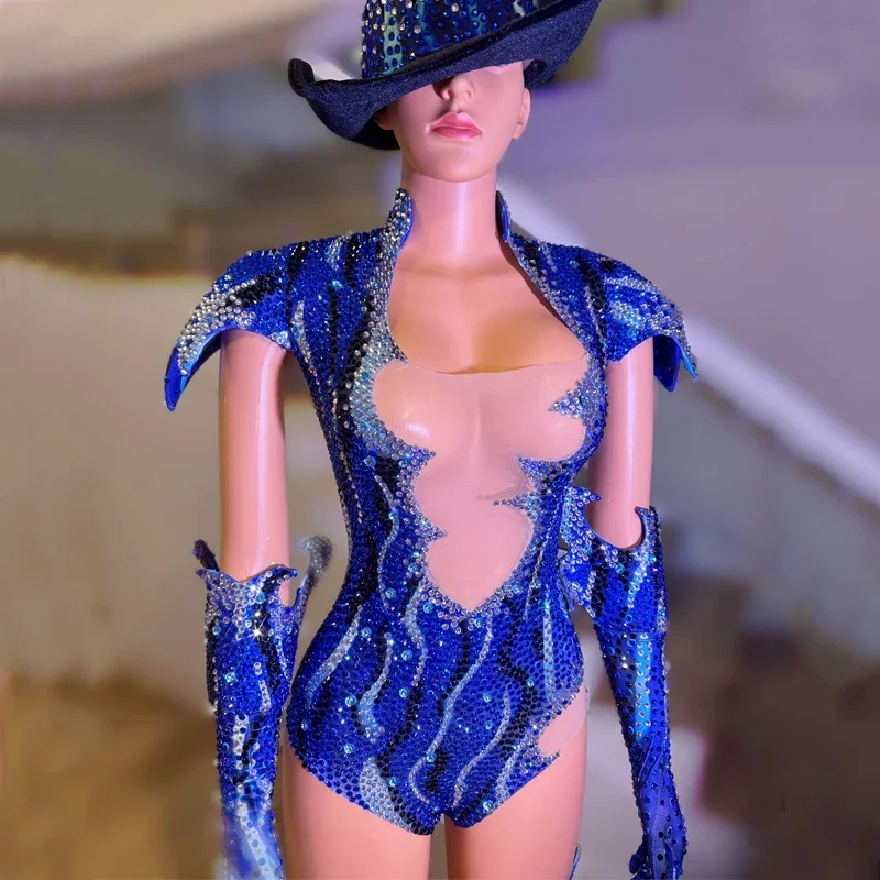 Women Sexy Perspective Pole Dance Outfit Stage Gogo Wear Drag Queen Costumes Red Blue Rhinestones Bodsyuit Gloves Hat
