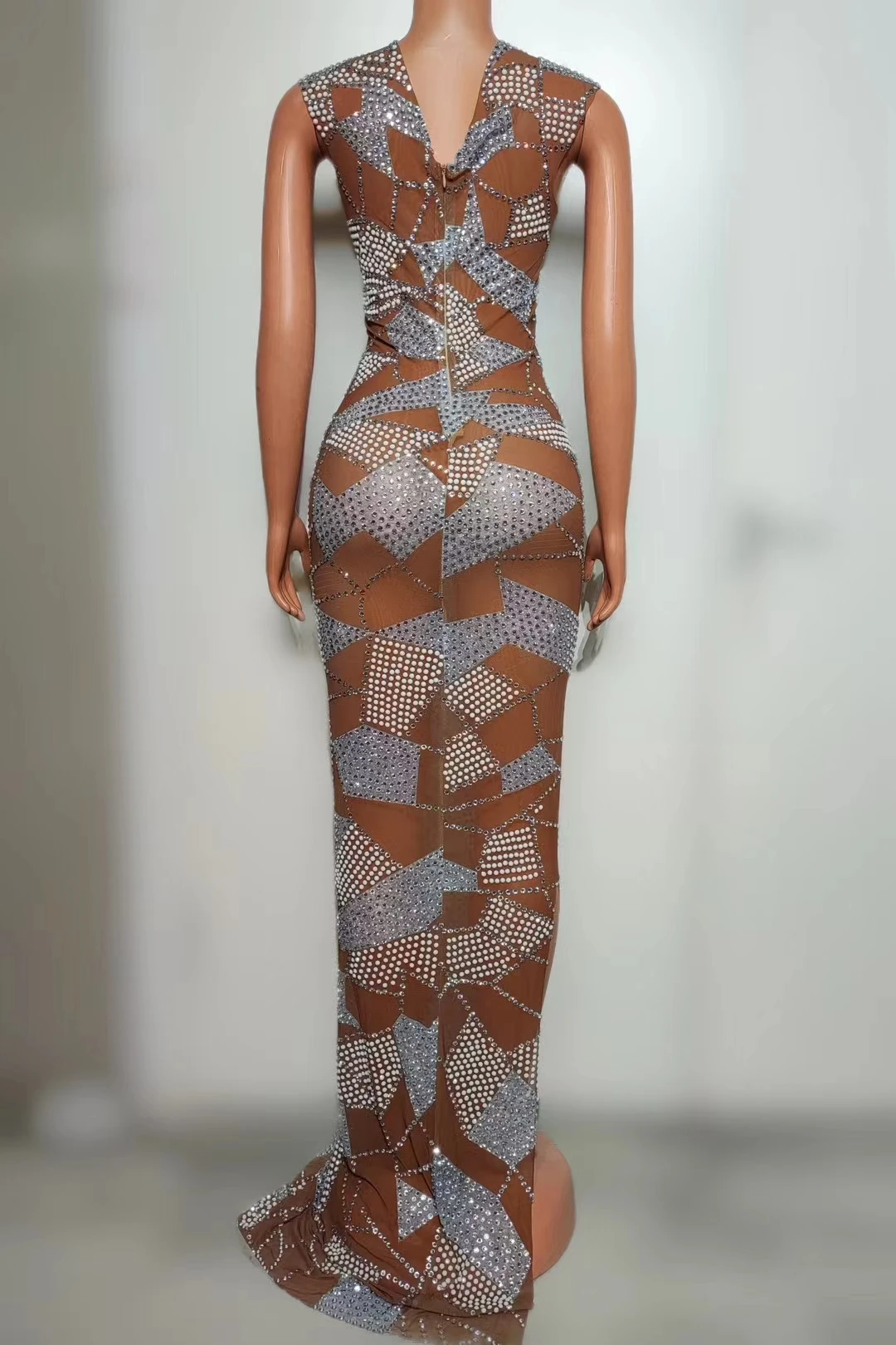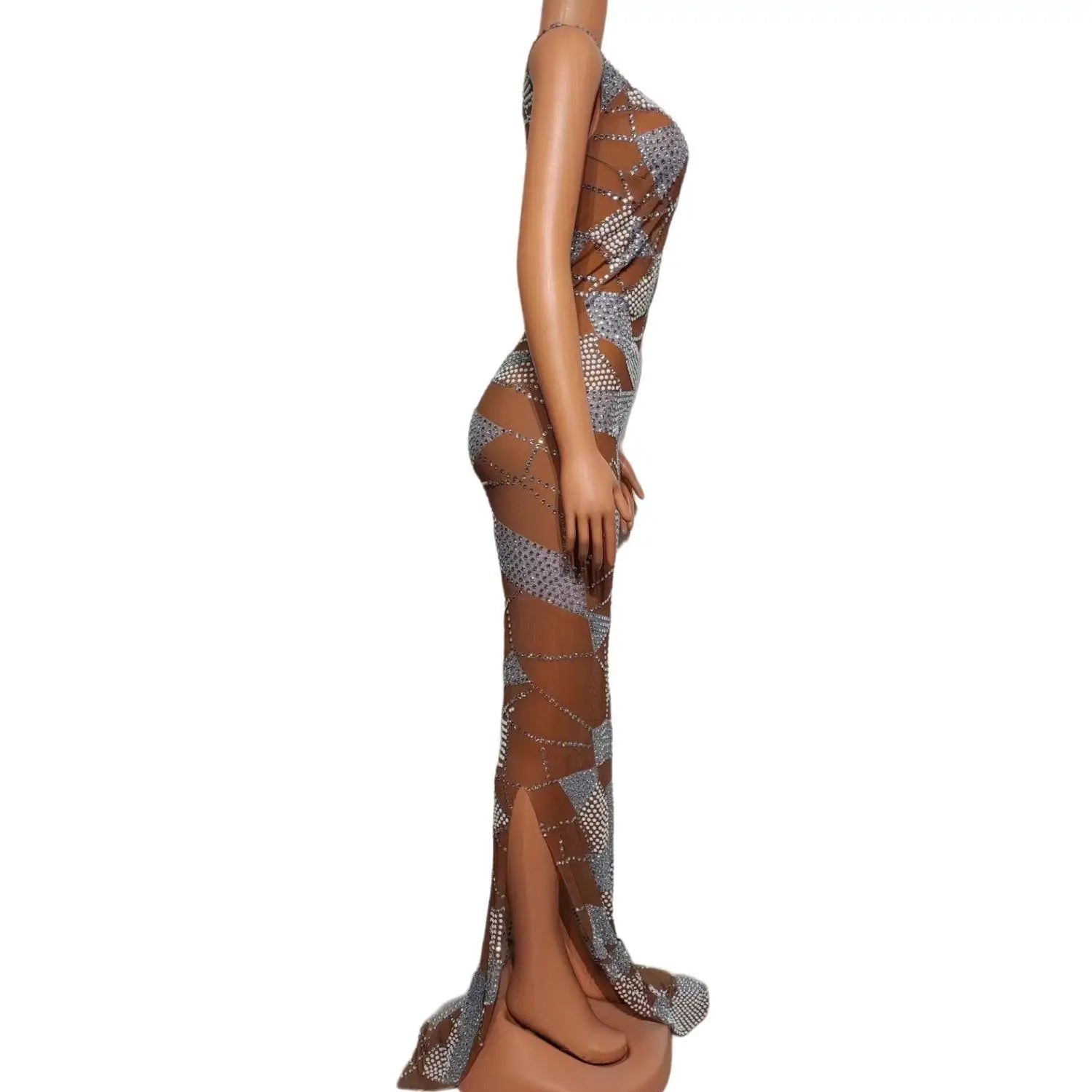 Women Sexy Sparkly Rhinestones Split Floor Length Dress Dark Mesh Celebrate Evening Prom Gown Birthday Photo Shoot Dress Suipian