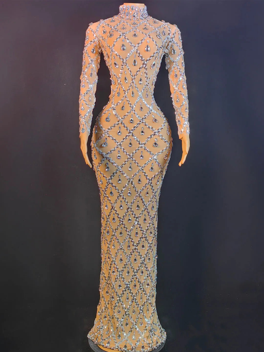 This women's sexy stage dress features sparkly crystals, sequins, and mesh fabric, making it perfect for evening prom parties, birthdays, and photoshoots. The transparent mesh adds a touch of allure to the long dress, creating a glamorous and eye-catching look for any special occasion.