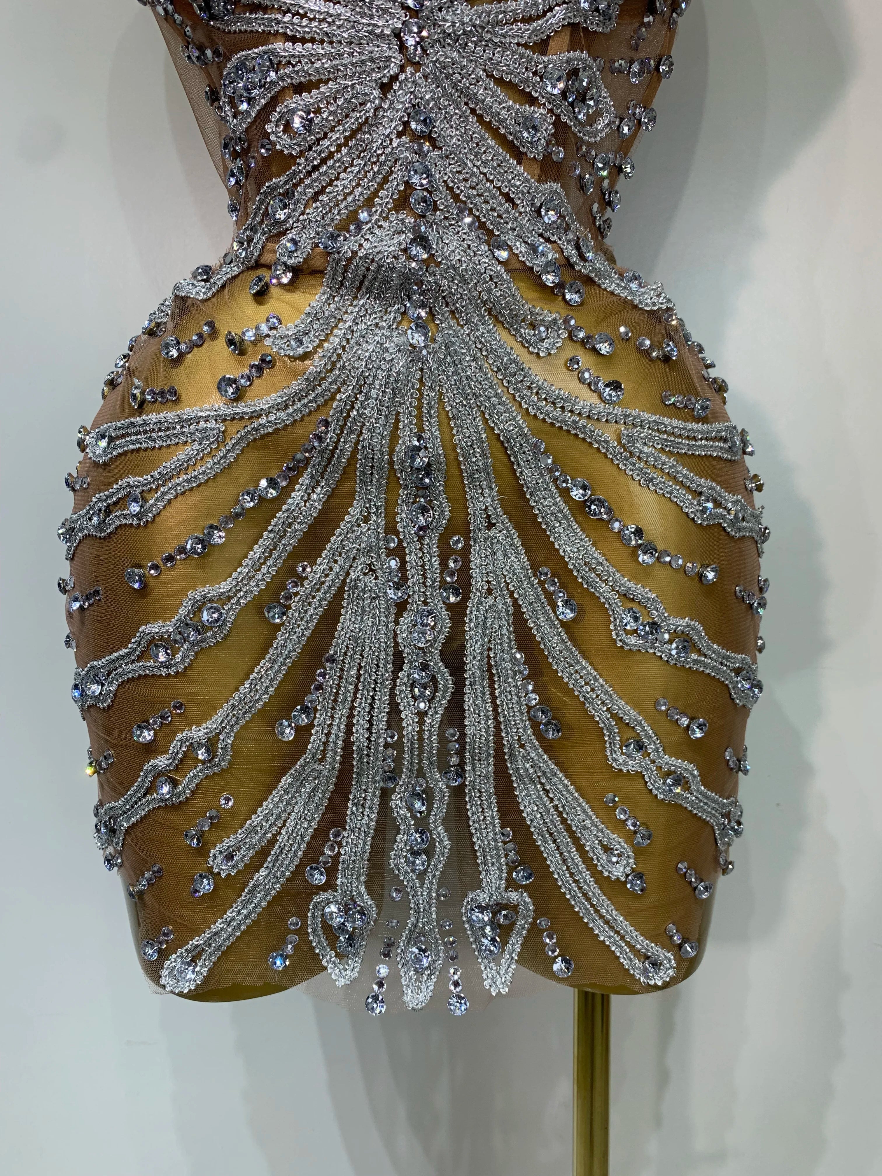 Women Sexy Strapless Rhinestones Mini Dress Performance Costume See Through Stage Dancer Club Evening Party Birthday Dress