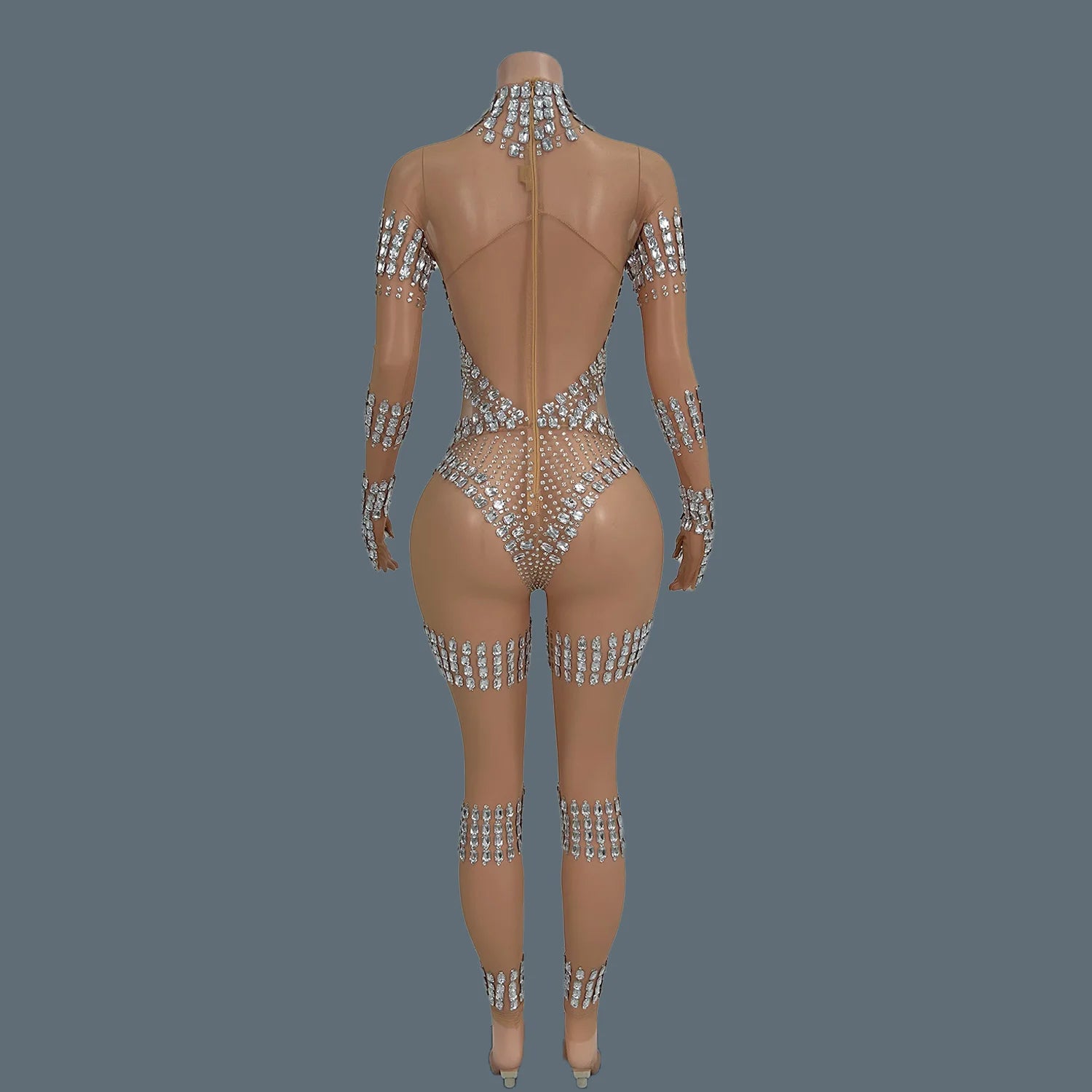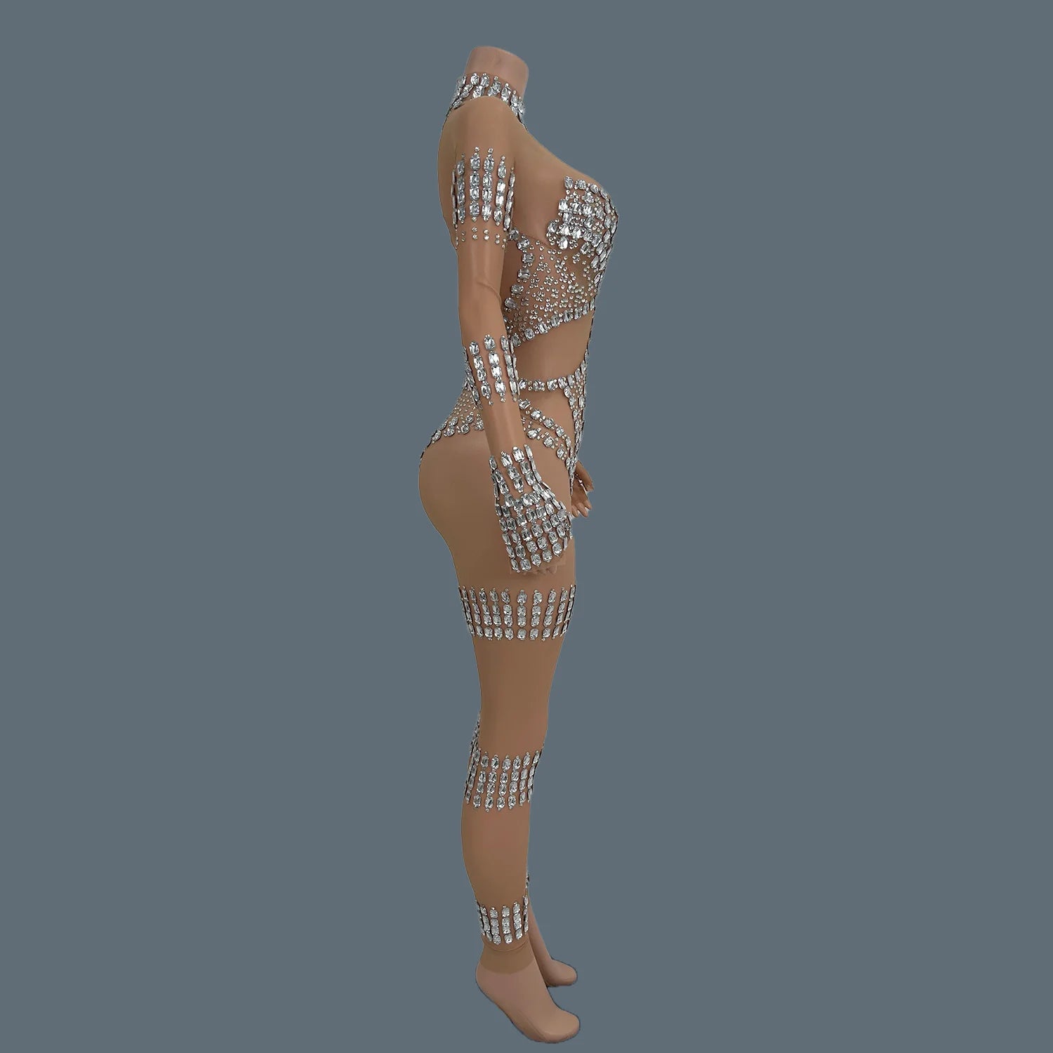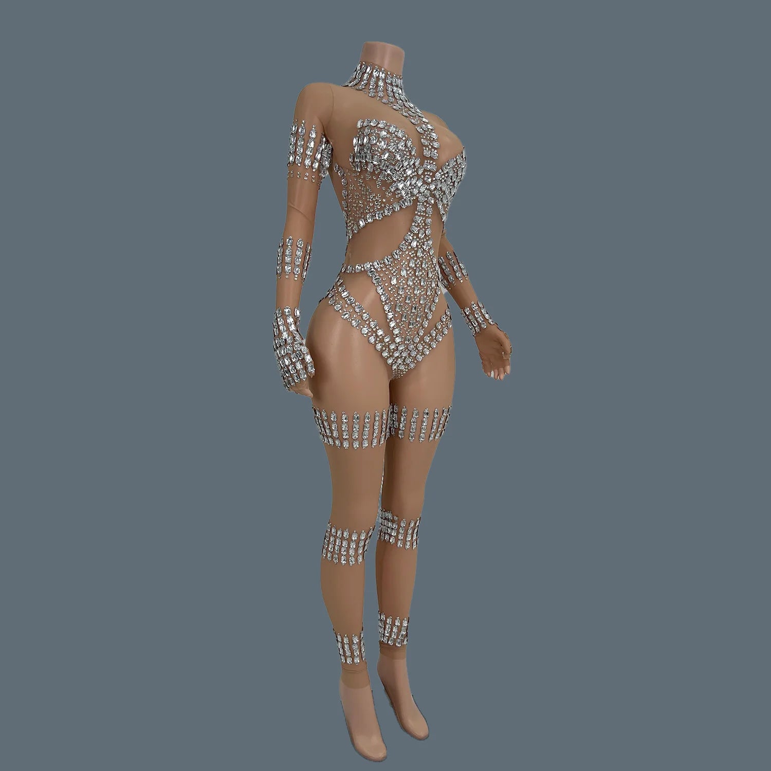 Make a dazzling statement in this women's sexy transparent playsuit, featuring an array of sparkly crystals and rhinestones. Crafted from stretchy mesh, this jumpsuit ensures a flattering fit while allowing for comfortable movement, making it an ideal dance costume for performances and stage appearances. Perfect for any occasion where you want to shine, this outfit combines elegance and allure to enhance your confidence as you take the spotlight.