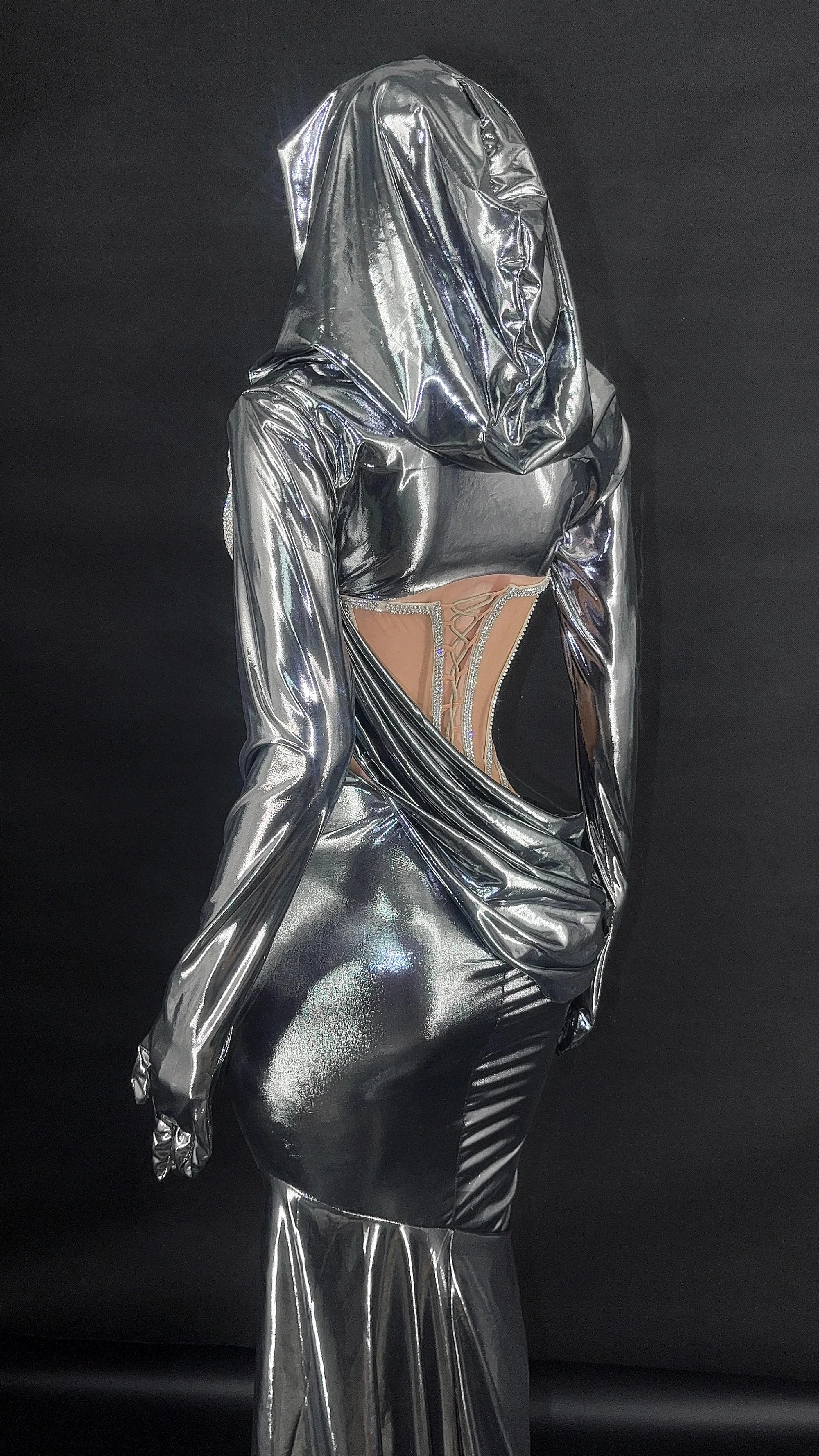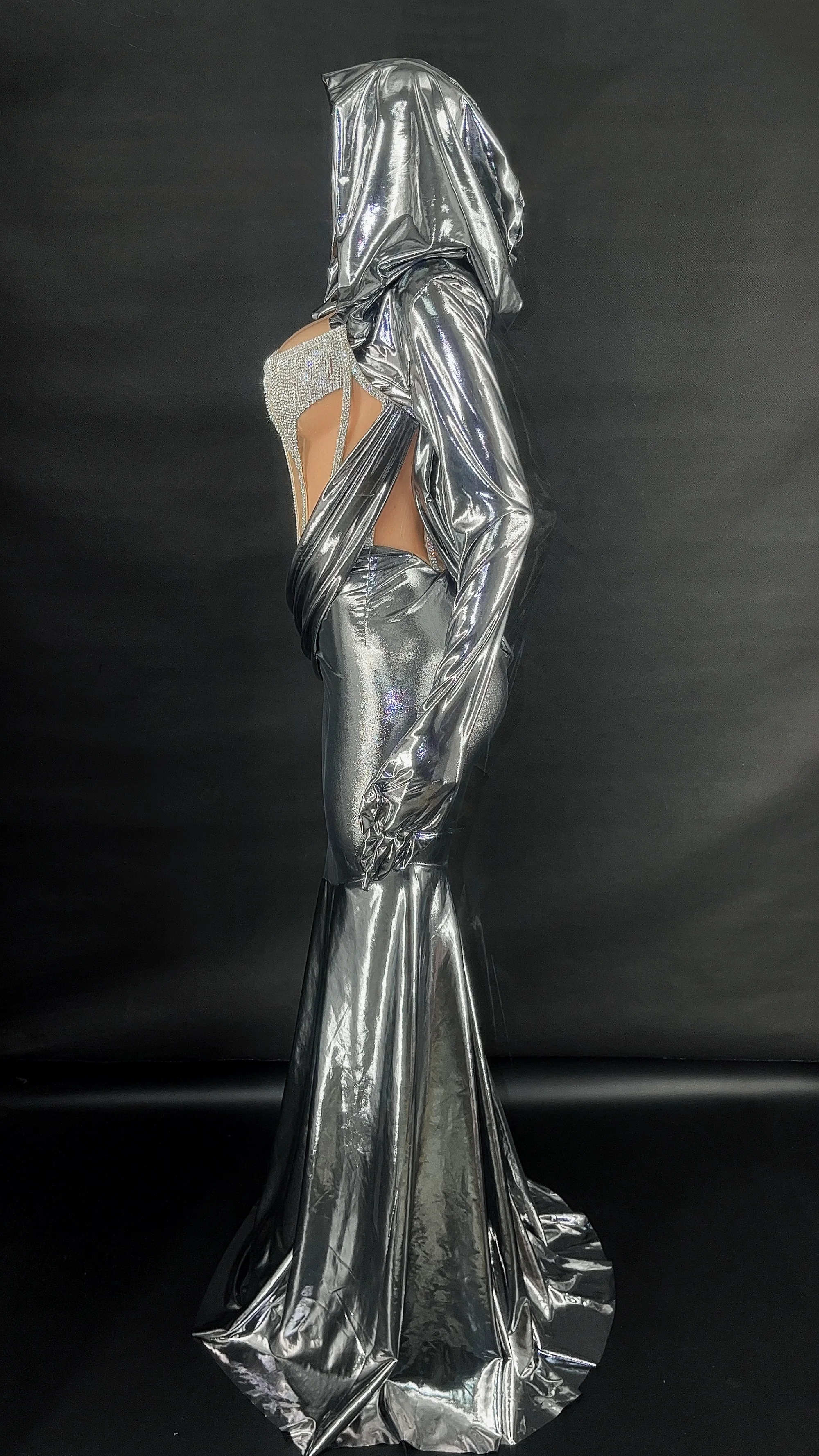 Women Silver Shiny Diamonds Gloves hat long dresses Sexy See through Evening Party Sing Stage Photoshoot Performance Costume