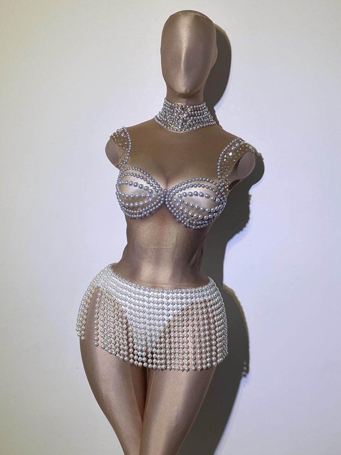 Women Singer Costume White Pearl Fringe Stones Spandex Bodysuit Nightclub Bar Prom Birthday Outfit