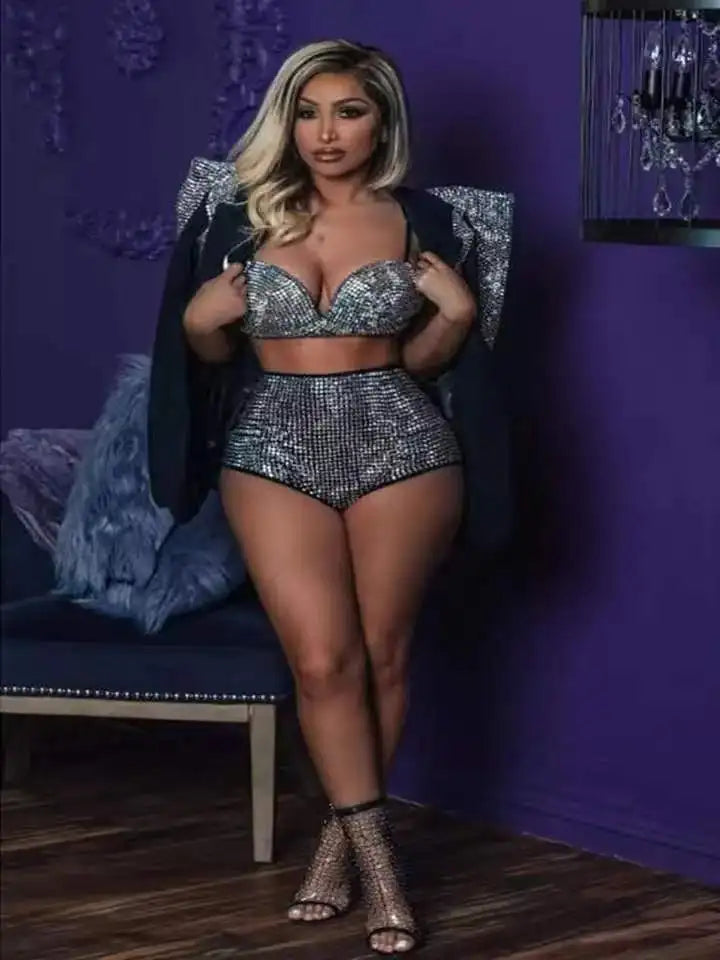 Shine on stage with our?Women��s Singer Dance Bra and Short Jacket Outfit Set. This dazzling ensemble features a sparkly silver bodice adorned with shimmering rhinestones, perfectly complemented by a stylish short jacket. Designed for nightclub performances and special occasions, this outfit exudes glamour and confidence. Whether you��re celebrating a birthday or captivating an audience, this black wear set ensures you stand out and make a lasting impression. Elevate your performance wardrobe with this must-have outfit!
