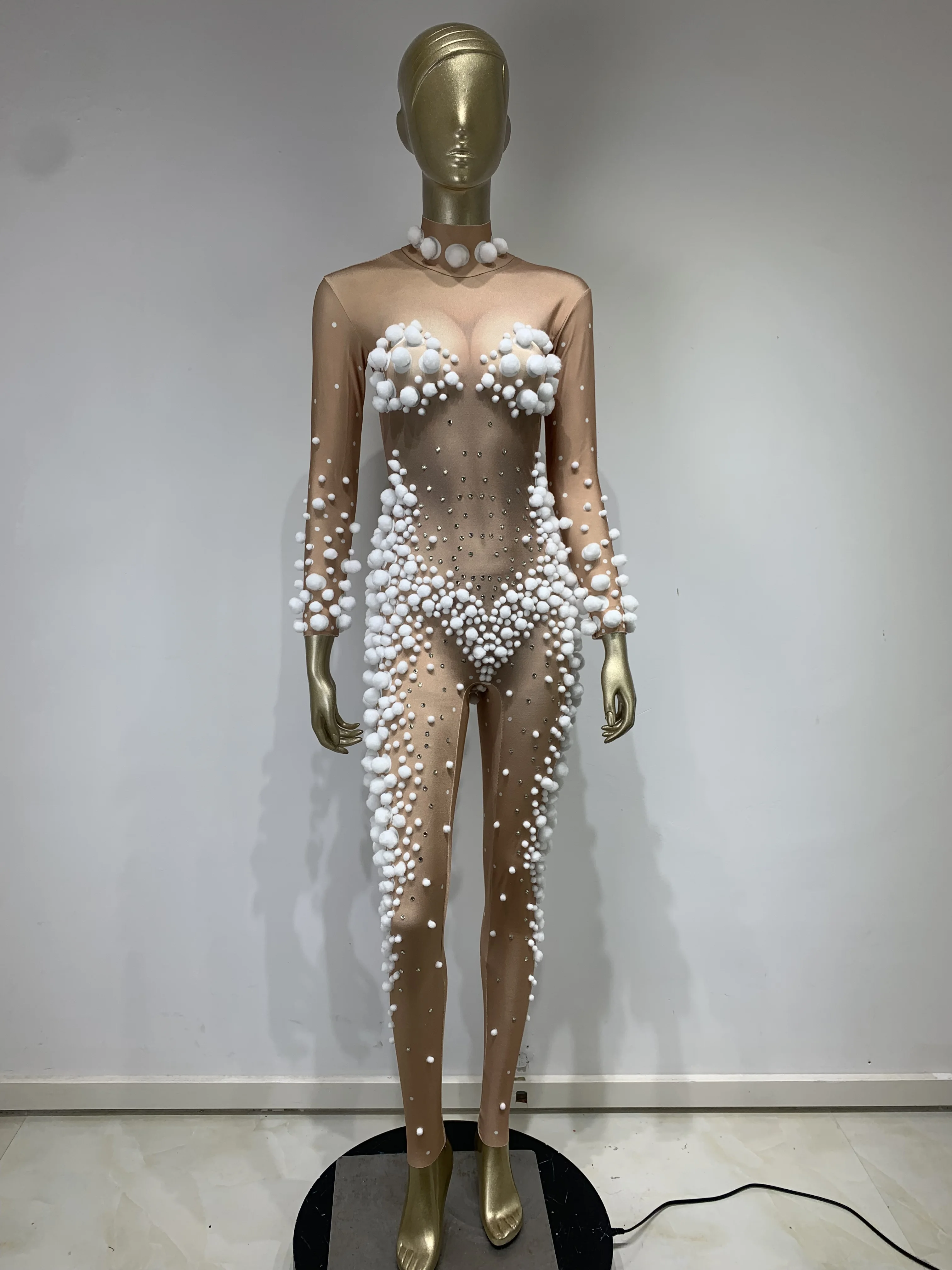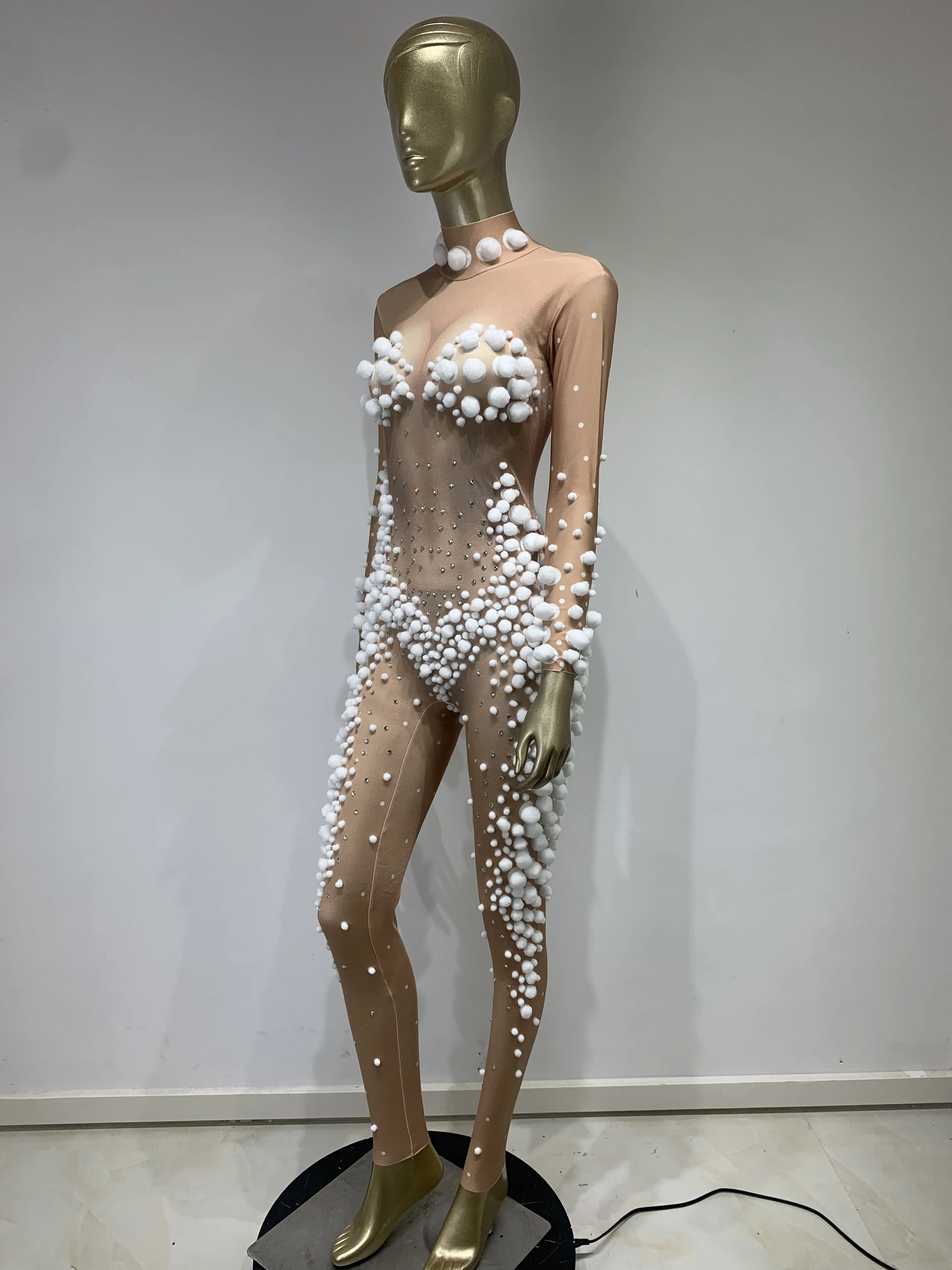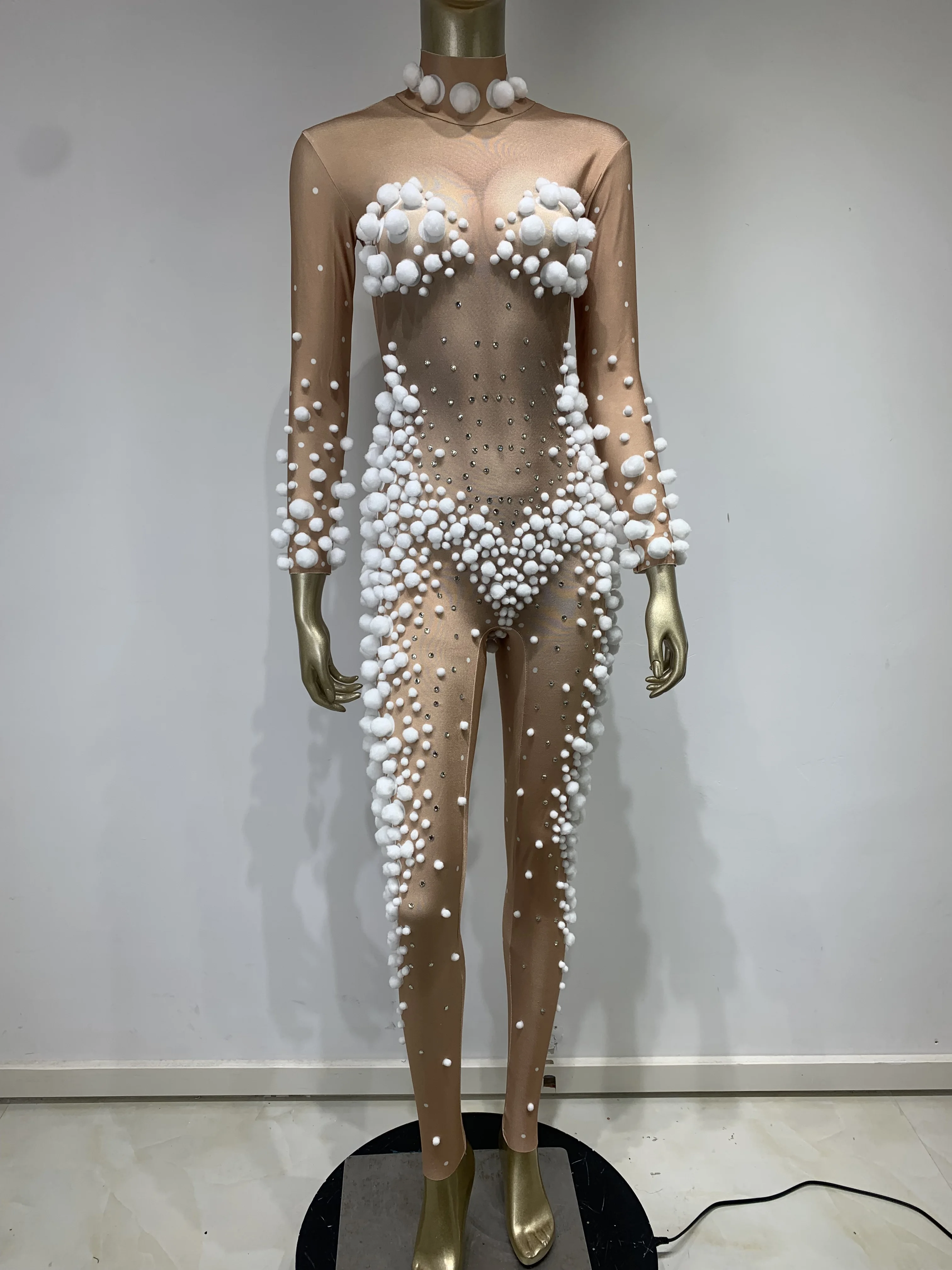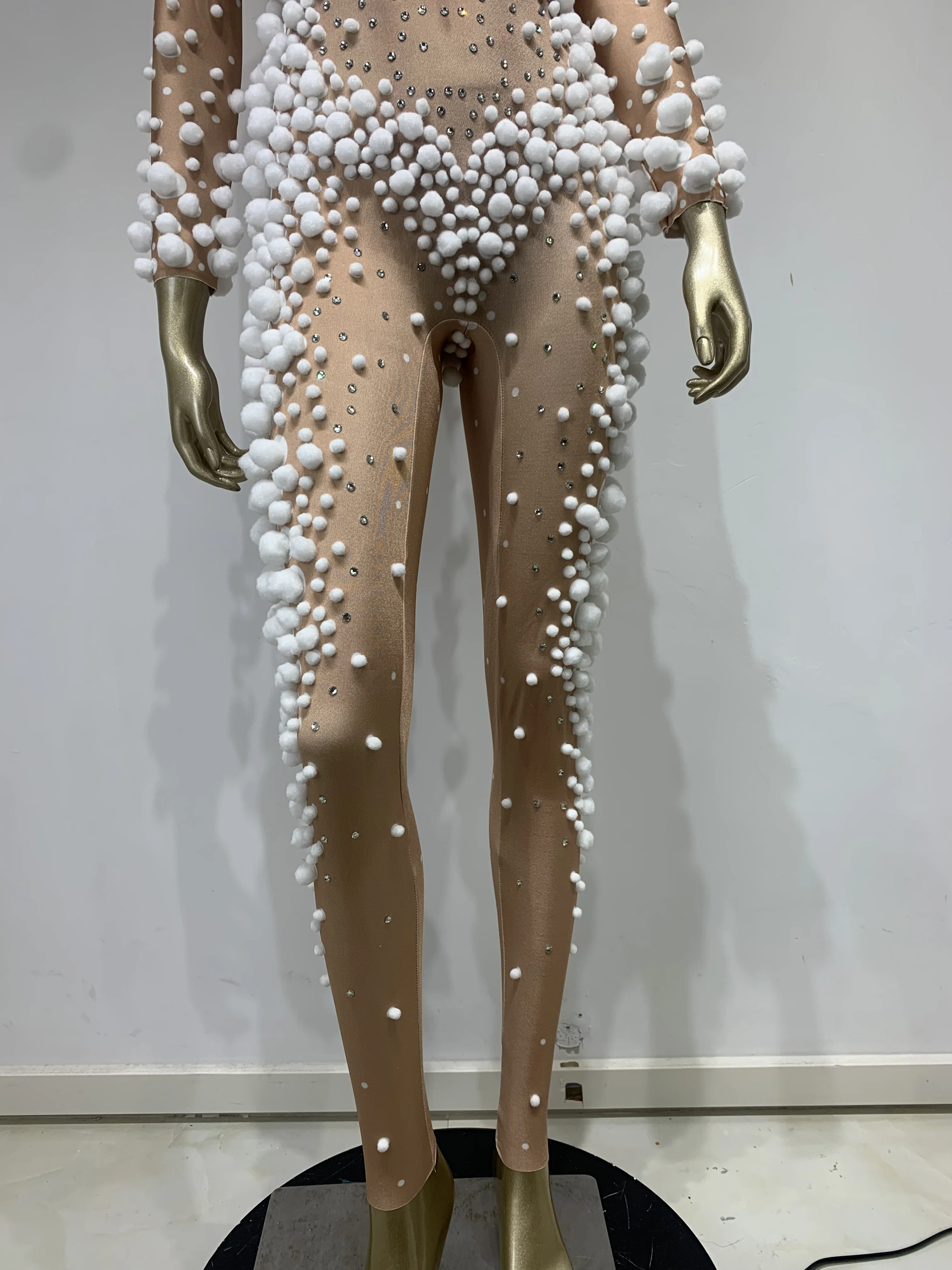 Women Skin Tone Diamond Studded Wool Ball Stretch Tight Jumpsuit Bar Nightclub DJ Female Singer Stage Performance Clothing