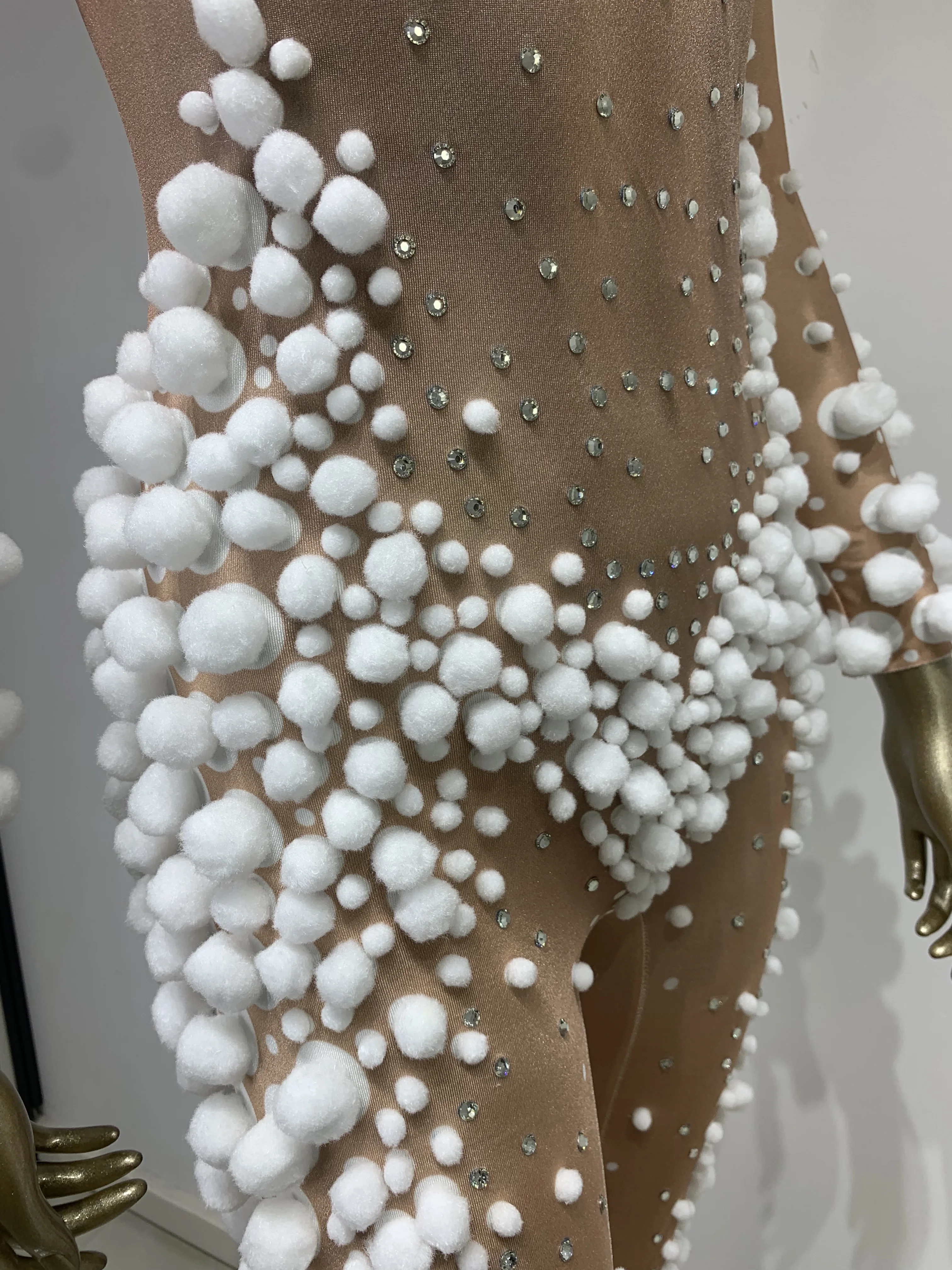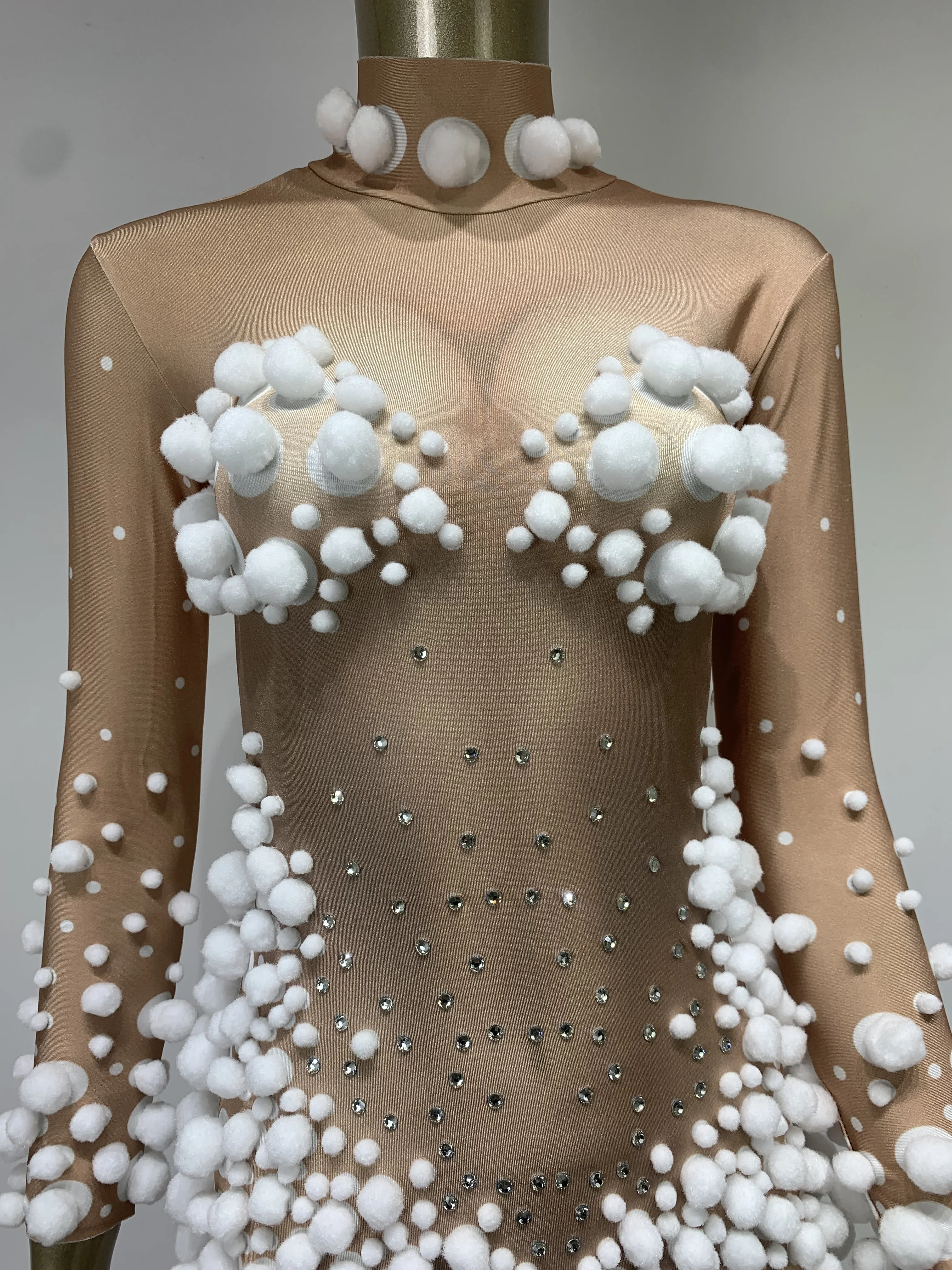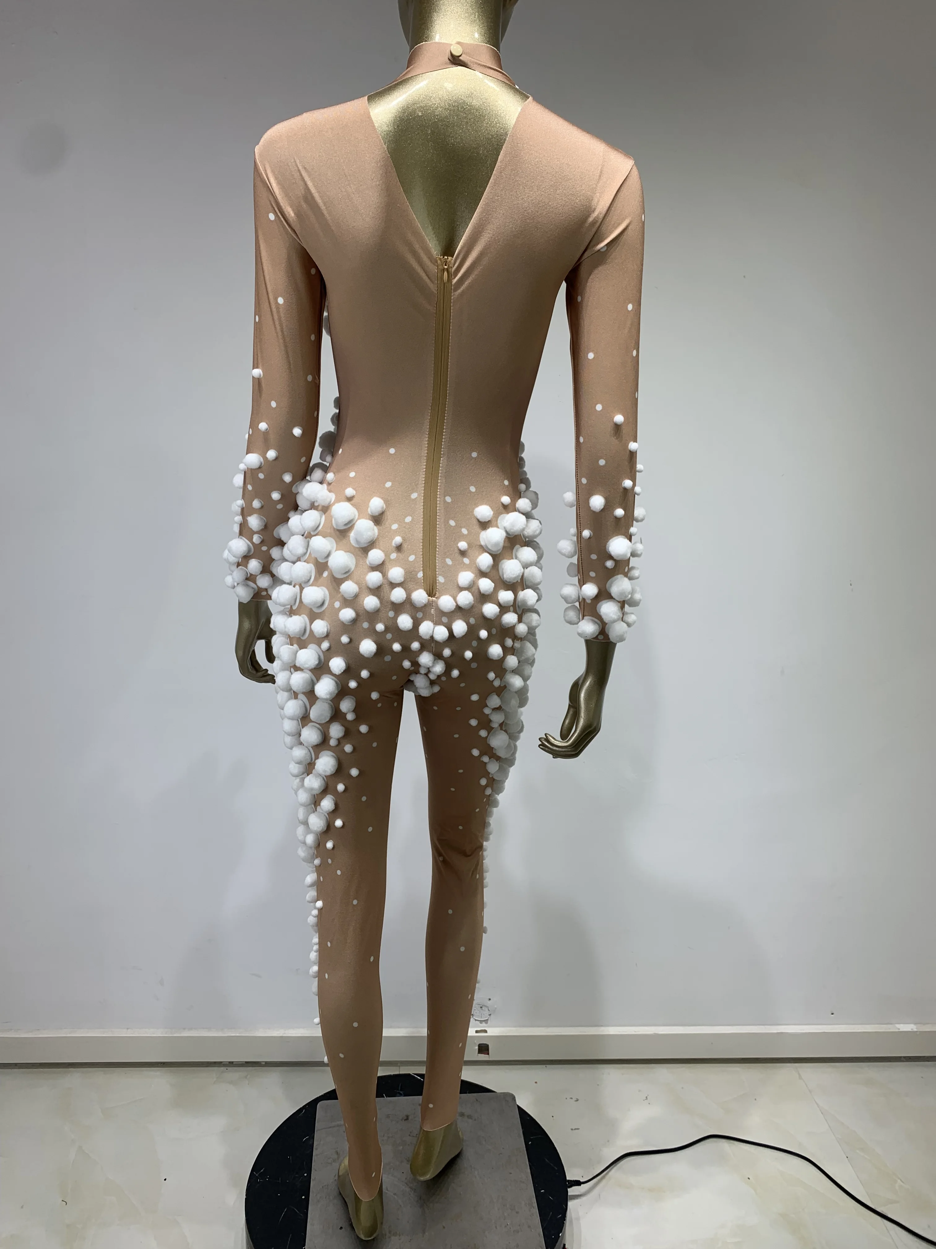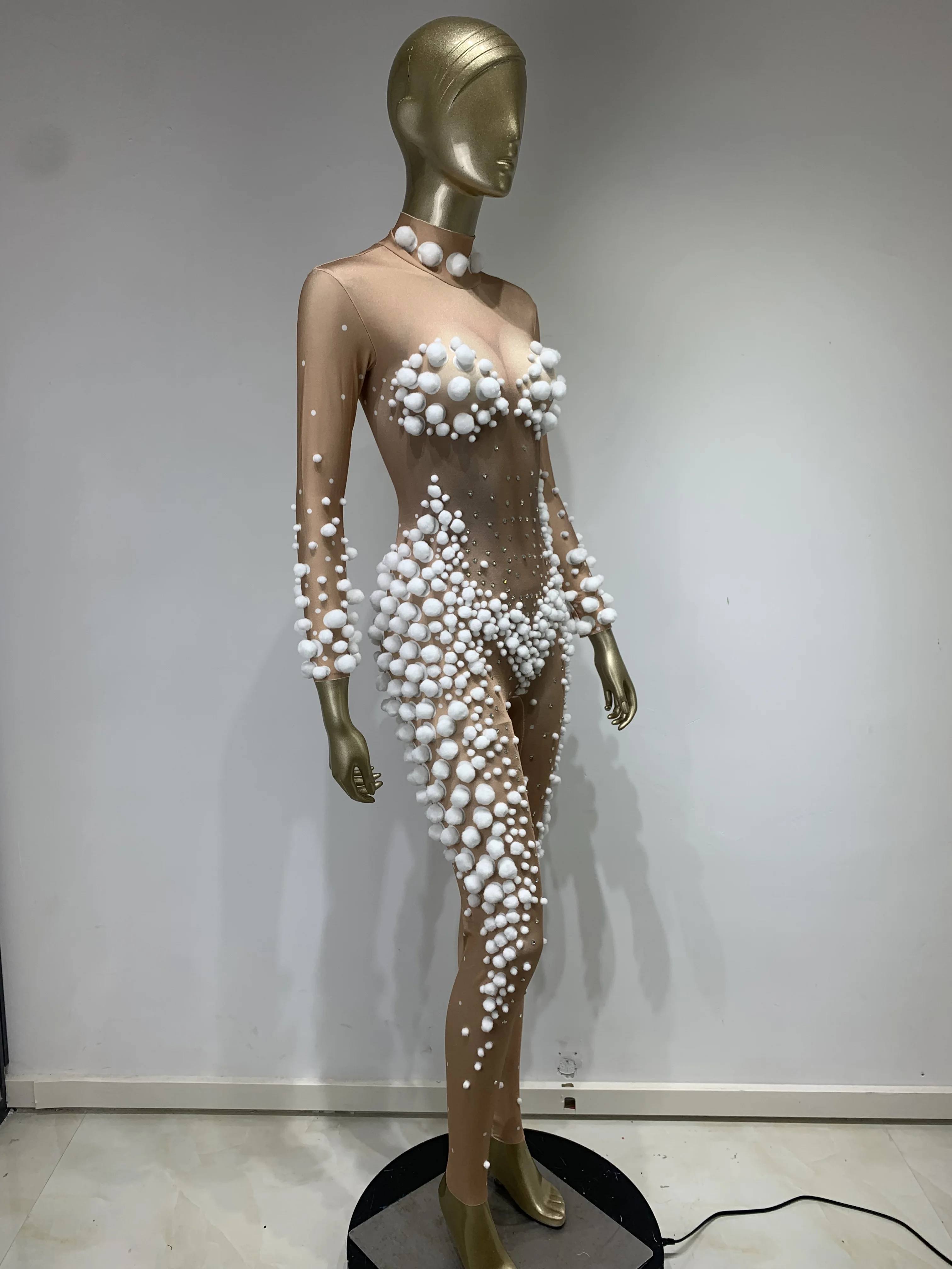 Women Skin Tone Diamond Studded Wool Ball Stretch Tight Jumpsuit Bar Nightclub DJ Female Singer Stage Performance Clothing