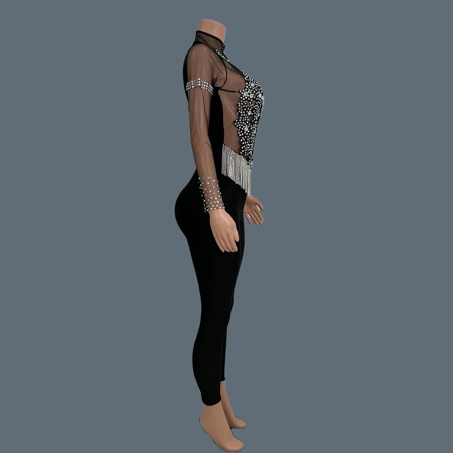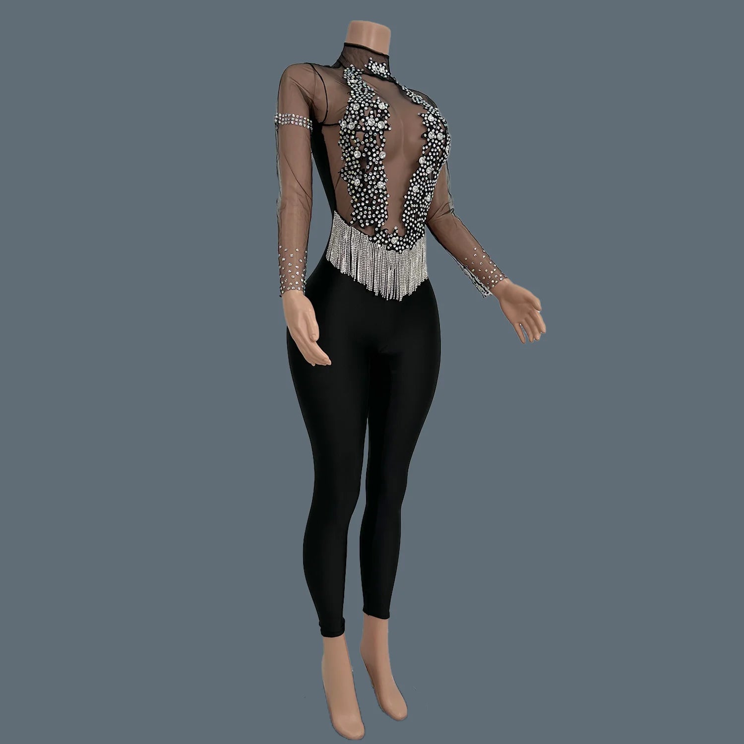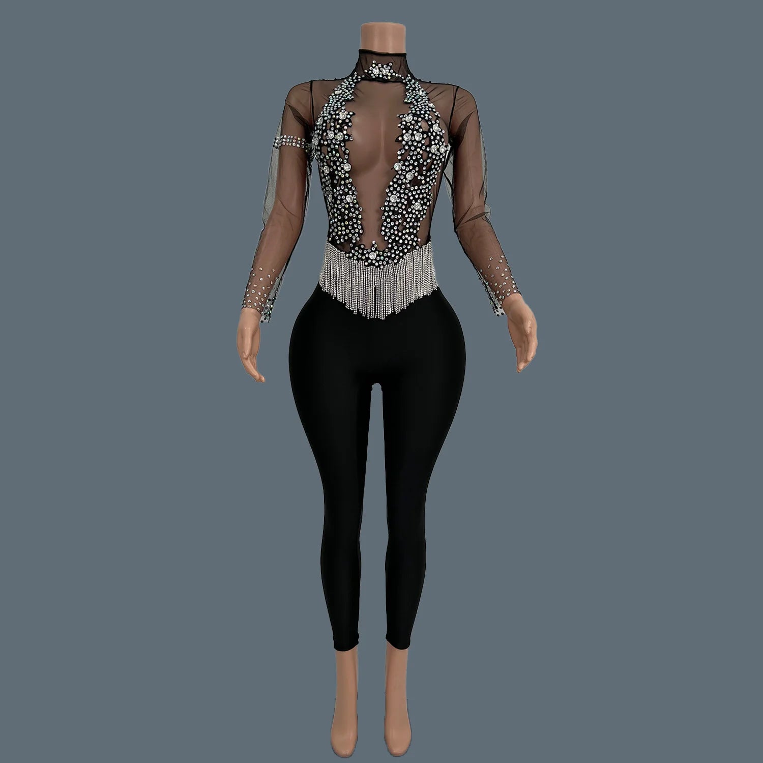 Introducing our Women’s Sparkly Rhinestones Jumpsuit, a luxurious black outfit that is the perfect choice for evening parties, birthdays, and stage performances. This stunning jumpsuit is crafted from lightweight mesh material, ensuring comfort and breathability while you dance the night away. Embellished with dazzling rhinestones, it adds a touch of glamour to your look, making it an ideal garment for those who want to stand out at any event. Embrace elegance and sparkle in this fabulous jumpsuit, designed for unforgettable moments!
