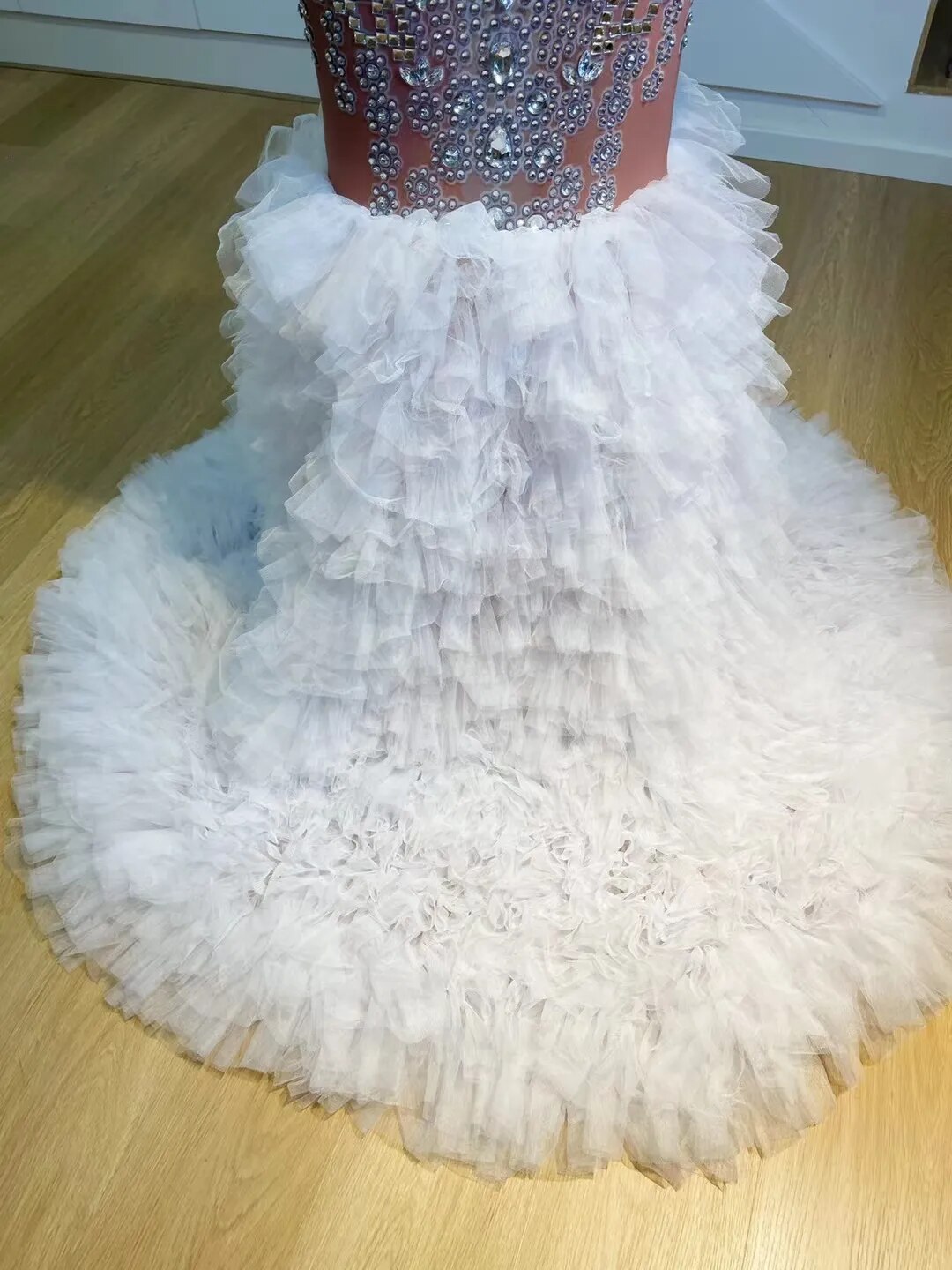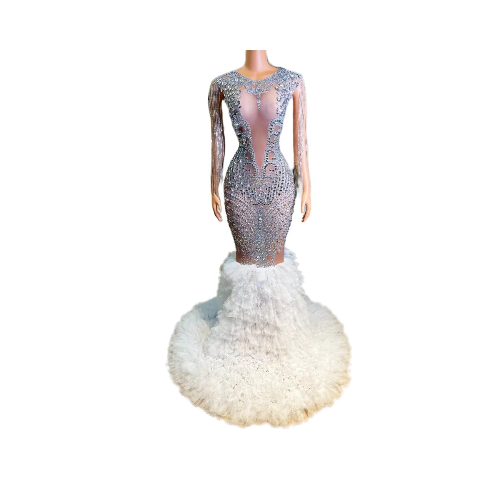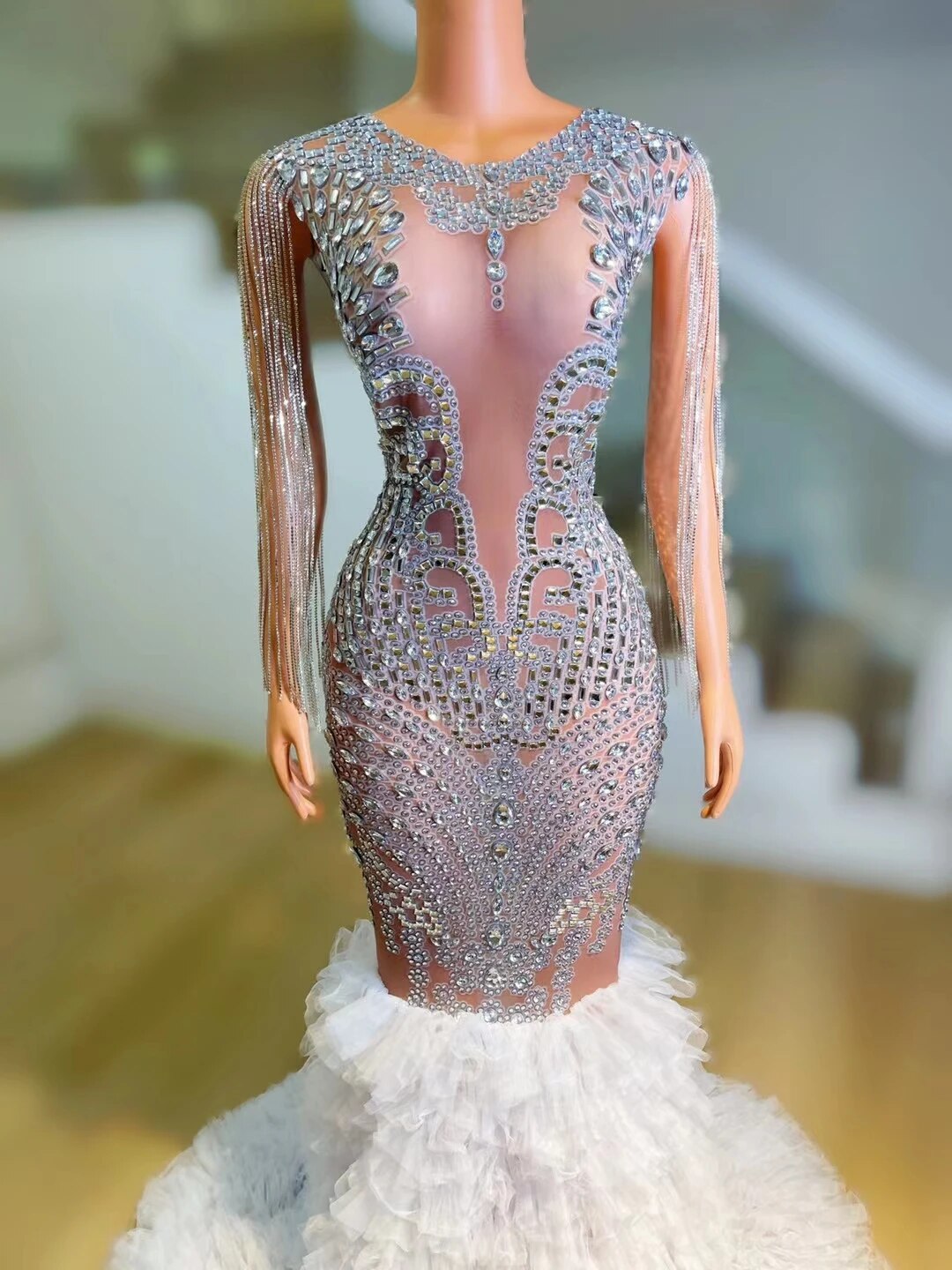Women Sparkly Silver Rhinestones ChainsFringes Transparent Long Train Dress EveningBirthday Celebrate Costume Prom Party Dress