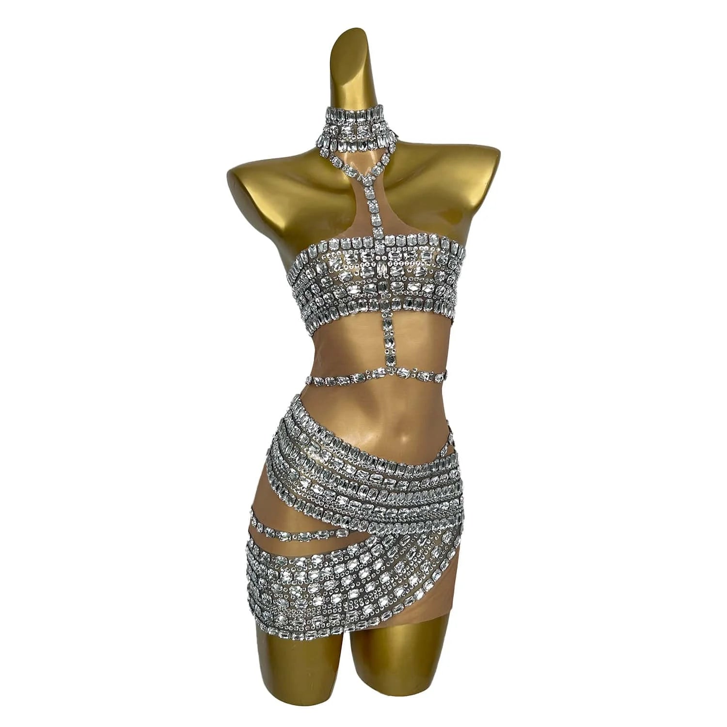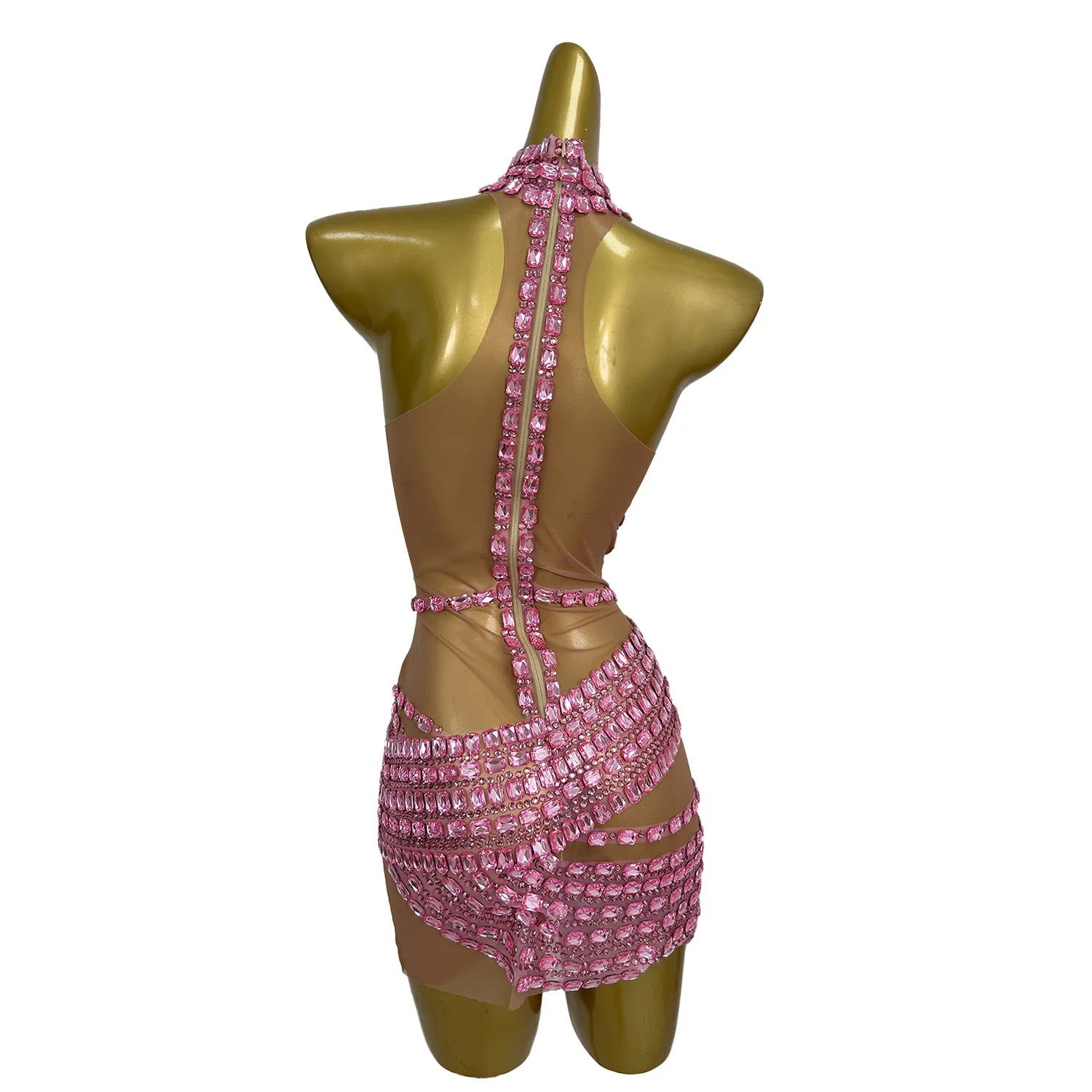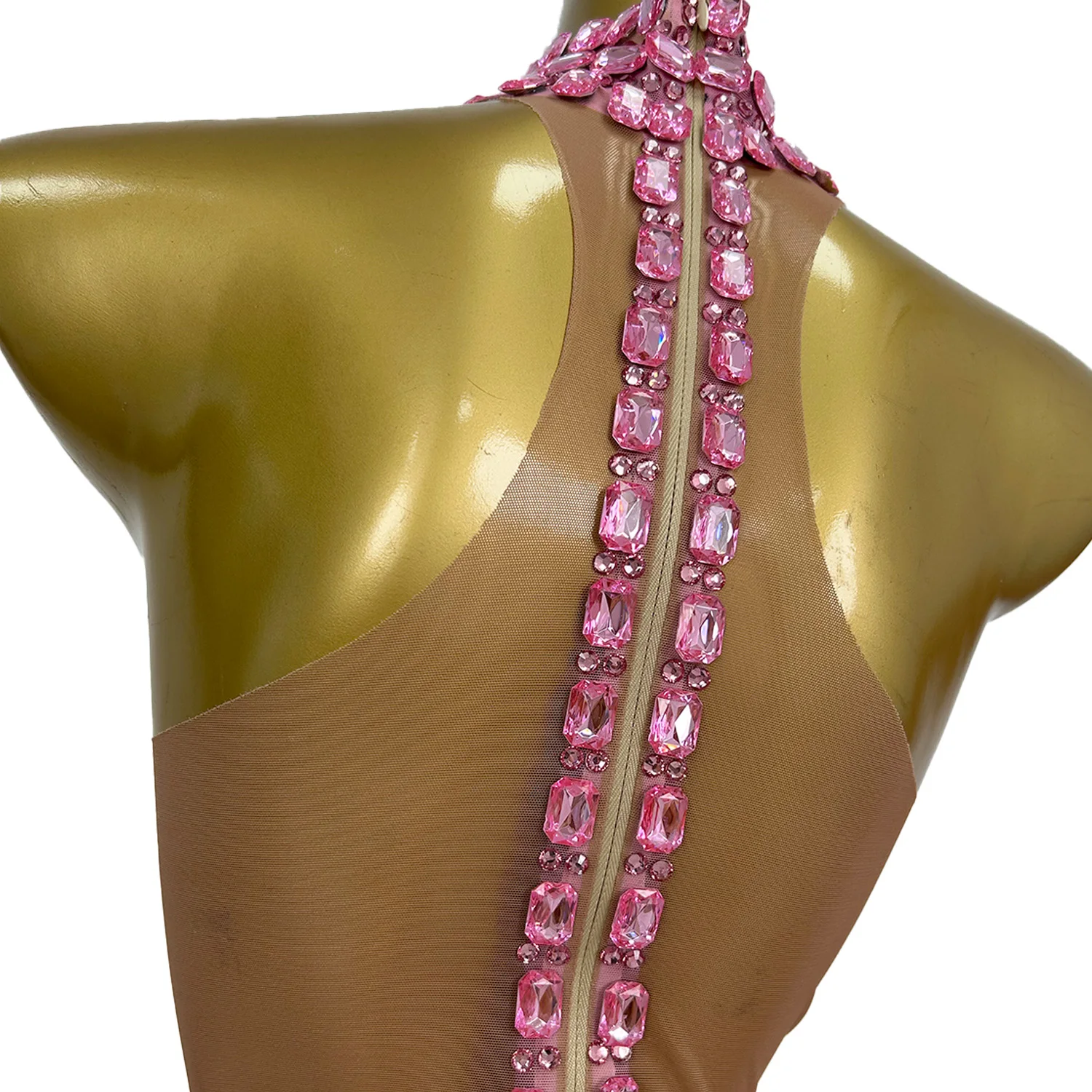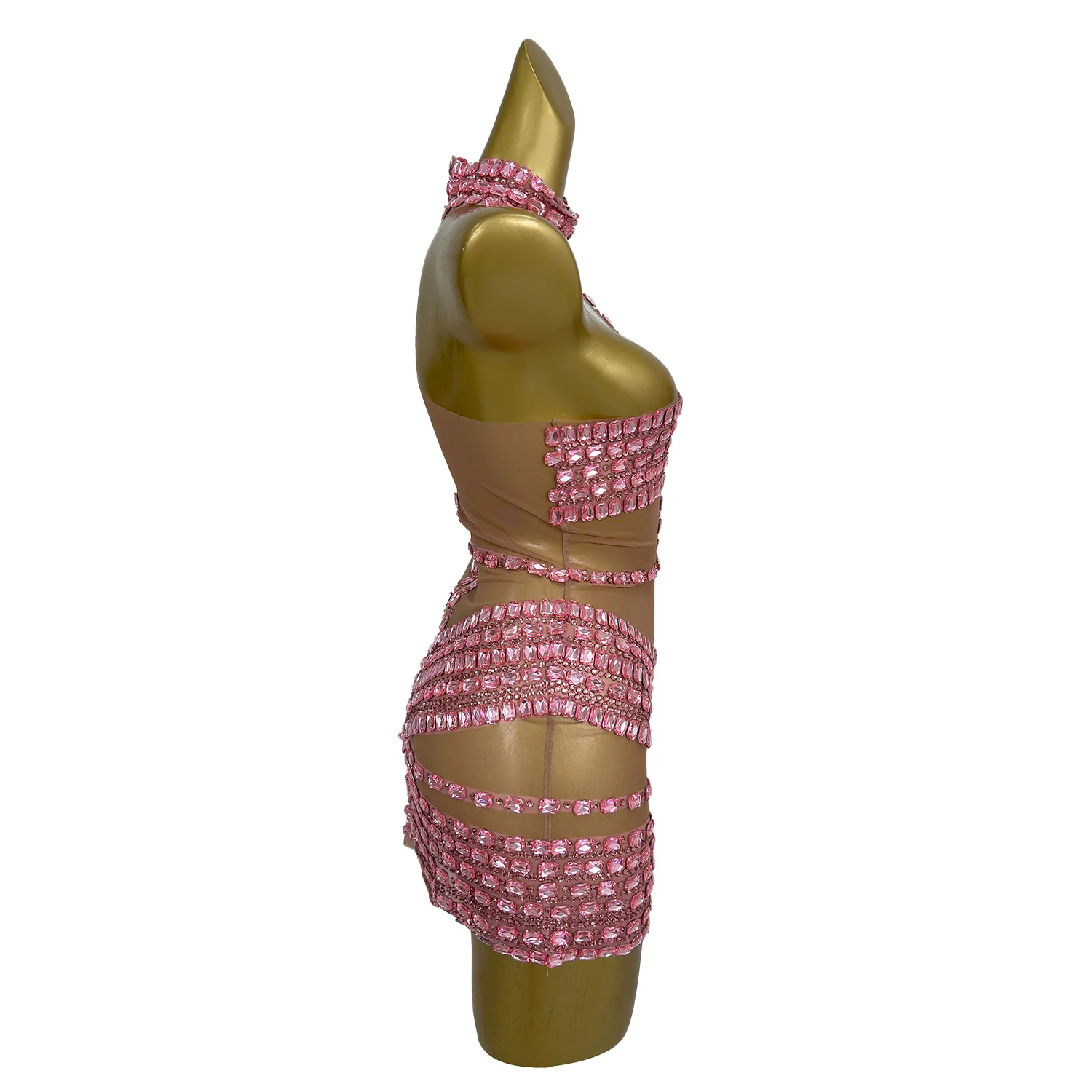 Women Strapless Neck Hanging Dress Pink Diamond Wrapped Skirt Sexy Illusion Banquet Dress Stage Performance Costume Fangtang