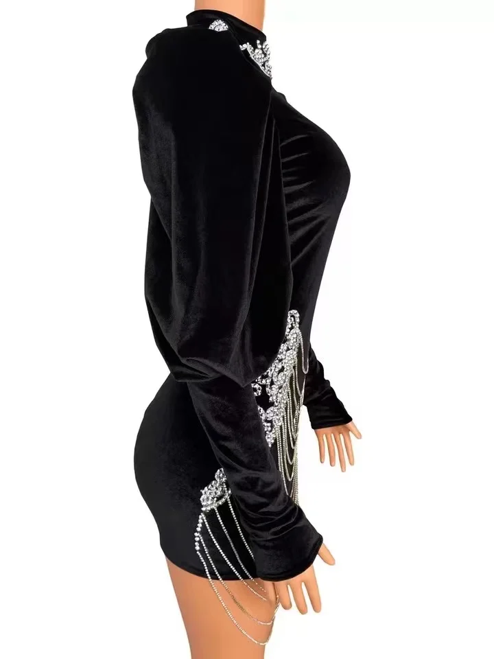 Women Turtleneck Luxury Summer Clothing Sparkle Crystal Diamond Short Dress Elegant Beaded Club Wear Black Gown