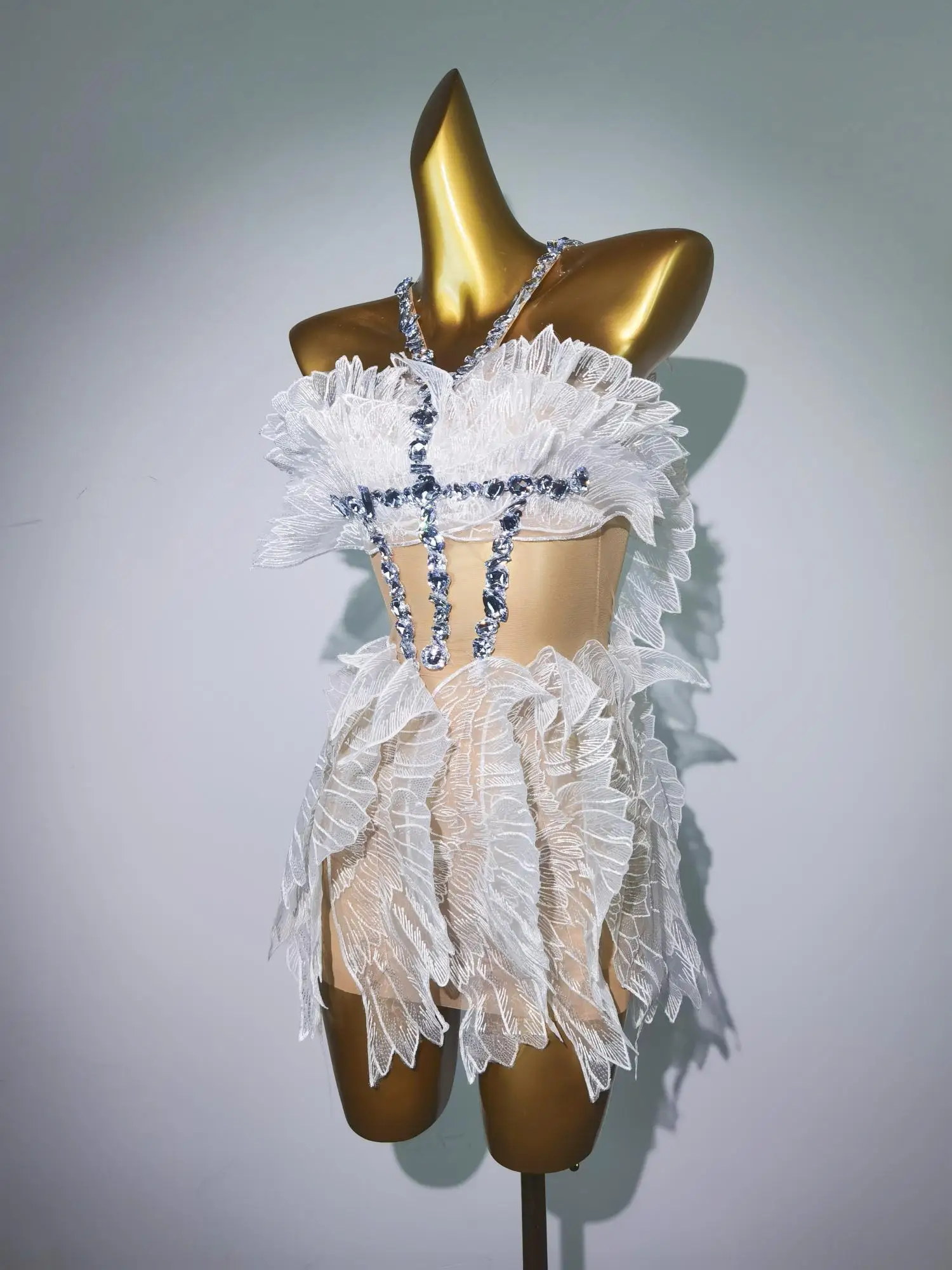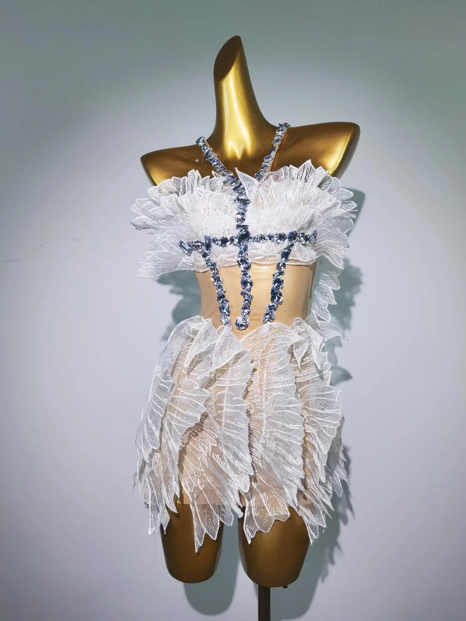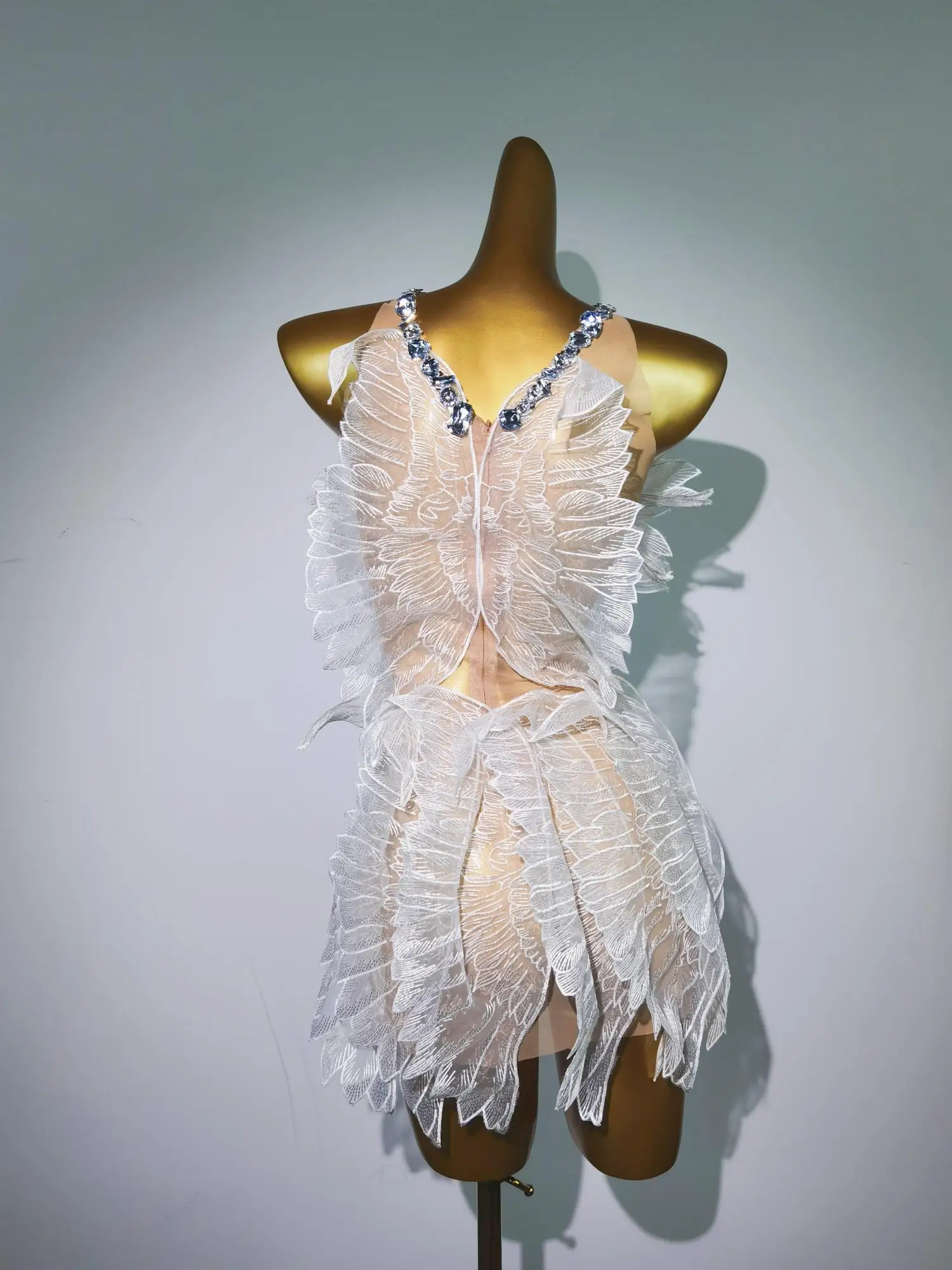 Women White Gold Crystal Transparent Wings Mini Dress Sexy Bar Nightclub Party Singer Stage Performance Costume Baichan