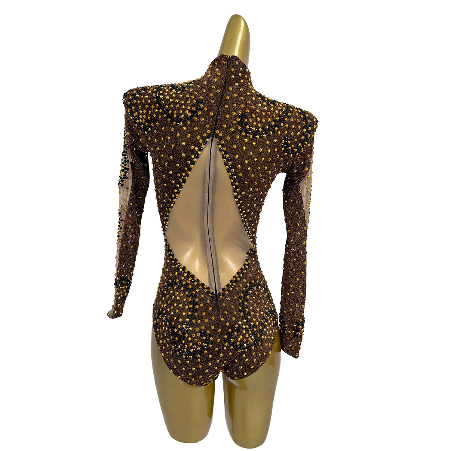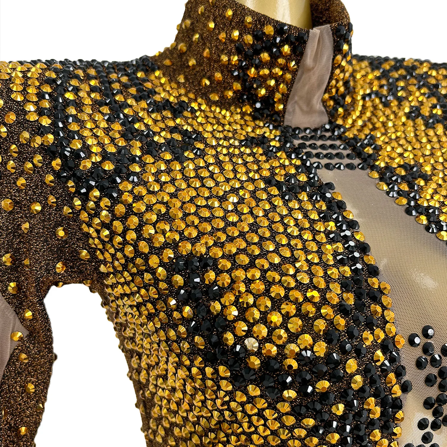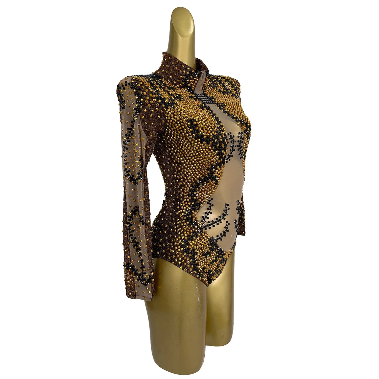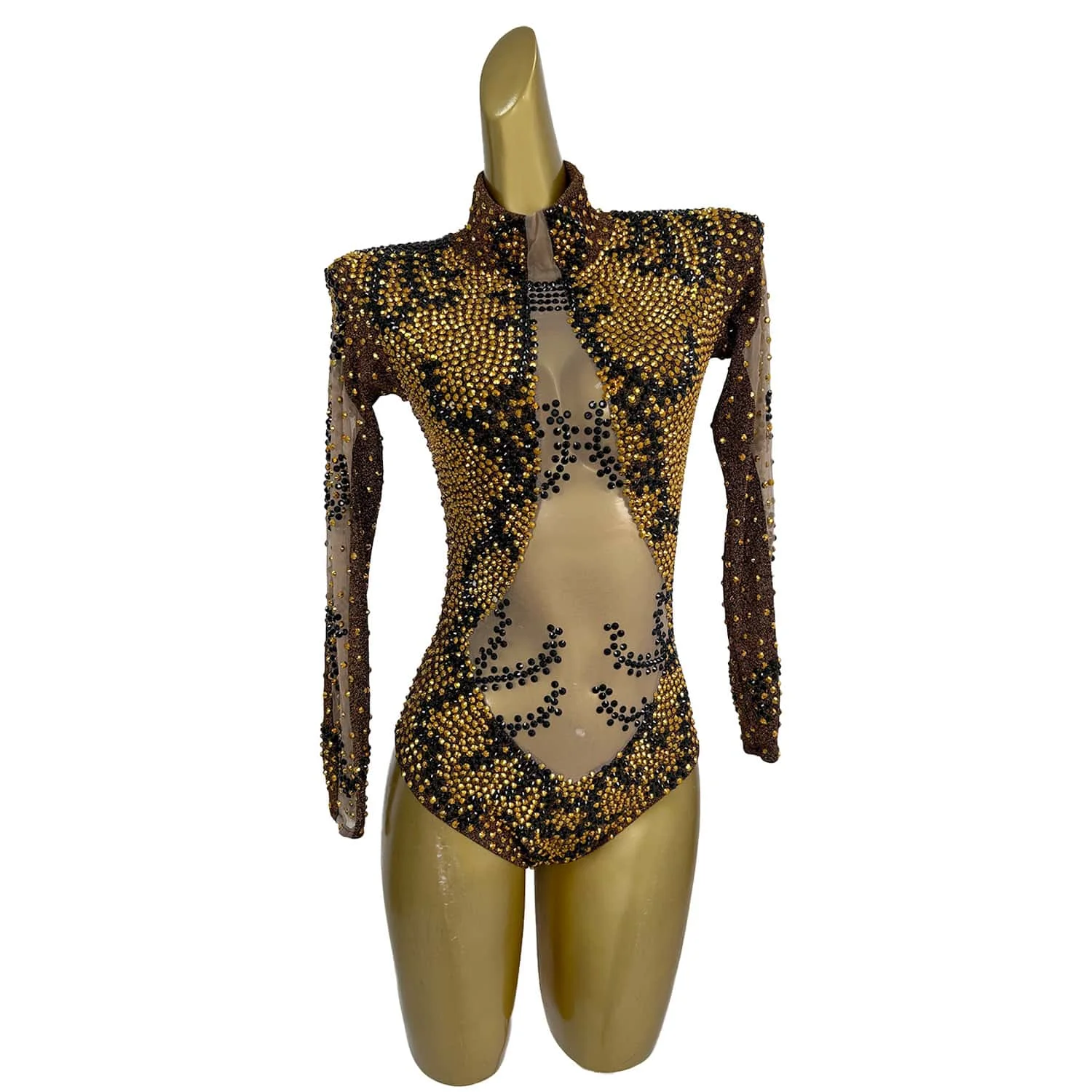 Women's Long Sleeved Jumpsuit Black Gold Heavy Bead Chiffon Sheer Bodysuit Top Beach Pool Party Costume Dance Dress Tuhaojin