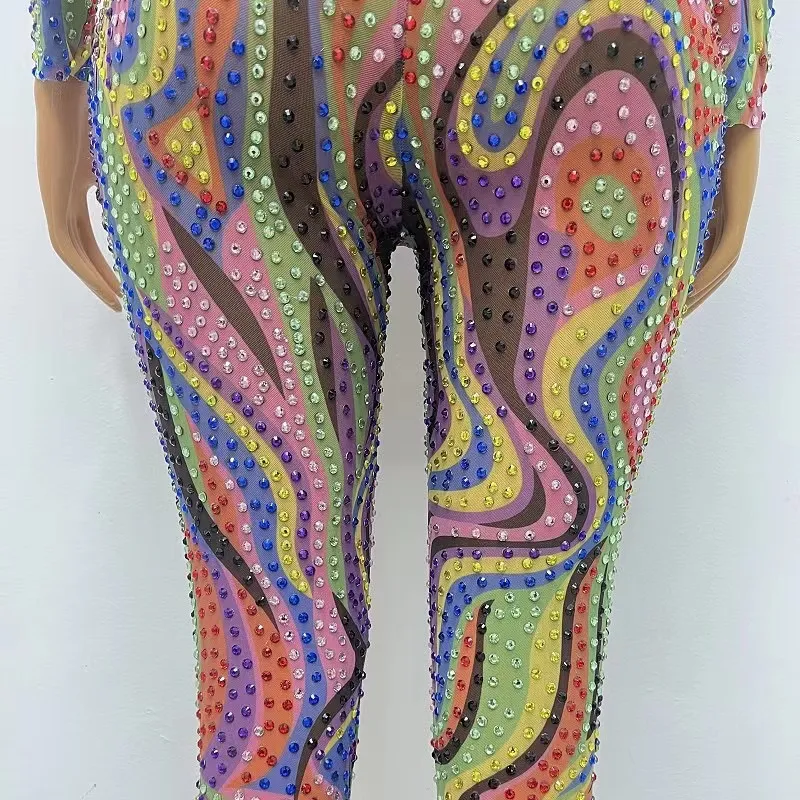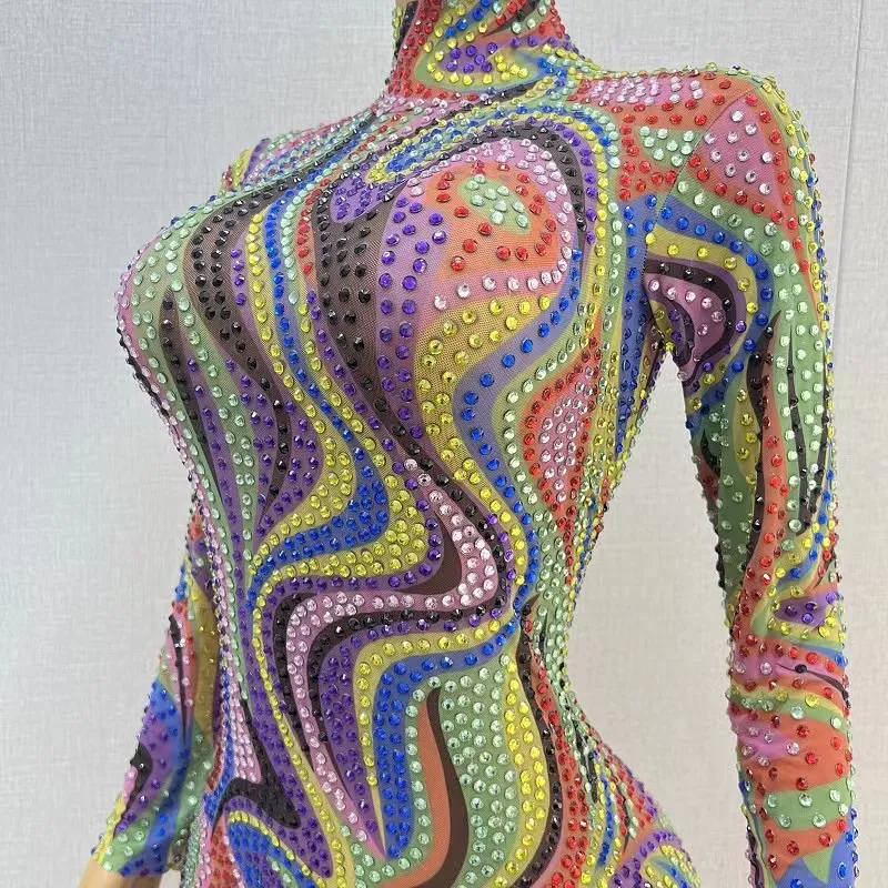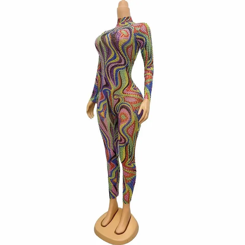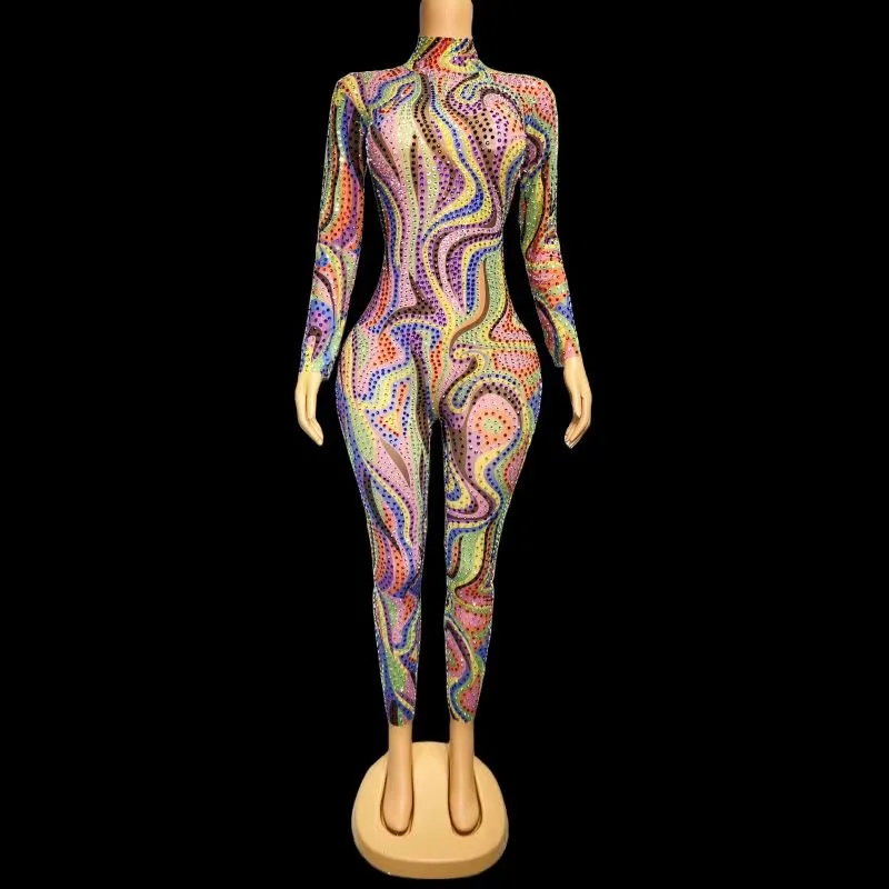 Women'S Party Festival Outfit Rainbow Rhinestones Jumpsuit Long Sleeved Stretch Clothes Stage Dance Wear Drag Queen Costume BLK
