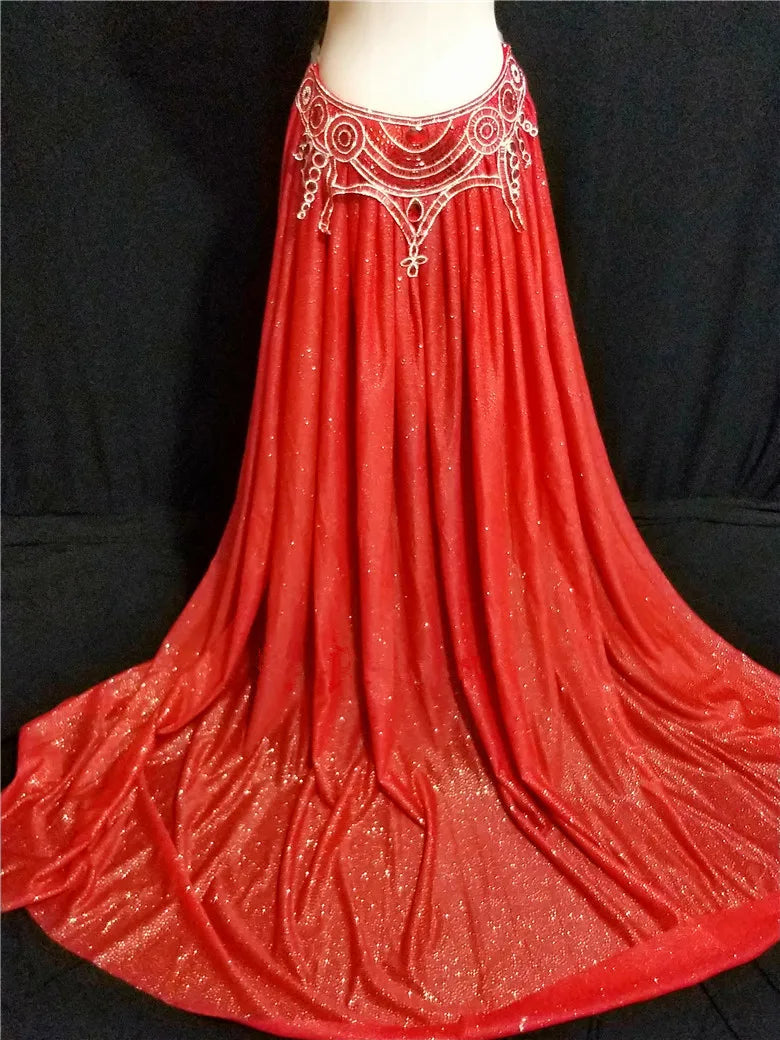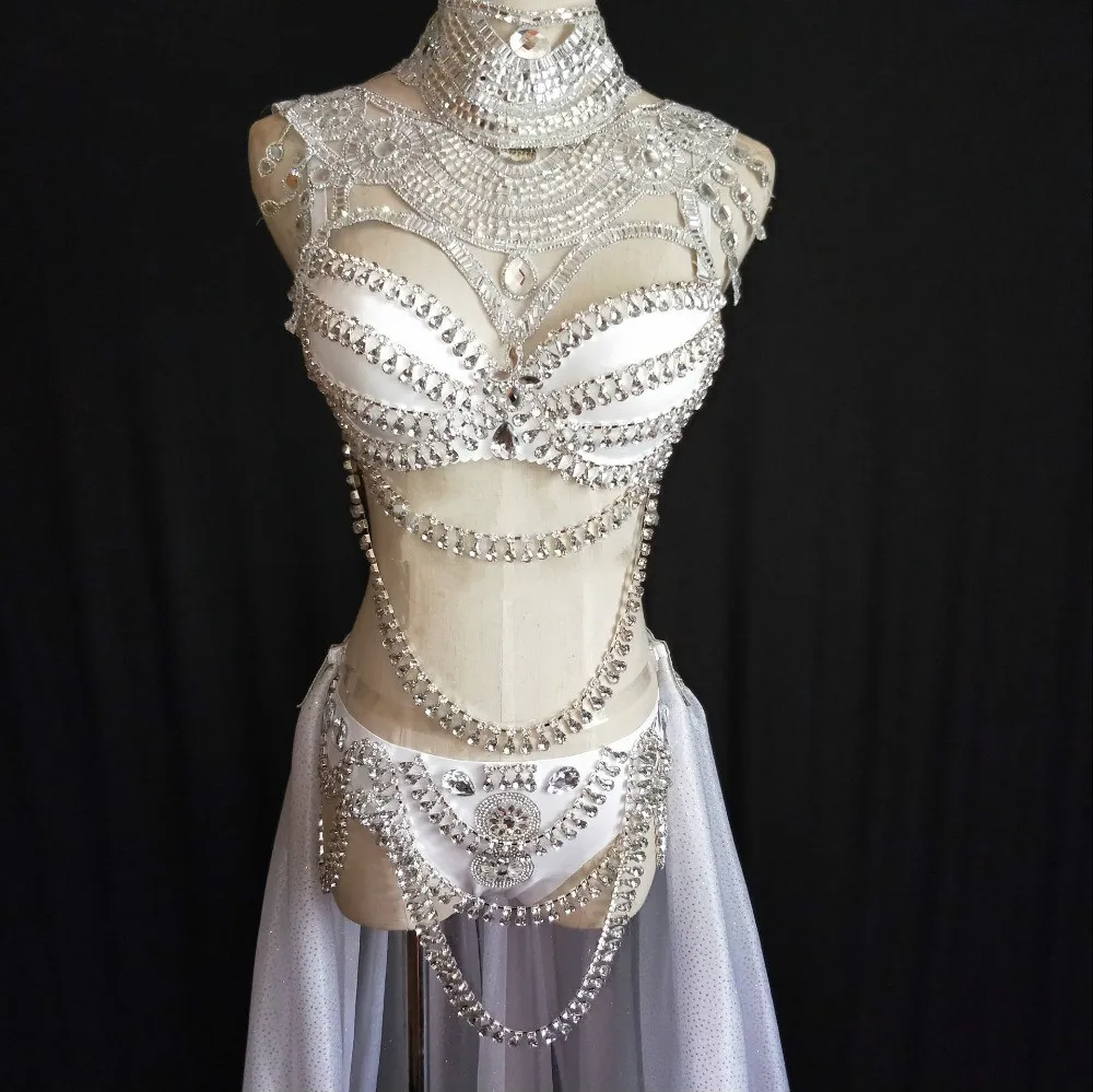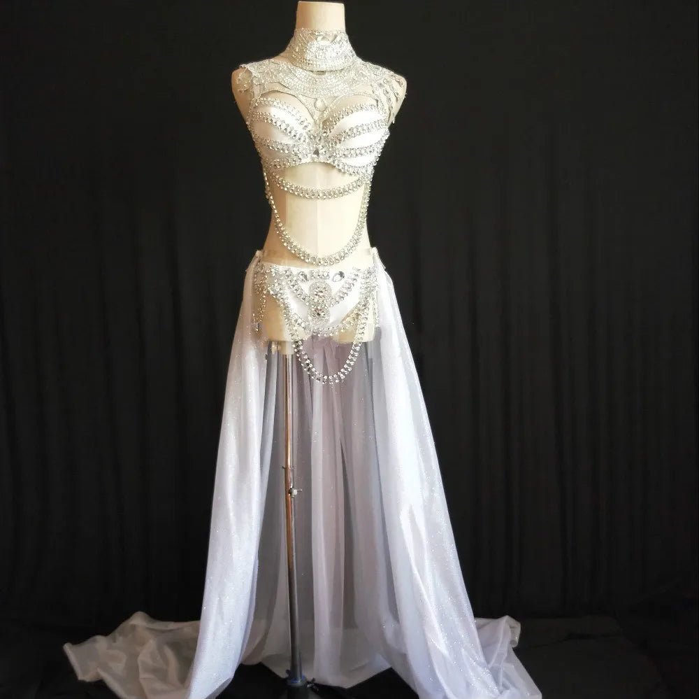 Women's White Red Gold Rhinestones Bikini Long Trailing Skirt Set Singer Host Stage Outfit Model Catwalk Performance Costume