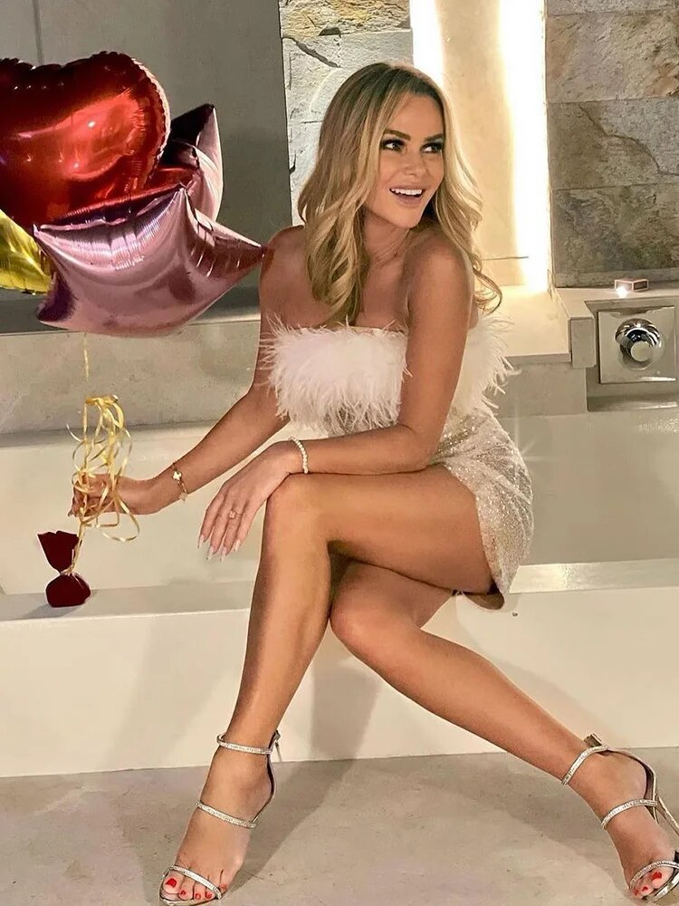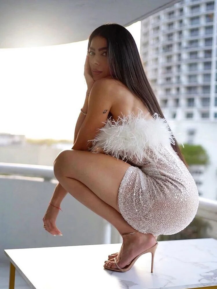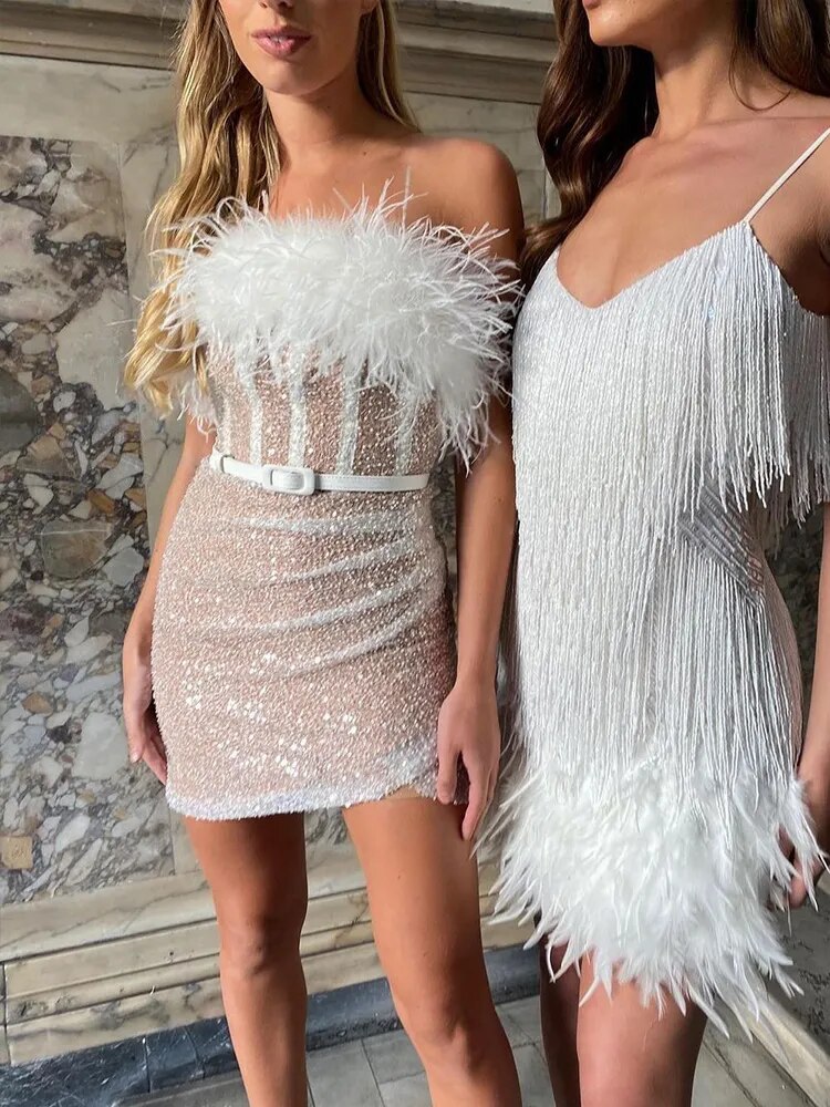 Y2K Furry Sequins Off The Shoulder Evening Prom Mini Dress Women Slim Skims Patchwork Bodycon Chic Elegant Dresses