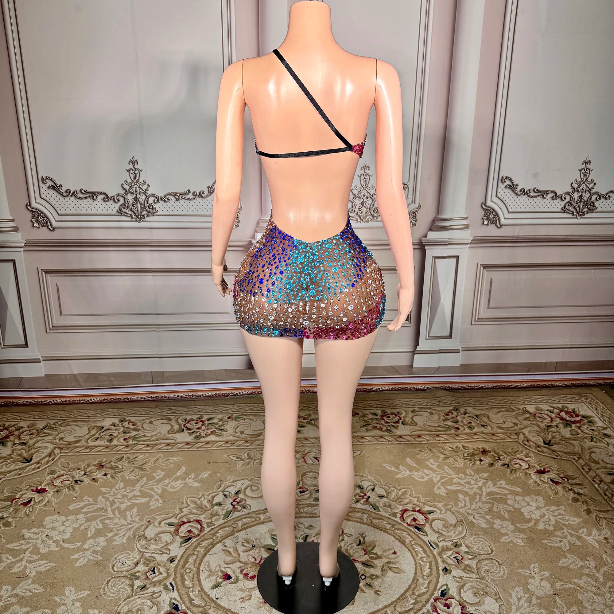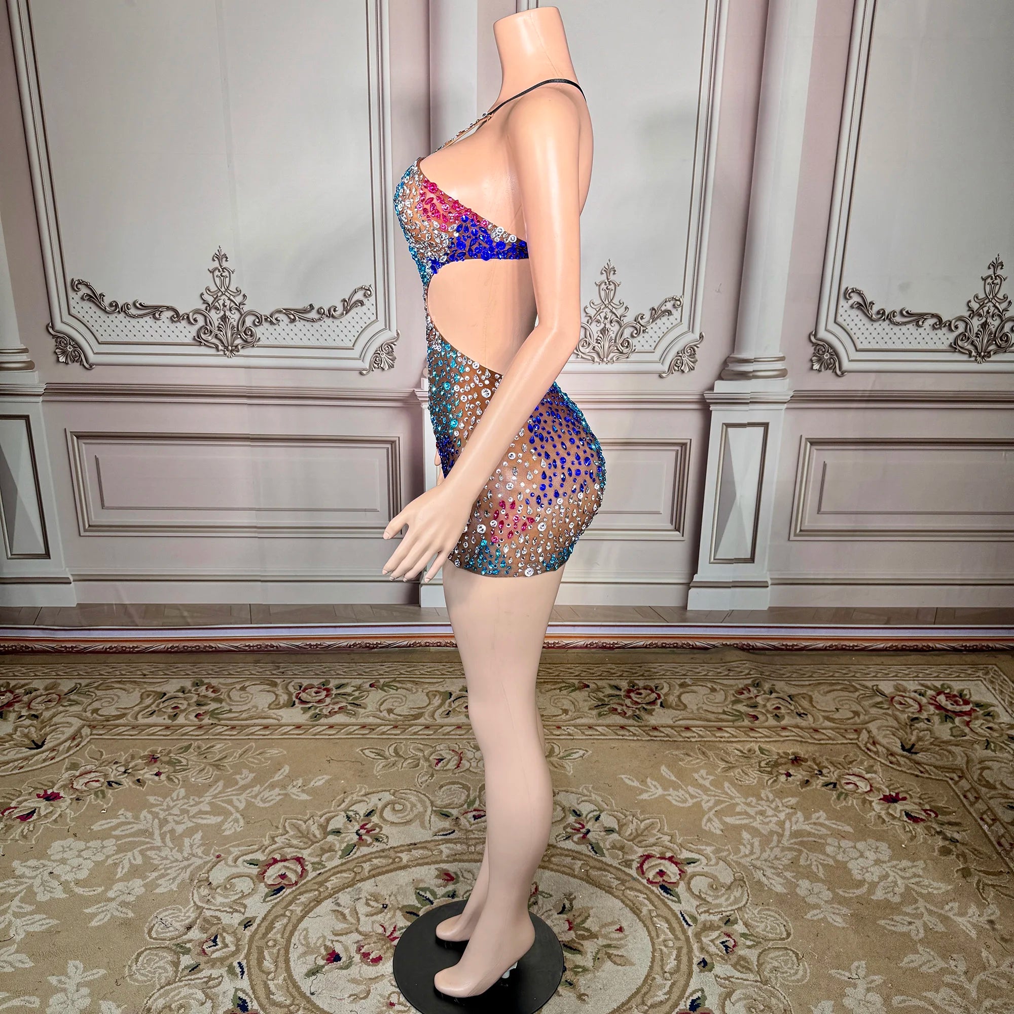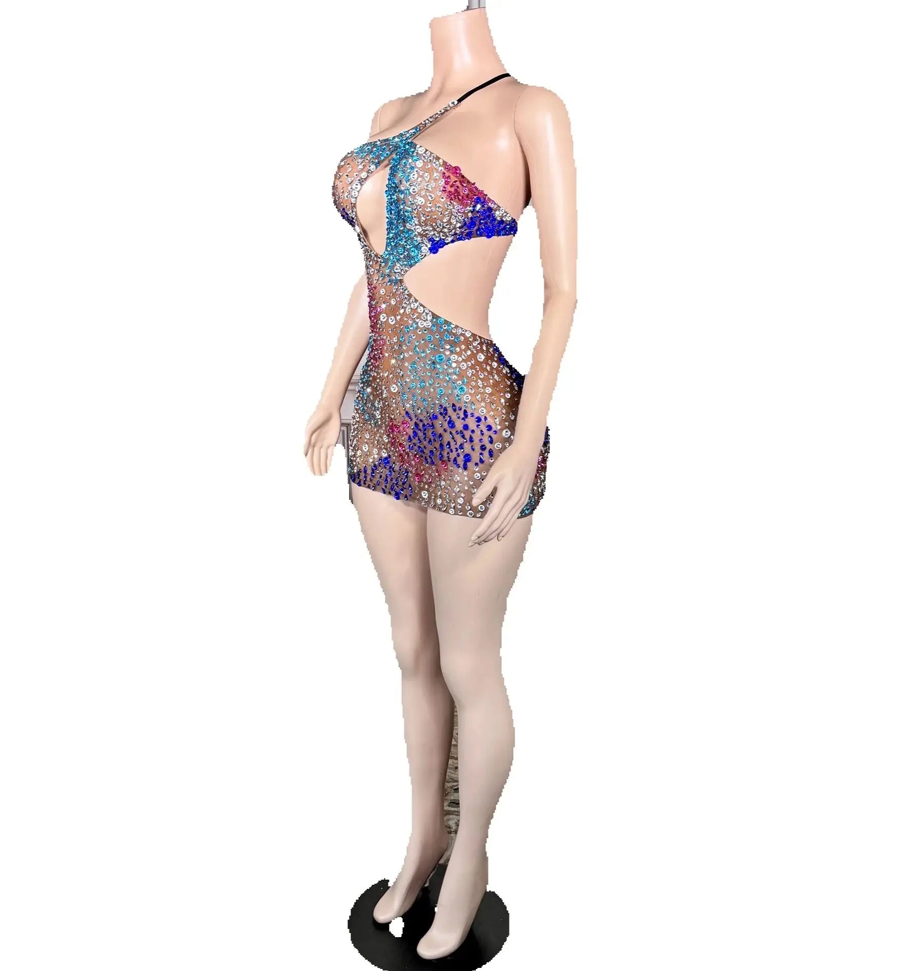 Shine like a mirror in this Sexy Transparent Rhinestone Mini Dress. Crafted to catch every light source, the dress pairs sheer mesh with densely applied rhinestones to produce a high‑impact reflective surface that reads brilliantly in photos and on stage. The sleeveless halter or tank silhouette emphasizes the shoulders and arms while the mini length showcases the legs for a flirty, confident look.